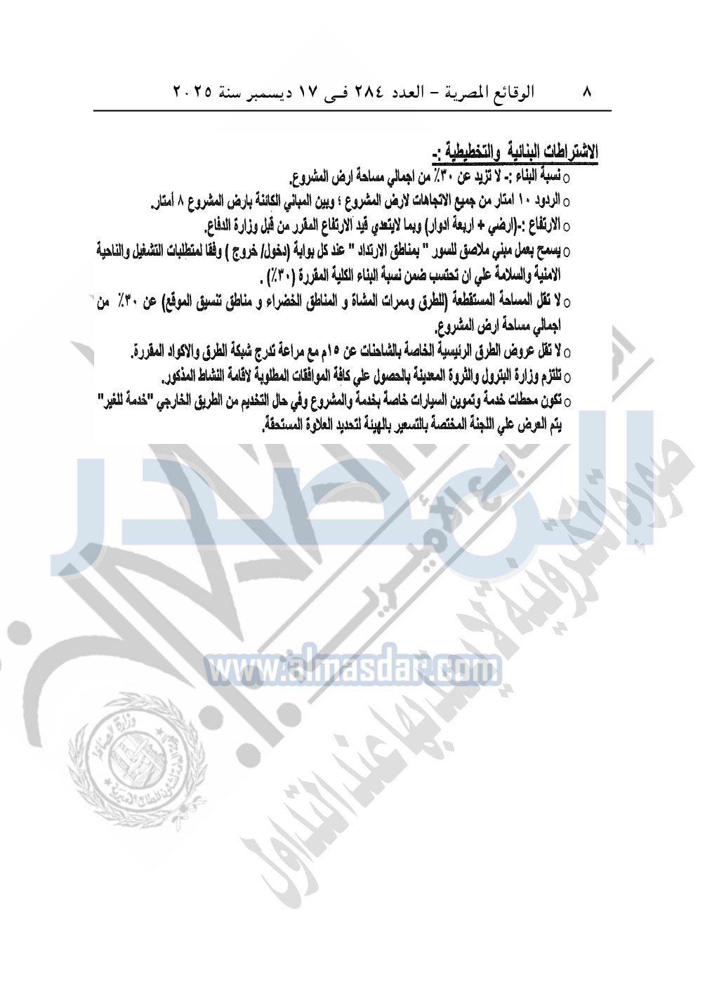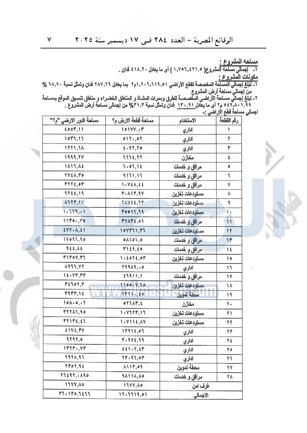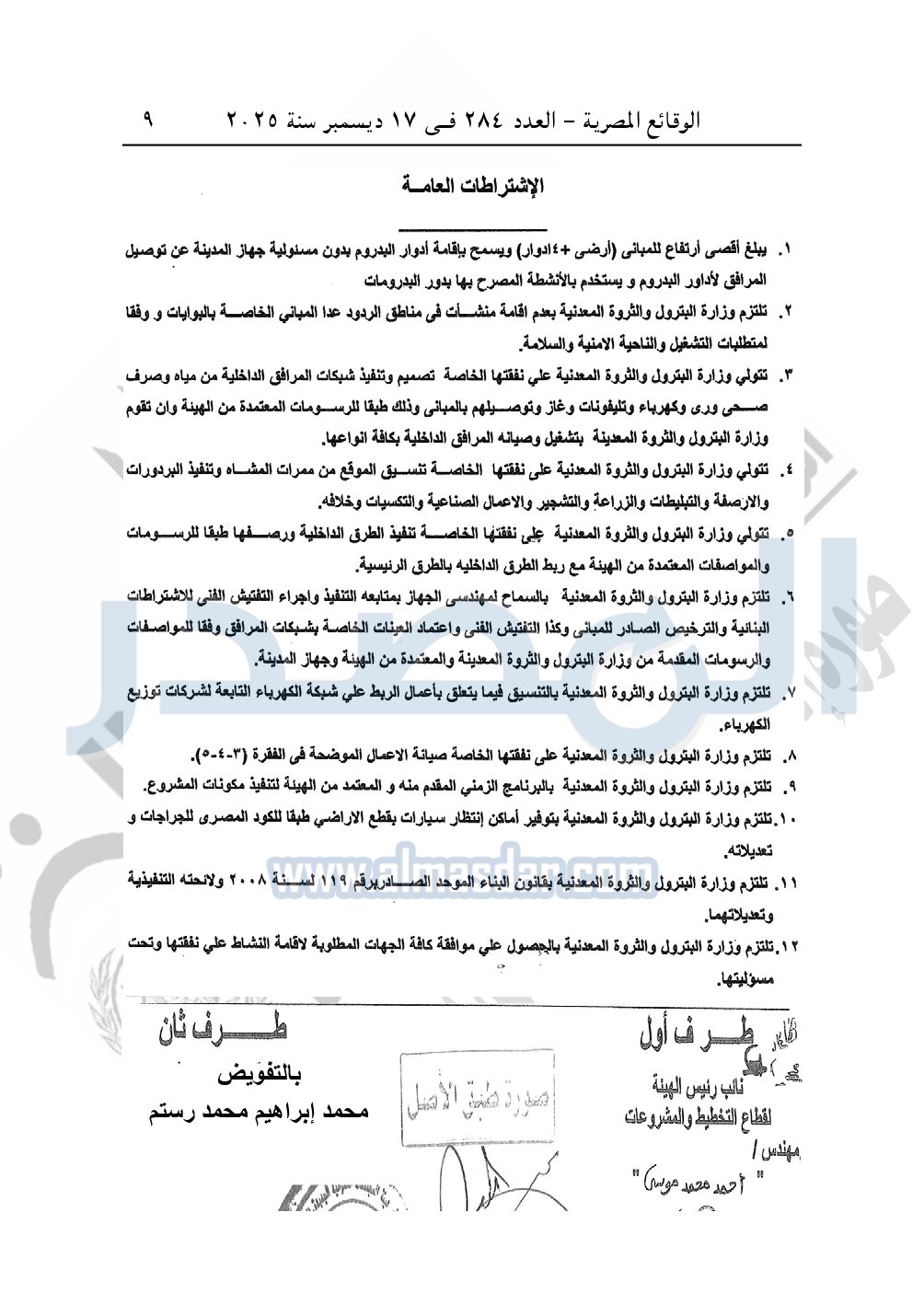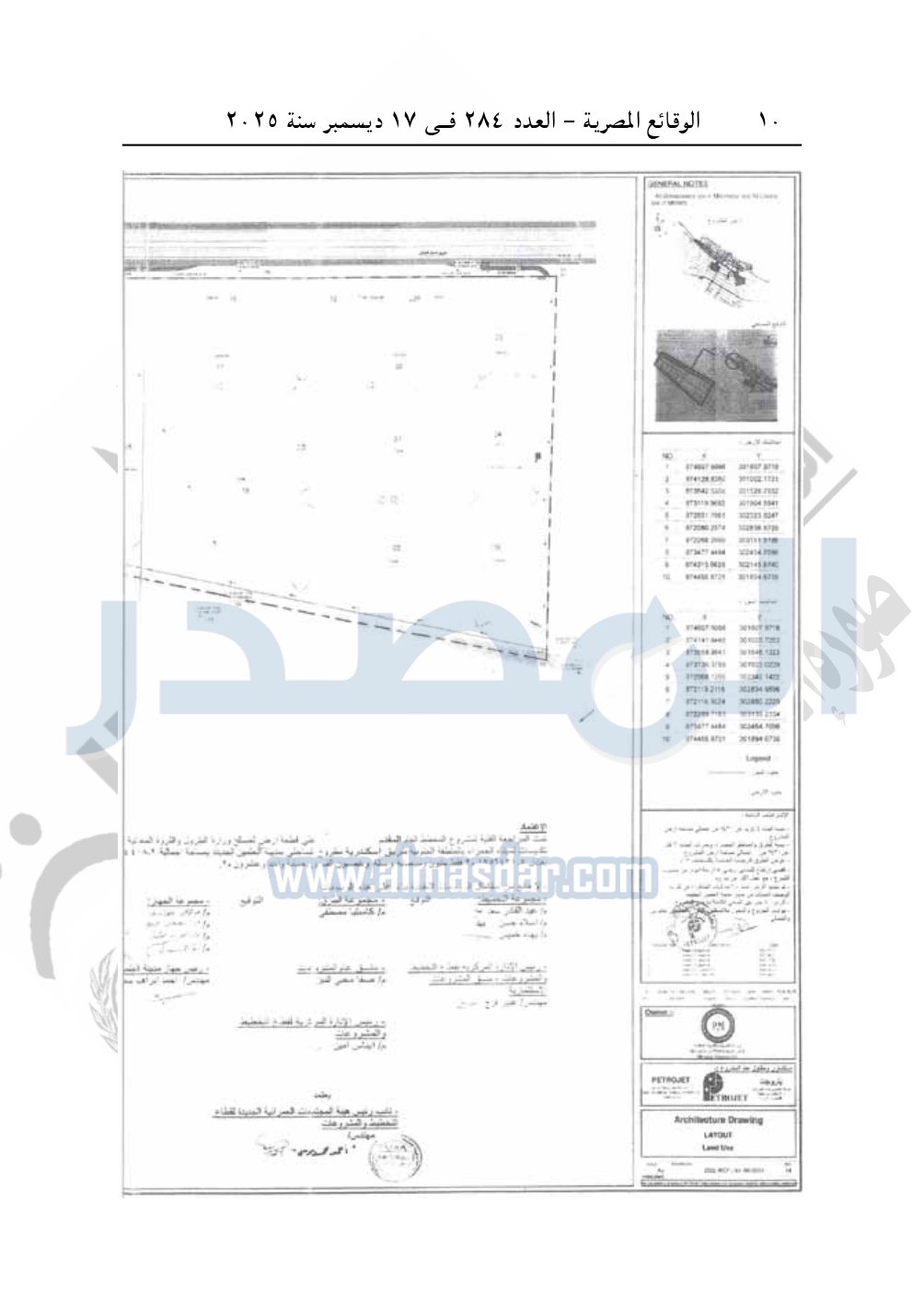 نشرت الوقائع المصرية، في العدد 284، الصادر في 17 ديسمبر سنة 2025، قرار وزارة الإسكان والمرافق والمجتمعات العمرانية، رقم 23 لسنة 2025، بتاريخ 6-1-2025، بشأن اعتماد تخطيط وتقسيم قطعة الأرض رقم "بدون" بمساحة 1756421.5م2 بما يعادل 418.2 فدان الكائنة بالمنطقة الجنوبية لطريق الإسكندرية مطروح الساحلى بمدينة العلمين الجديدة والمخصصة لوزارة البترول والثروة المعدنية لإقامة مشروع تكديسات لميناء الحمراء والمبرم بشأنها عقد البيع الابتدائى المؤرخ في 1-11-2022.