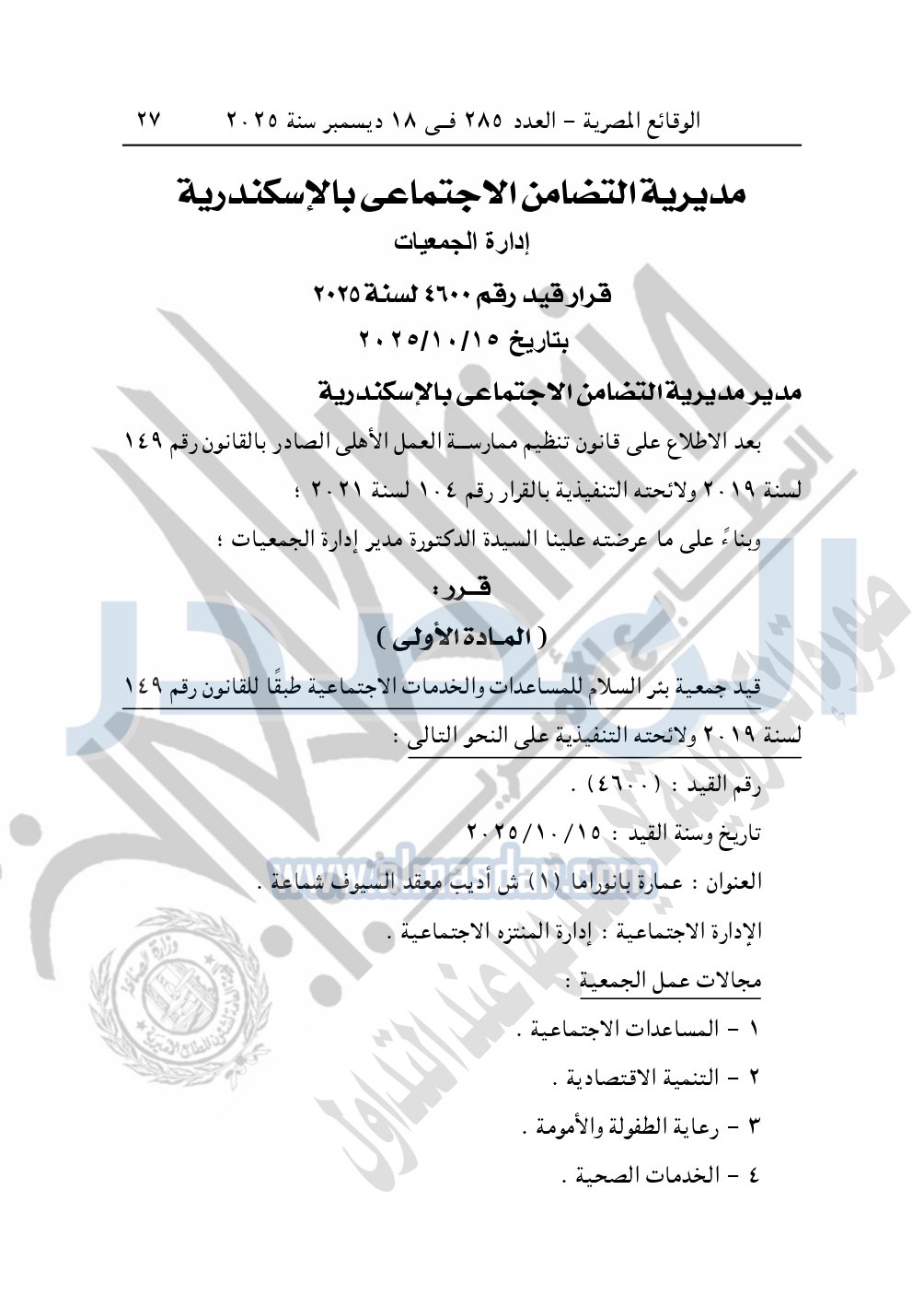 نشرت الوقائع المصرية في العدد 285، بتاريخ 18 ديسمبر 2025، قرار مديرية التضامن الاجتماعي بالإسكندرية، قيد 4600 لسنة 2025، بتاريخ 15-10-2025، بشأن قيد جمعية بئر السلام للمساعدات والخدمات الاجتماعية.