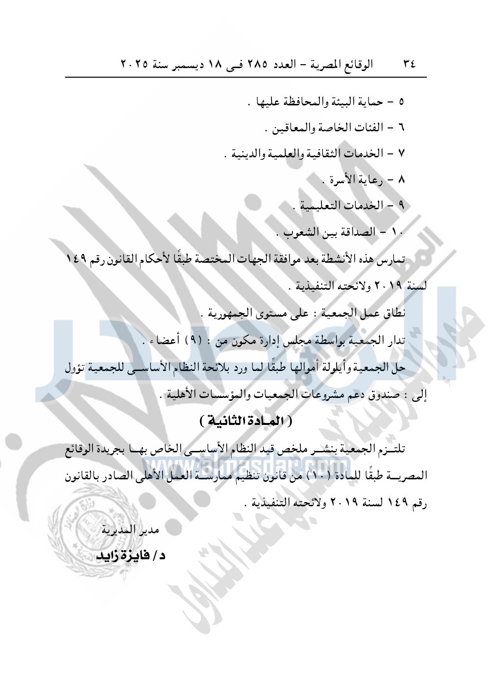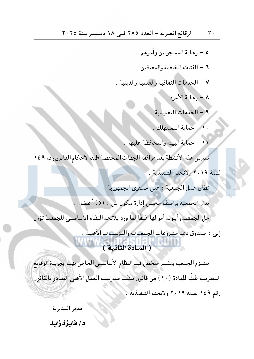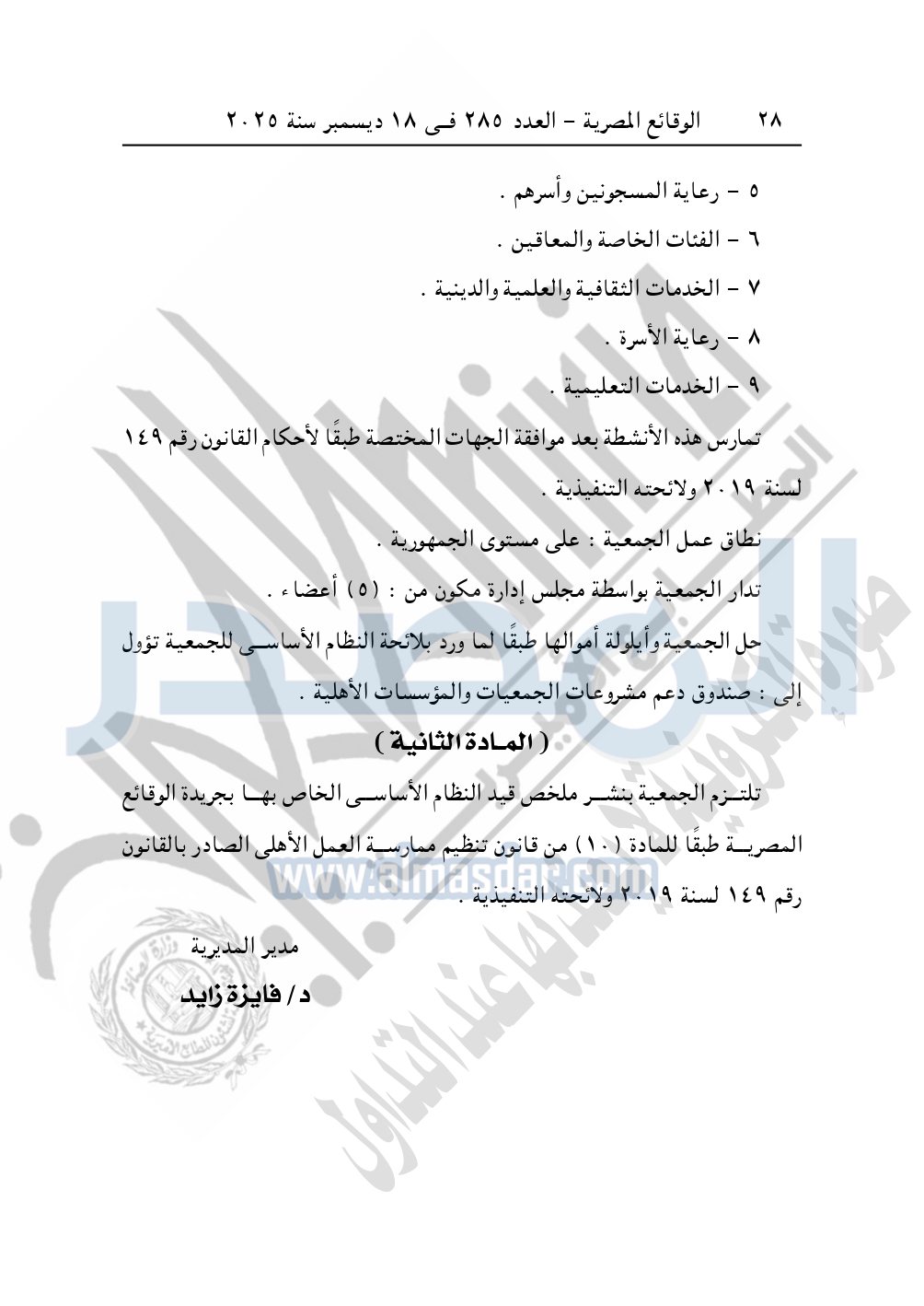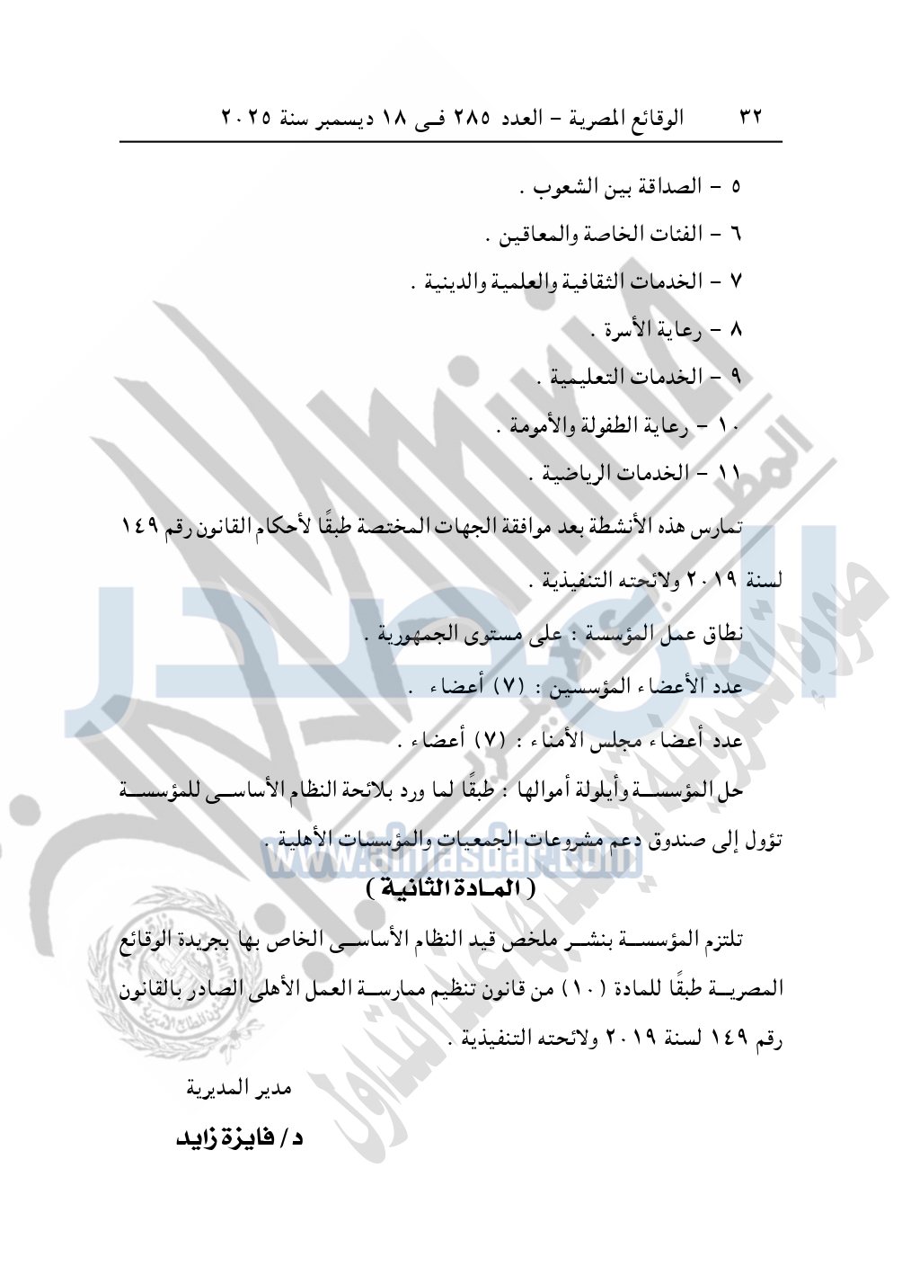 كما نشرت الوقائع المصرية في العدد 285، بتاريخ 18 ديسمبر 2025، قرار مديرية التضامن الاجتماعي بالإسكندرية، قيد 4601 لسنة 2025، بتاريخ 15-10-2025، بشأن قيد جمعية وش الخير للتنمية.