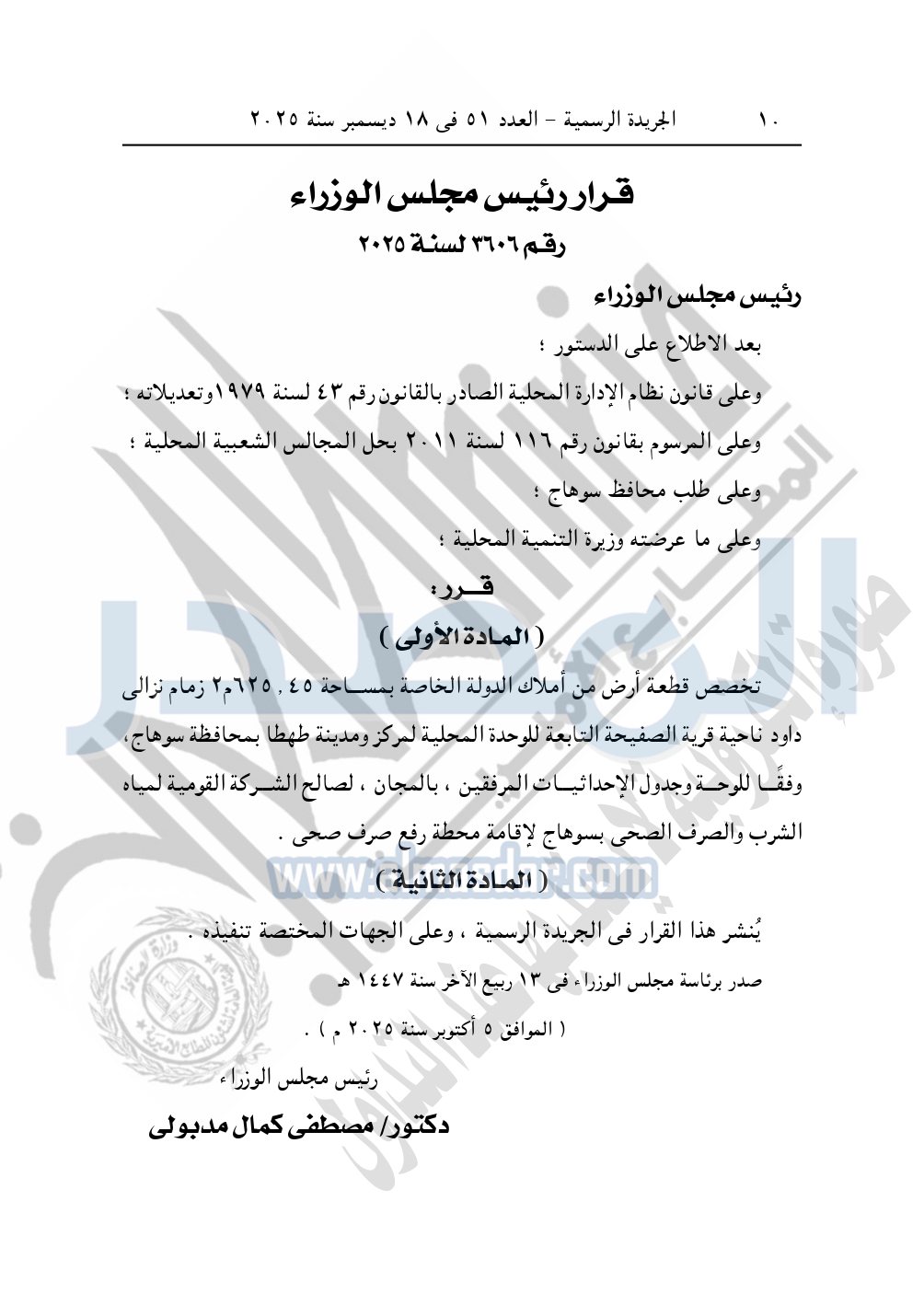نشرت الجريدة الرسمية في العدد 51، بتاريخ 18 ديسمبر 2025، قرار رئيس مجلس الوزراء، رقم 3606 لسنة 2025، بشأن تخصيص قطعة أرض لإقامة محطة رفع صرف صحى بمحافظة سوهاج.