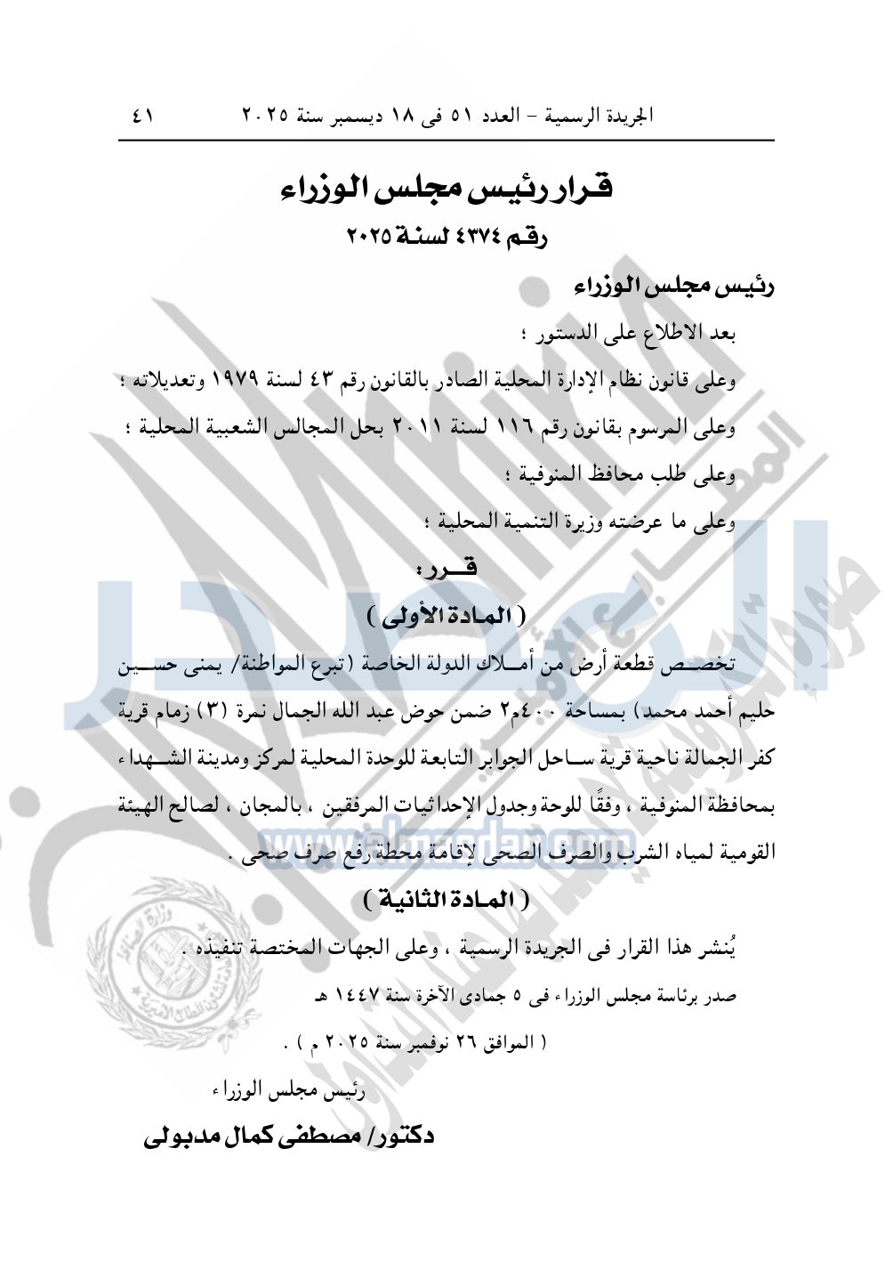 كما نشرت الجريدة الرسمية في العدد 51، بتاريخ 18 ديسمبر 2025، قرار رئيس مجلس الوزراء، رقم 4374 لسنة 2025، بشأن تخصيص قطعة أرض لإقامة محطة رفع صرف صحى بمحافظة المنوفية.