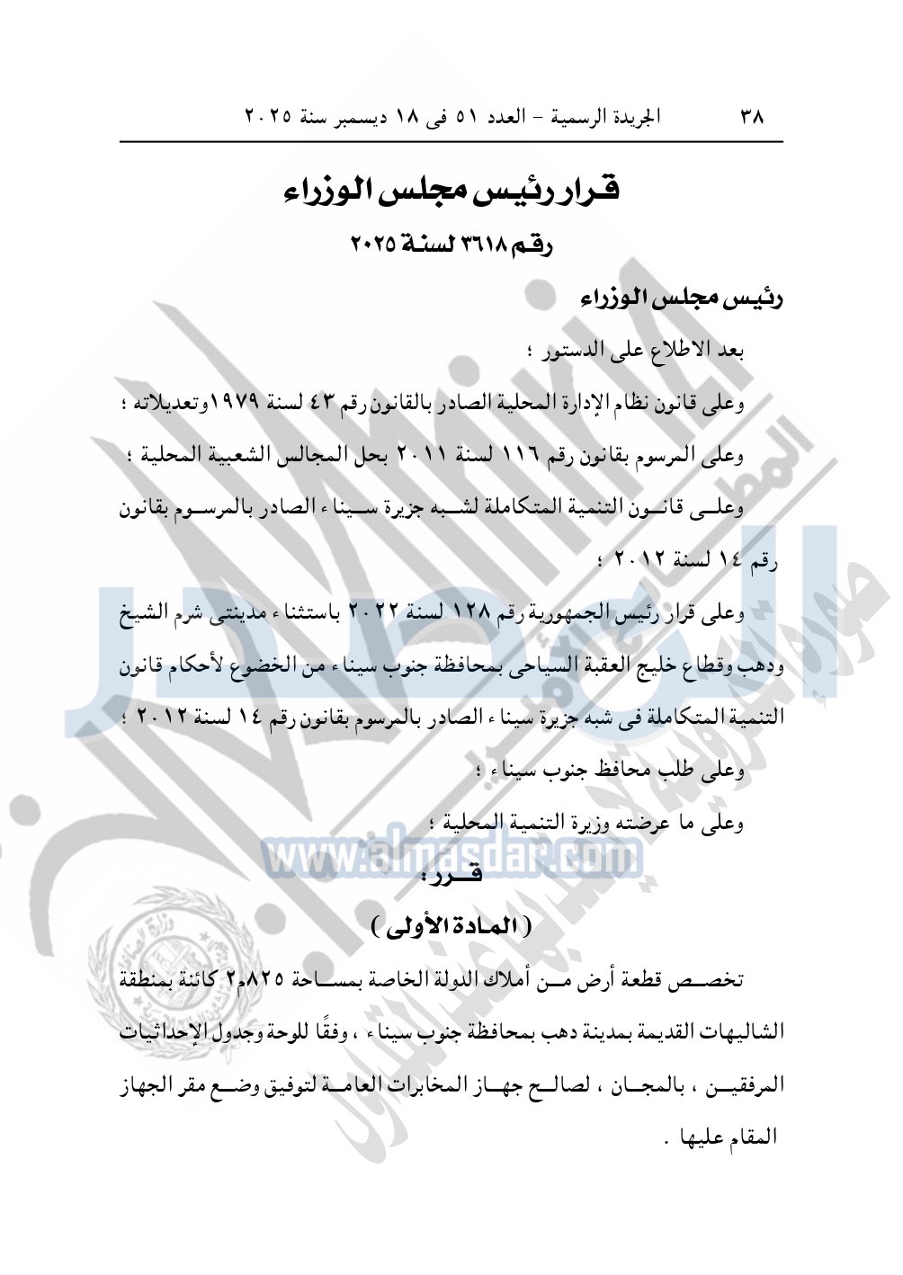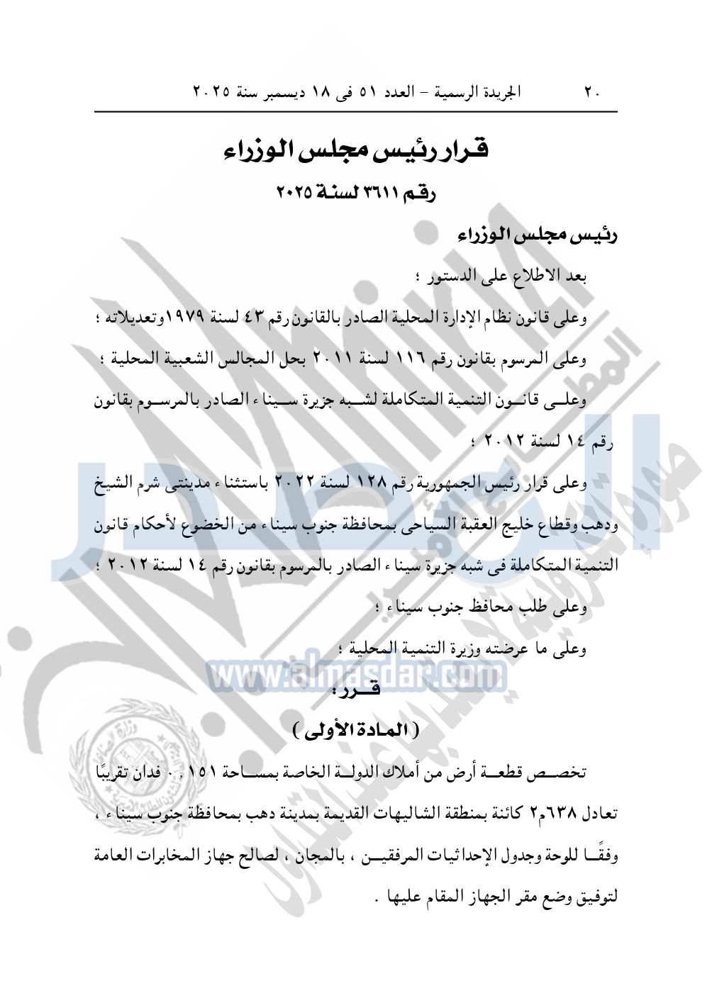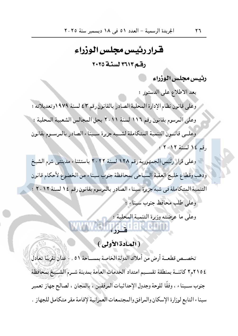 كما نشرت الجريدة الرسمية في العدد 51، بتاريخ 18 ديسمبر 2025، قرار رئيس مجلس الوزراء، رقم 3613 لسنة 2025، بشأن تخصيص قطعة أرض لإقامة مقر متكامل لجهاز تعمیر سيناء.