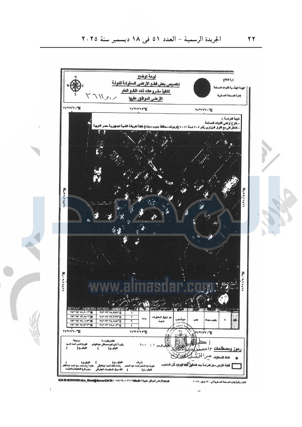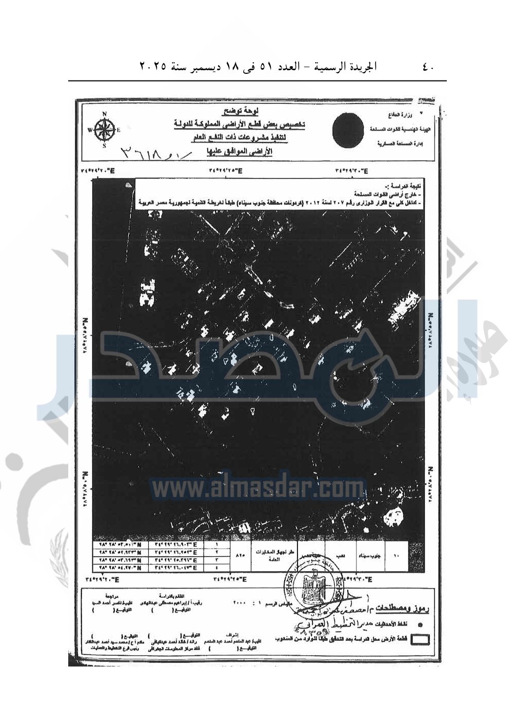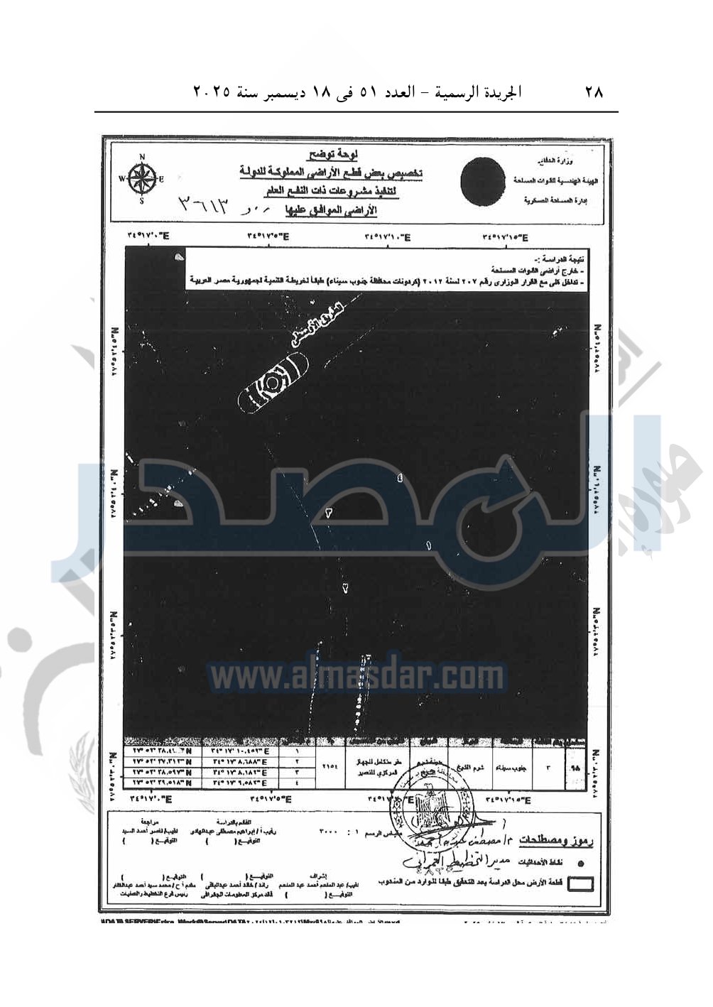 كما نشرت الجريدة الرسمية في العدد 51، بتاريخ 18 ديسمبر 2025، قرار رئيس مجلس الوزراء، رقم 3613 لسنة 2025، بشأن تخصيص قطعة أرض لإقامة مقر متكامل لجهاز تعمیر سيناء.