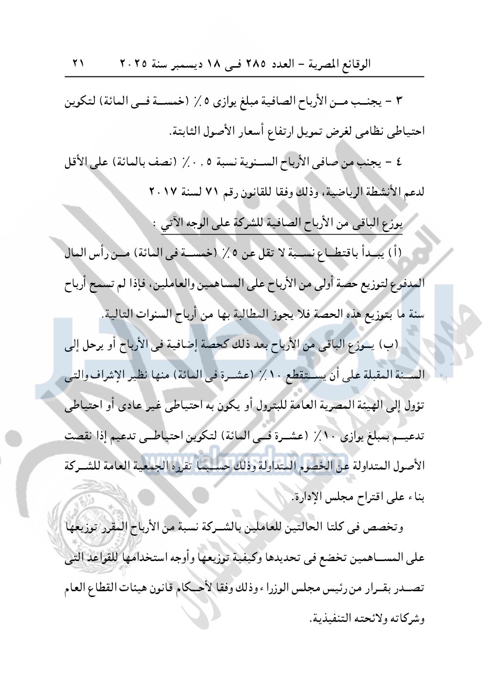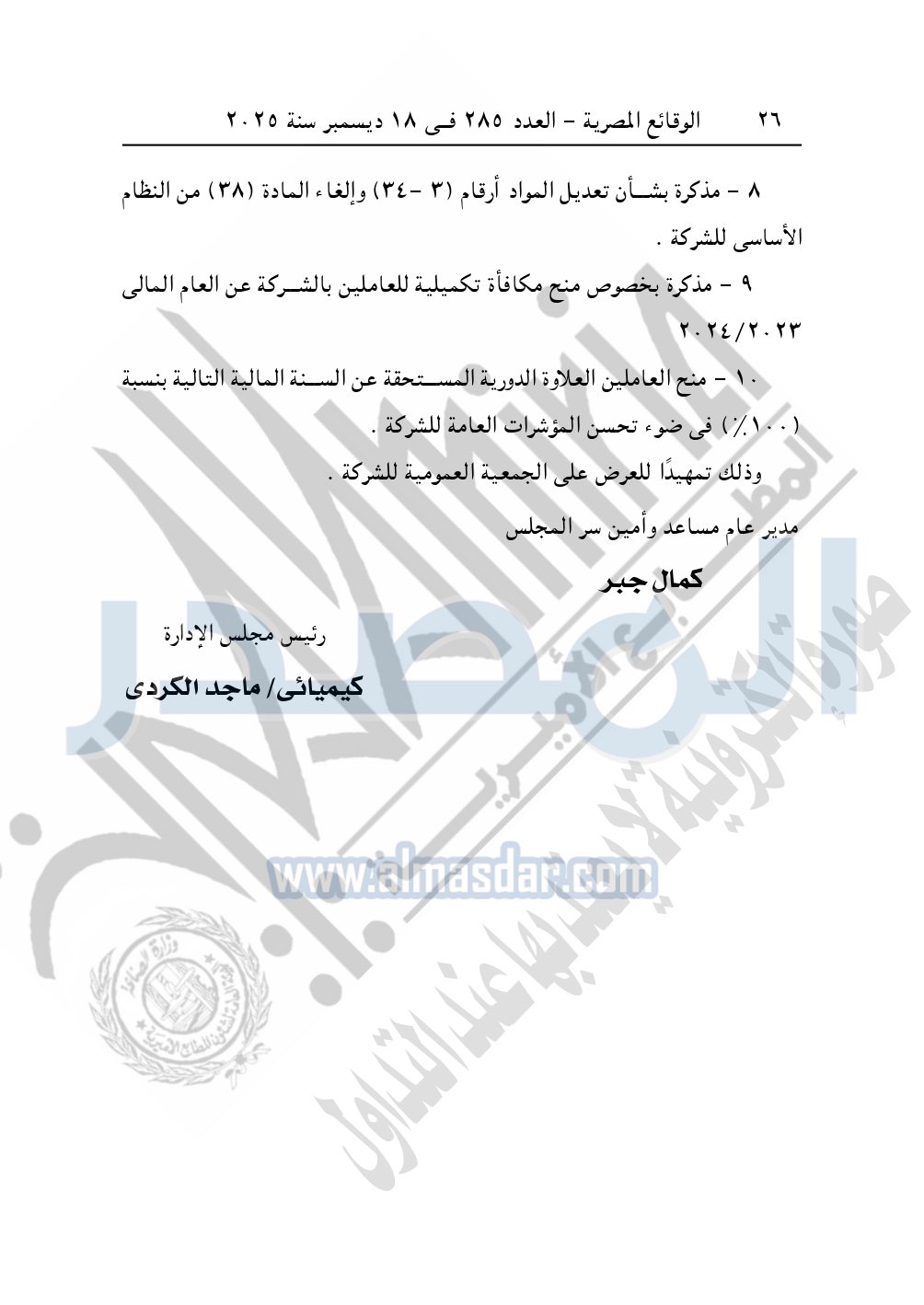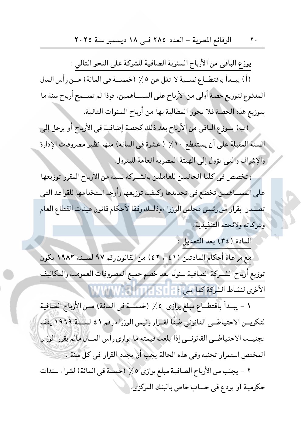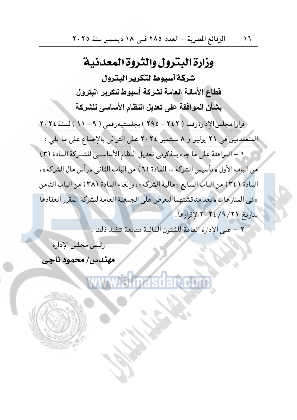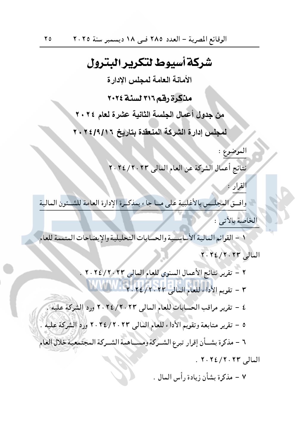 وايضا نشرت الوقائع المصرية، في العدد 285، الصادر في 18 ديسمبر سنة 2025، قرار وزارة البترول والثروة المعدنية، شركة أسيوط لتكرير البترول، الأمانة العامة لمجلس الإدارة، مذكرة رقم 316 لسنة 2024، من جدول أعمال الجلسة الثانية عشرة لعام 2024، لمجلس إدارة الشركة المنعقدة بتاريخ 16-9-2024.