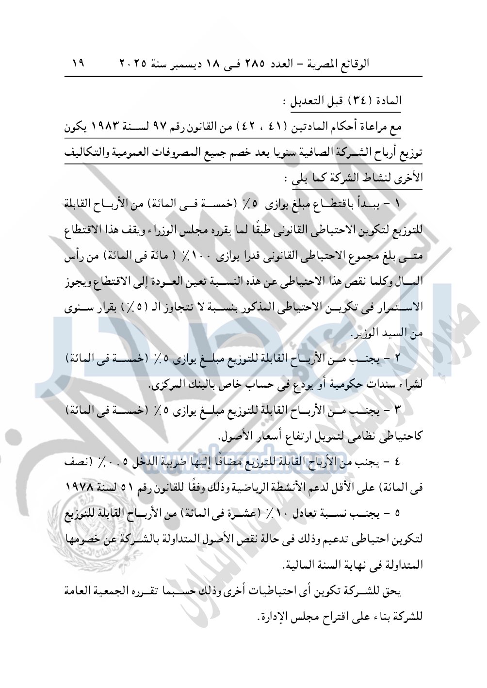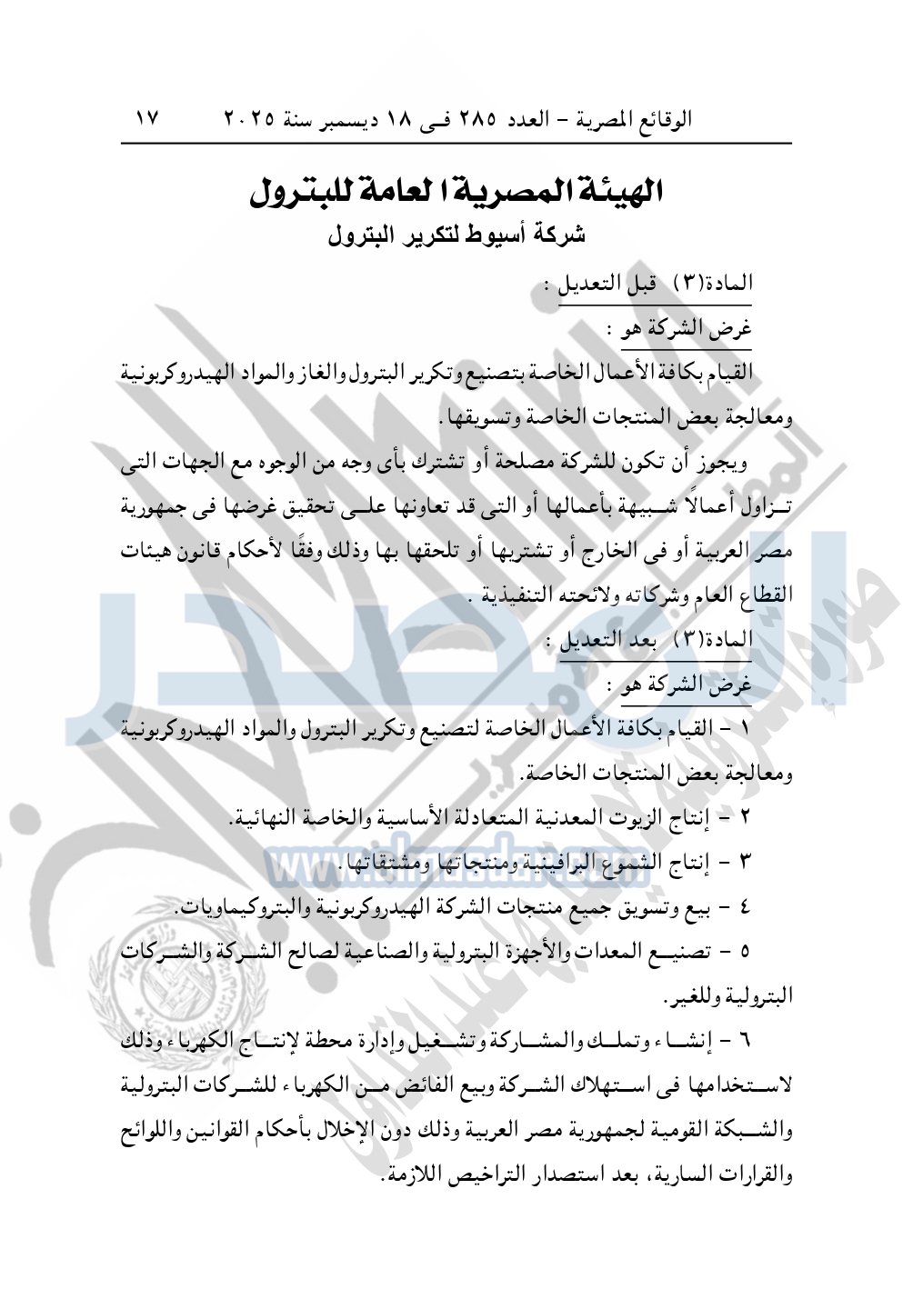نشرت الوقائع المصرية، في العدد 285، الصادر في 18 ديسمبر سنة 2025، قرار وزارة البترول والثروة المعدنية، شركة أسيوط لتكرير البترول، قطاع الأمانة العامة لشركة أسيوط لتكرير البترول، بشأن الموافقة على تعديل النظام الأساسي للشركة.