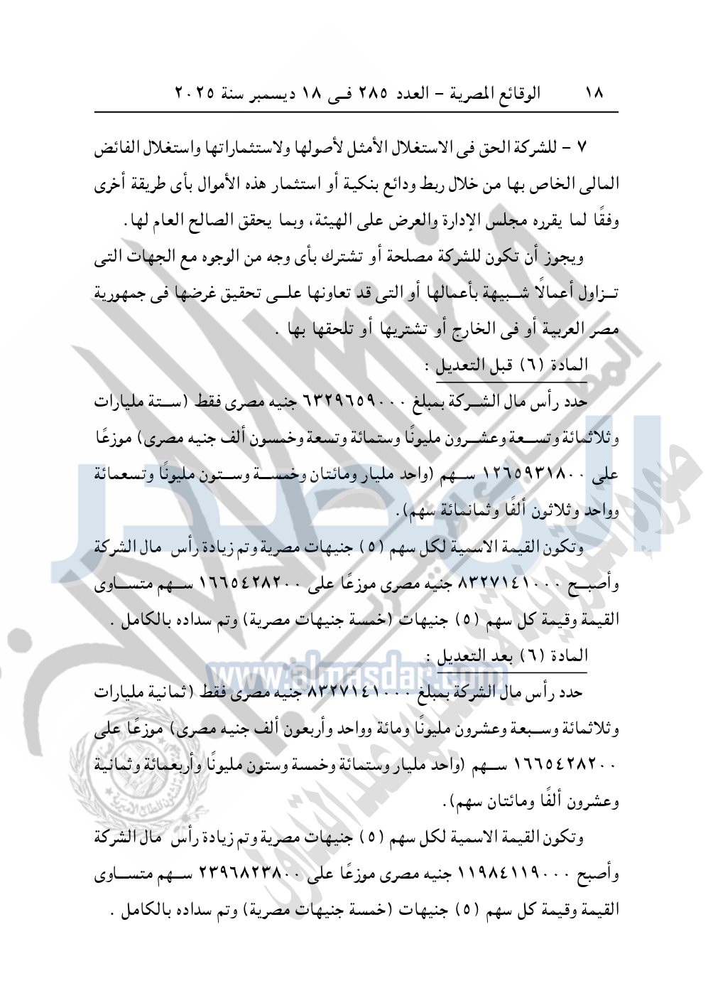 حدد رأس مال الشركة بمبلغ 6329659000 جنيه مصرى فقط "ستة مليارات وثلاثمائة وتسعة وعشرون مليونًا وستمائة وتسعة وخمسون ألف جنيه مصرى" موزعا على 1265931800 سهم "واحد مليار ومائتان وخمسة وستون مليونا وتسعمائة وواحد وثلاثون ألفًا وثمانمائة سهم".