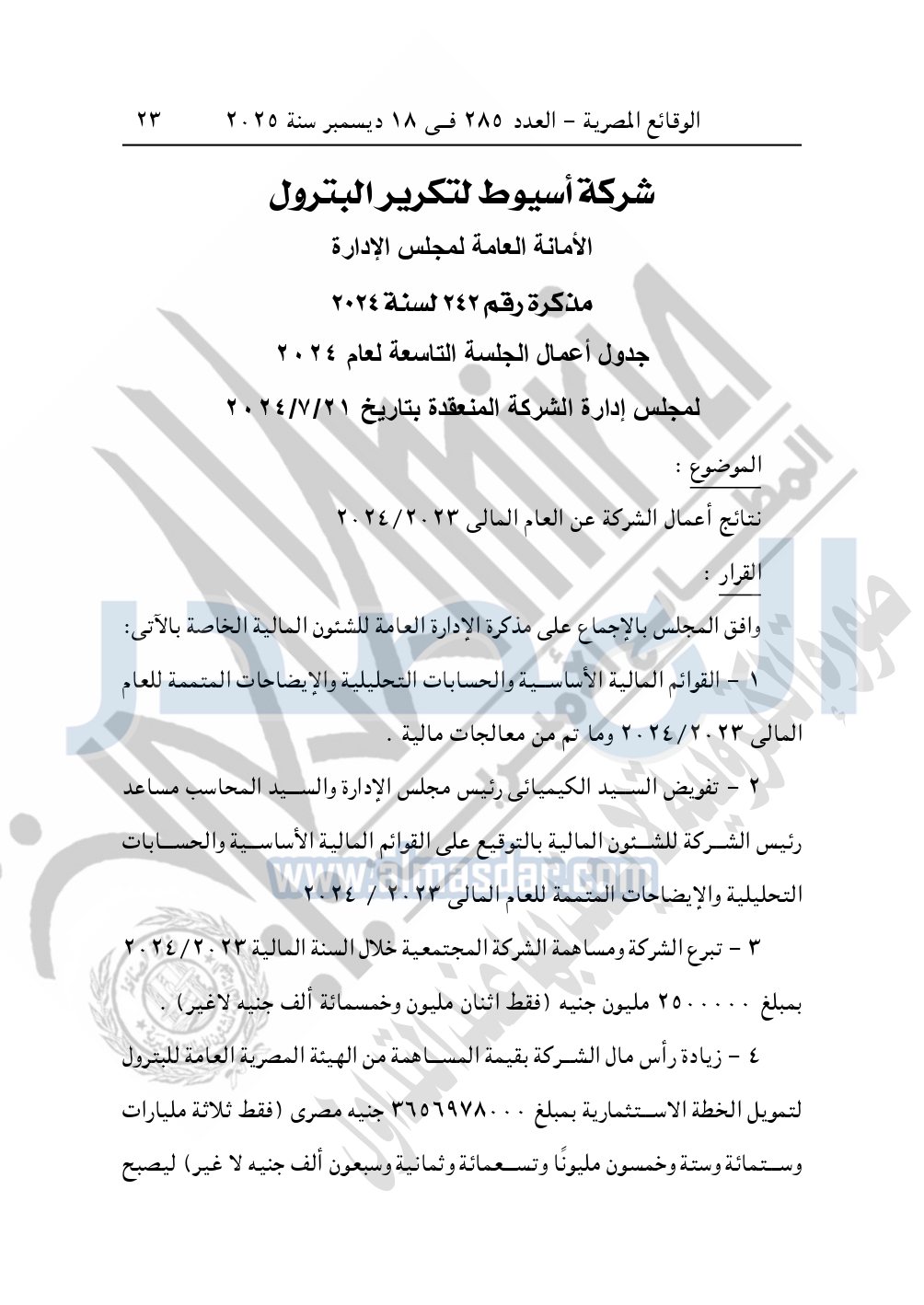 كما نشرت الوقائع المصرية، في العدد 285، الصادر في 18 ديسمبر سنة 2025، قرار وزارة البترول والثروة المعدنية، شركة أسيوط لتكرير البترول، الأمانة العامة لمجلس الإدارة، مذكرة رقم 242 لسنة 2024، جدول أعمال الجلسة التاسعة لعام 2024، لمجلس إدارة الشركة المنعقدة بتاريخ 21-7-2024.