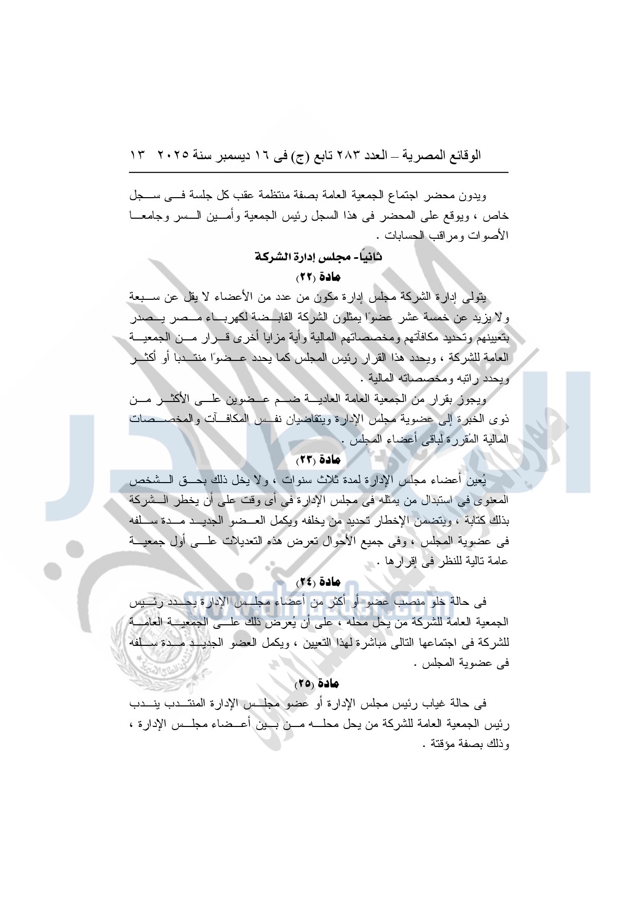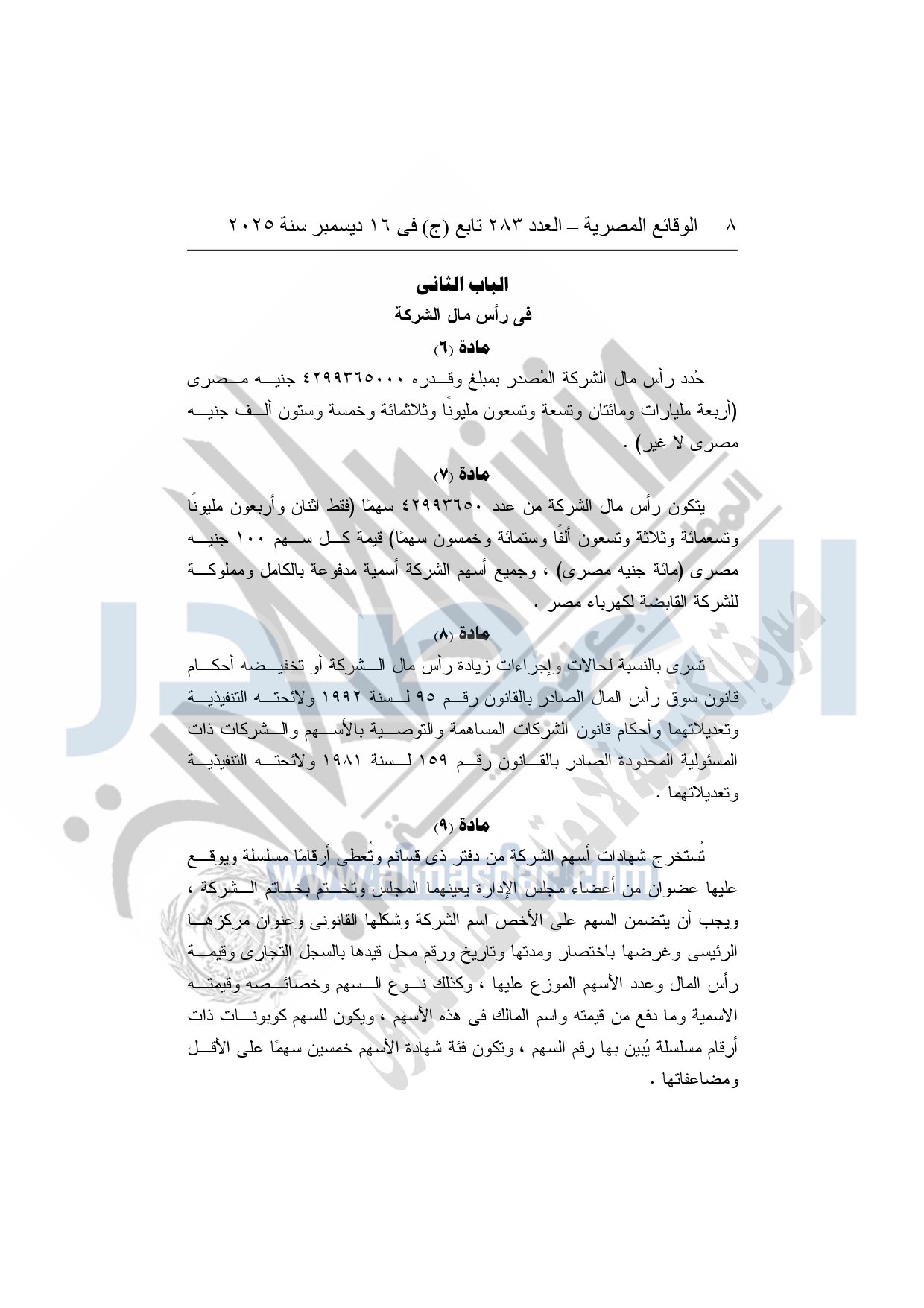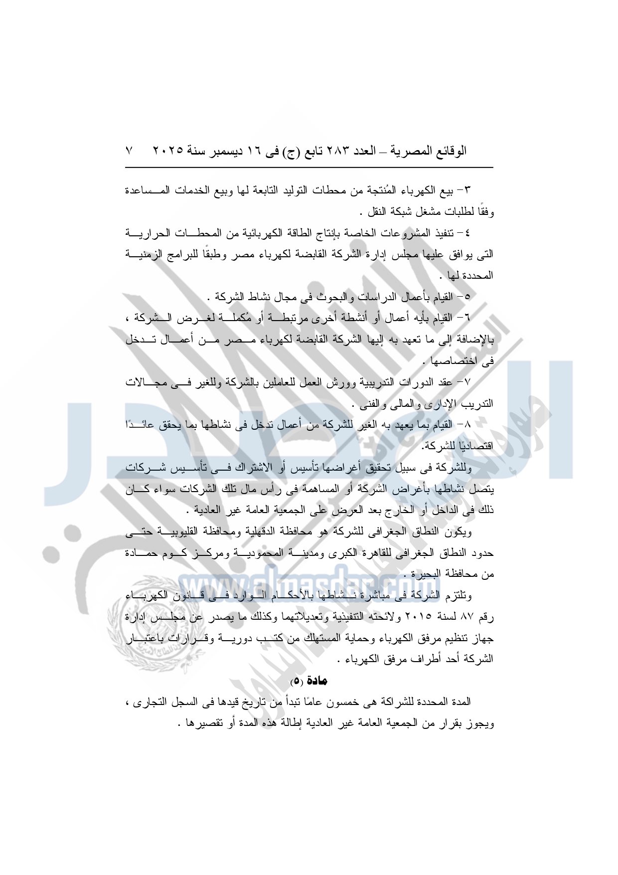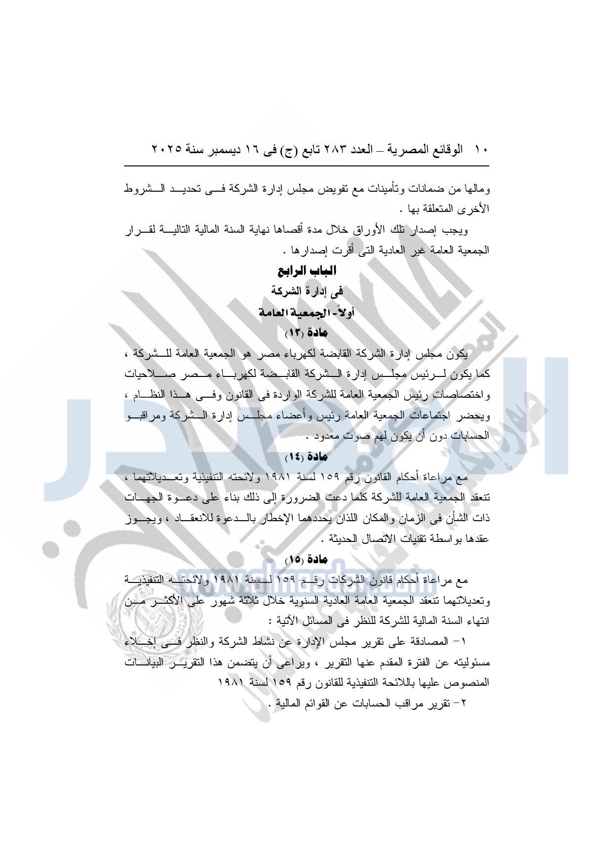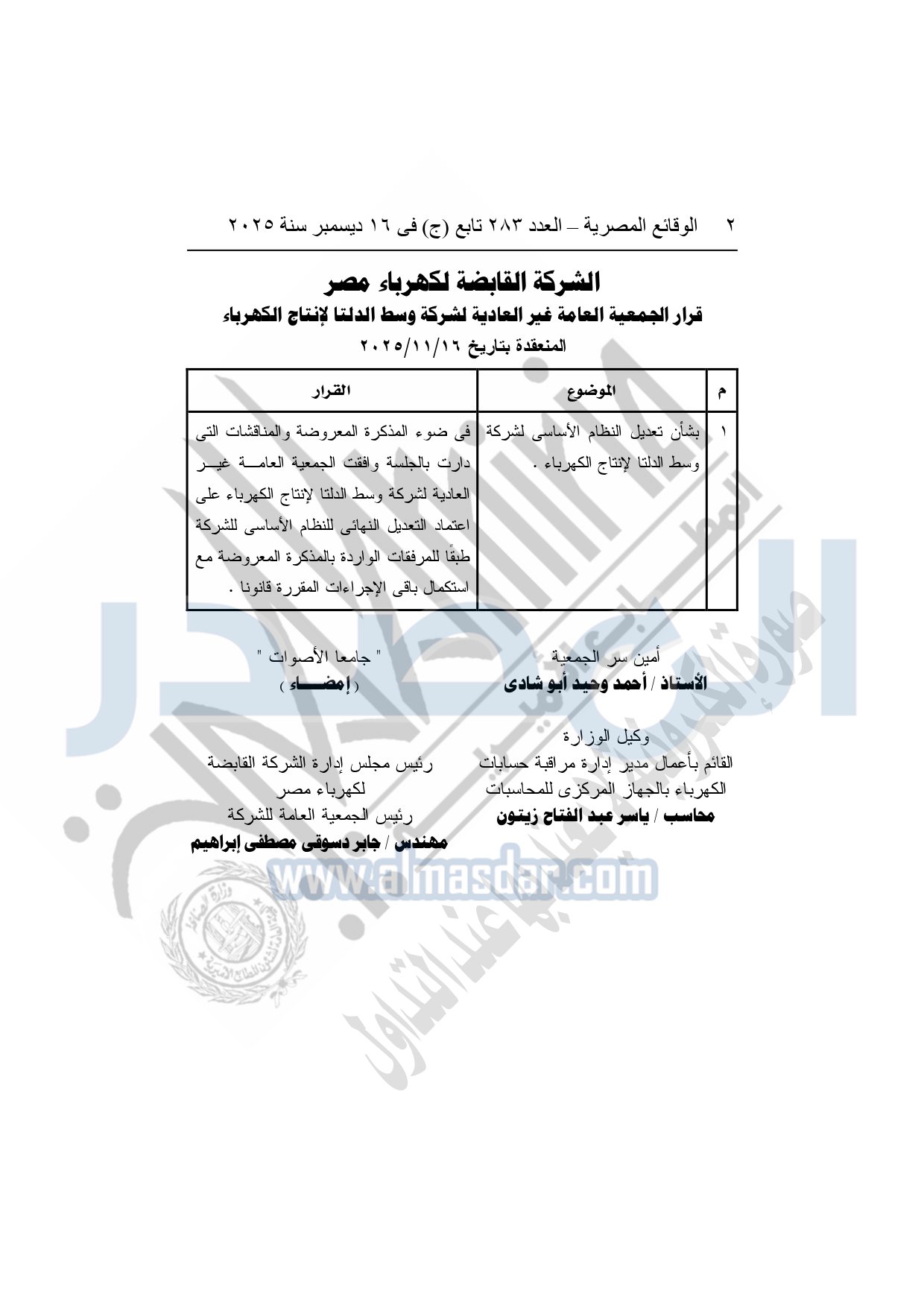نشرت الوقائع المصرية في العدد 283 تابع "ج" الصادر في 16 ديسمبر سنة 2025، الشركة القابضة لكهرباء مصر، قرار الجمعية العامة غير العادية لشركة وسط الدلتا لإنتاج الكهرباء، المنعقدة بتاريخ 16-11-2025.