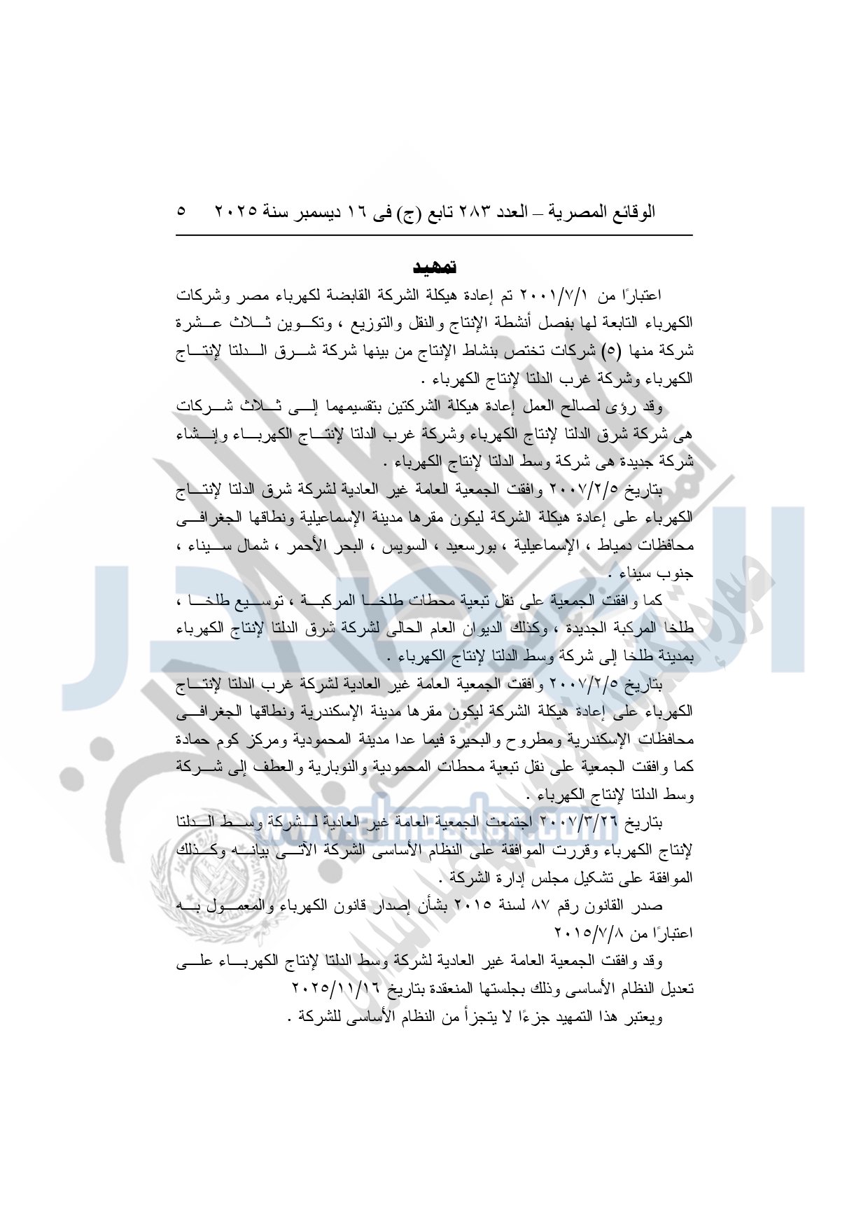 تعديل النظام الأساسي لشركة وسط الدلتا لإنتاج الكهرباء