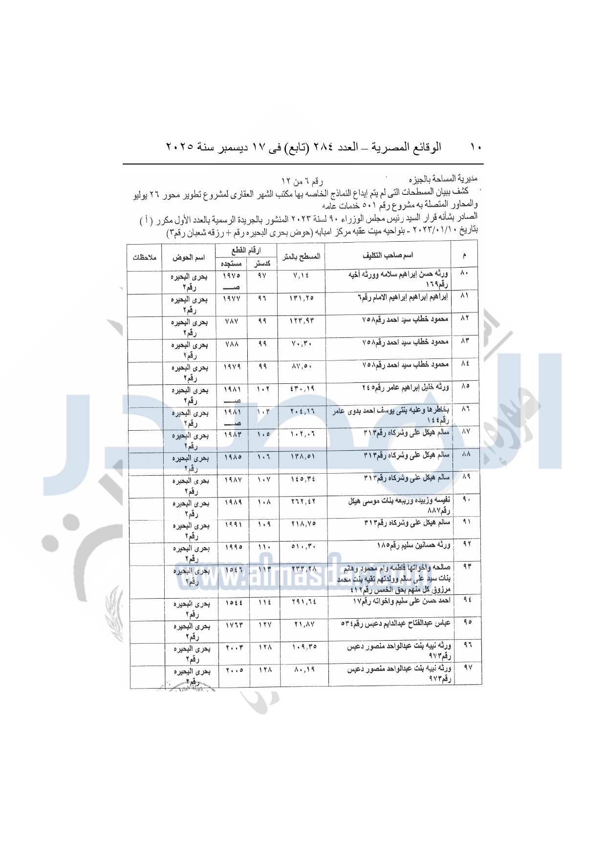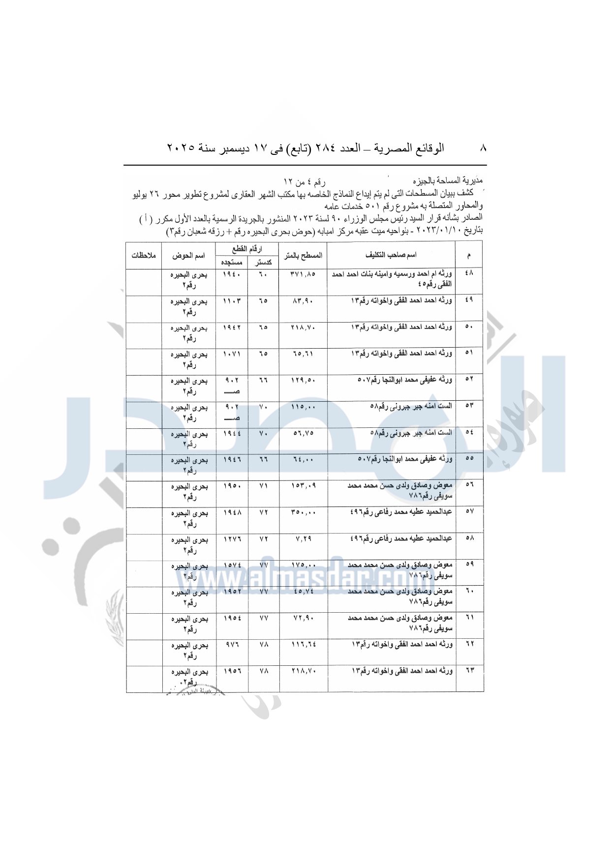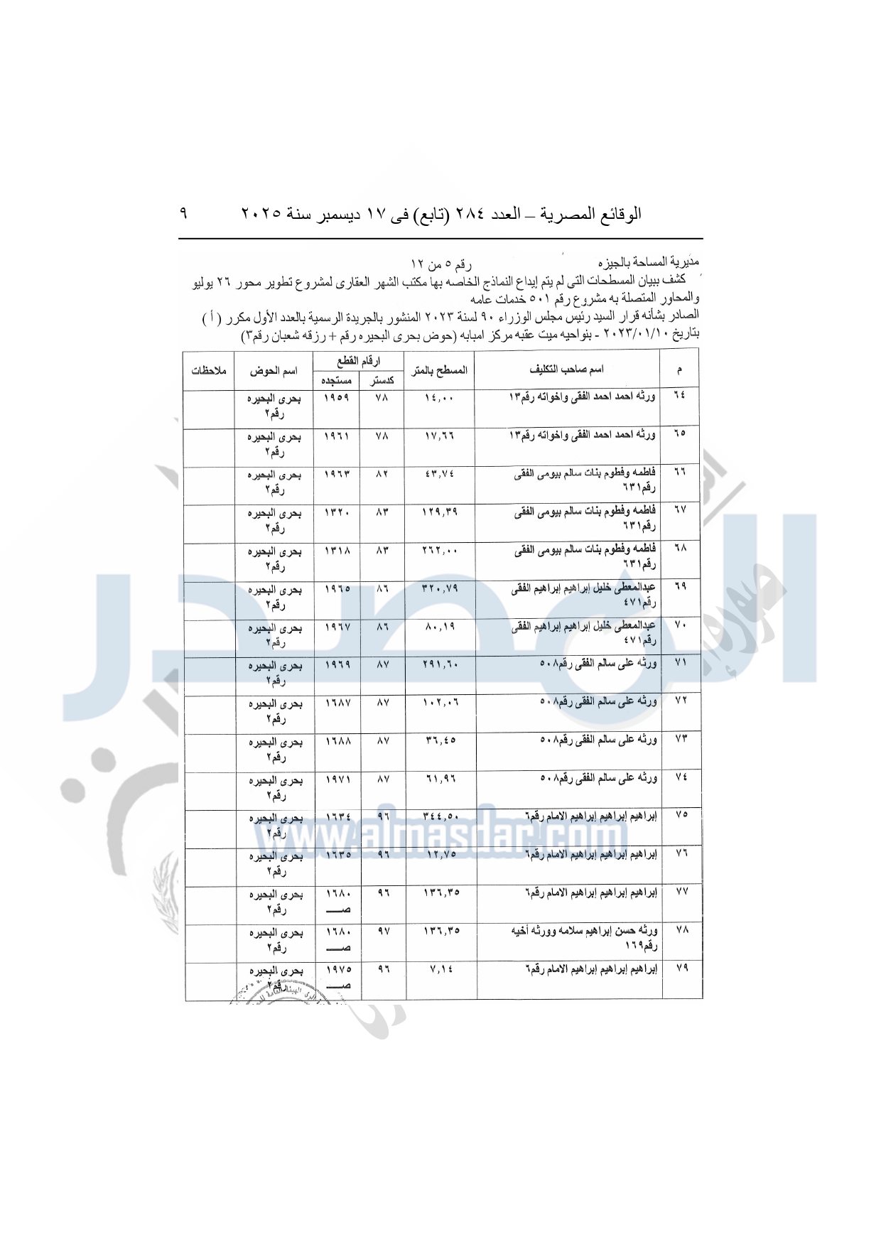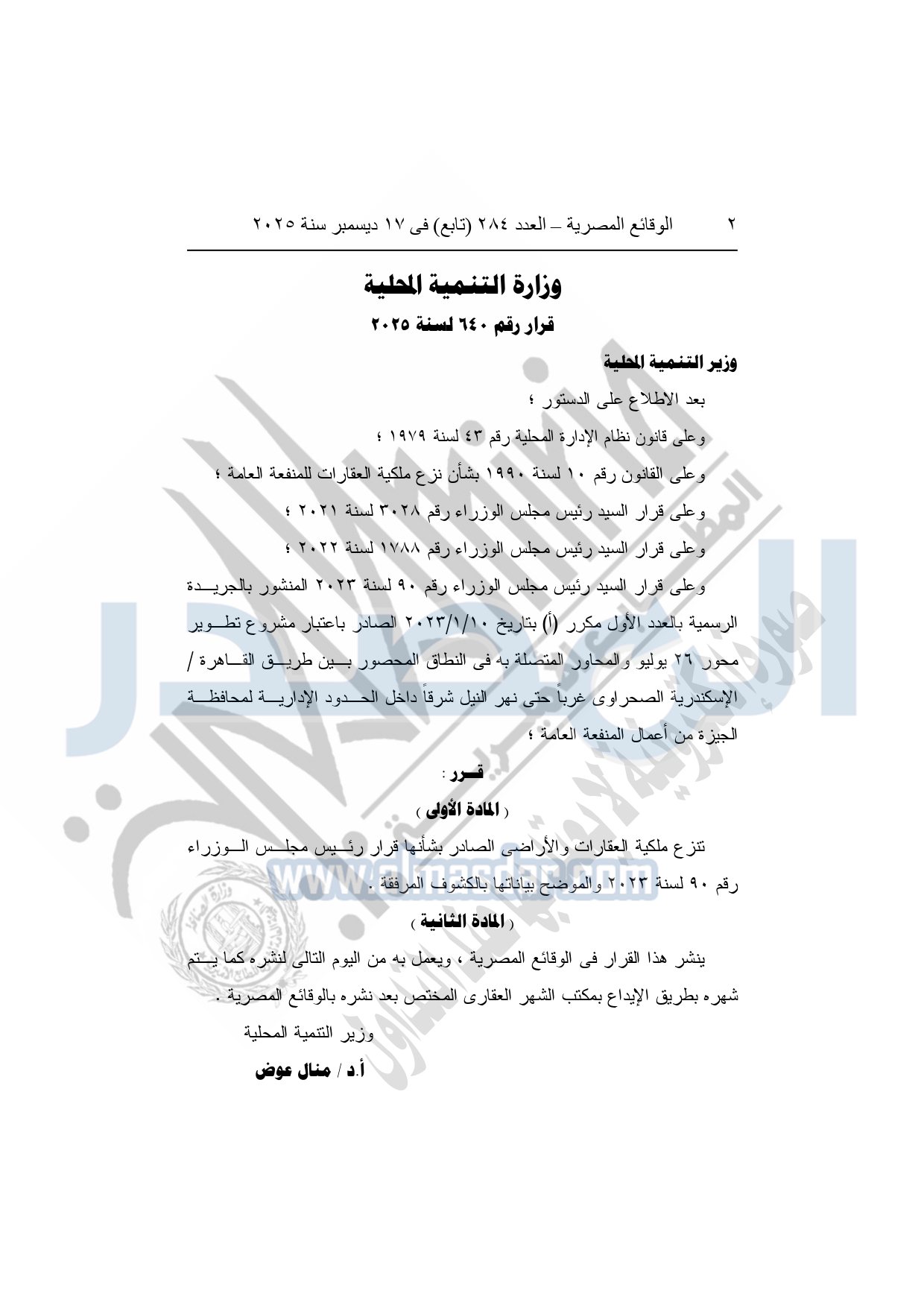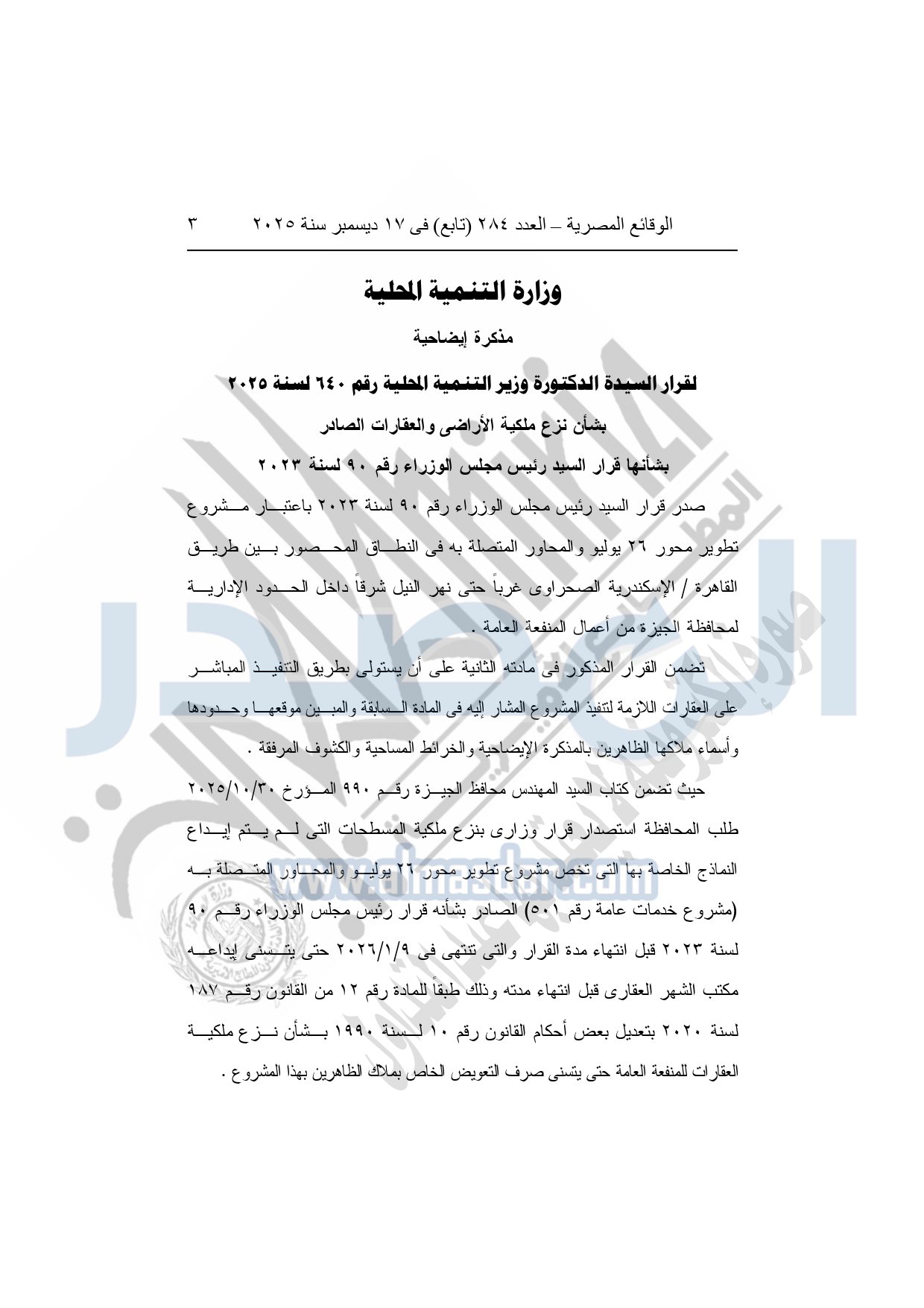 نشرت الوقائع المصرية، في العدد 284 "تابع"، الصادر في 17 ديسمبر 2025، قرار وزارة التنمية المحلية، رقم 640 لسنة 2025، بشأن نزع ملكية أراضي وعقارات لتنفيذ مشروع تطوير محور 26 يوليو بمحافظة الجيزة.