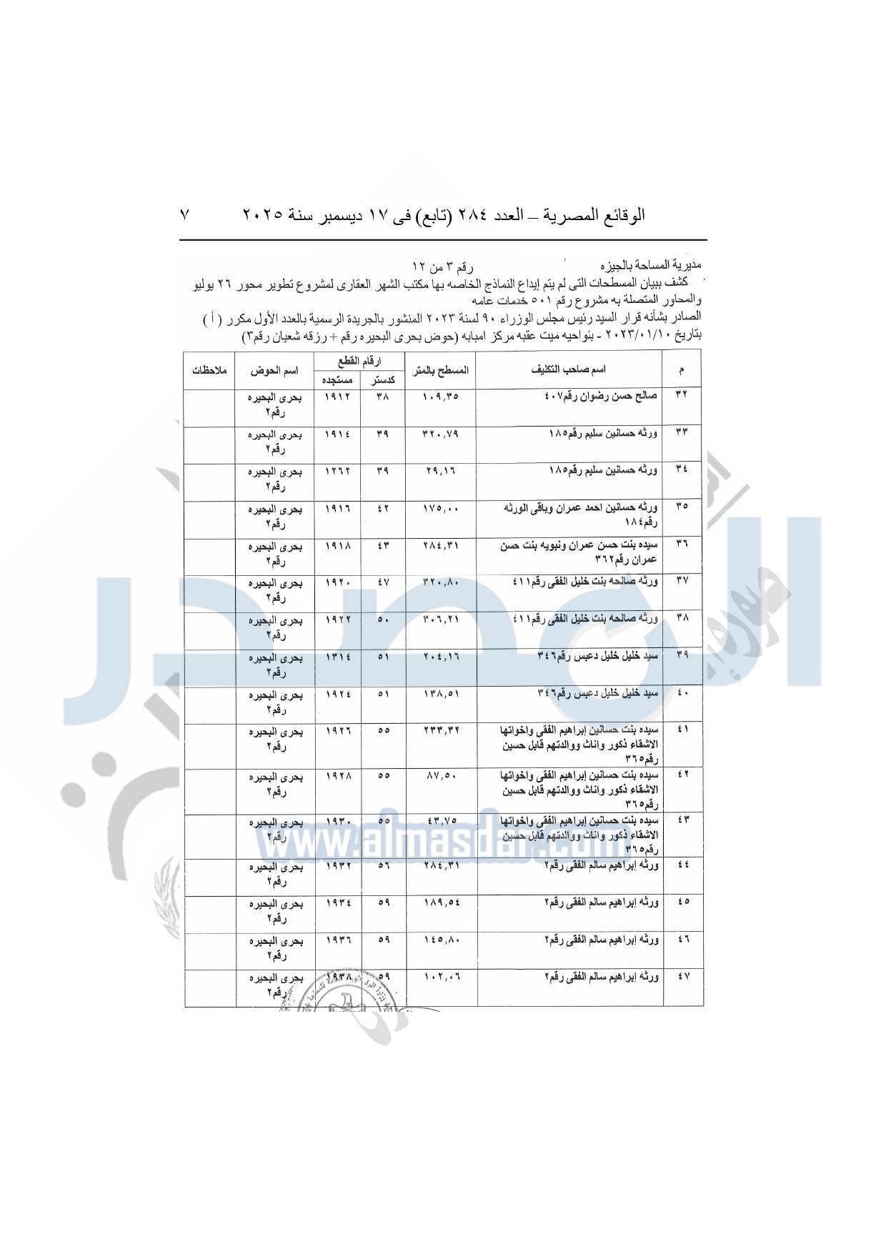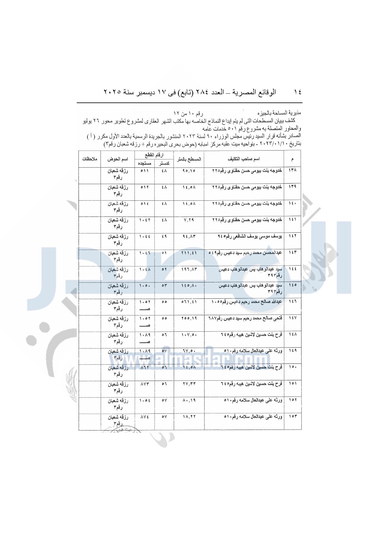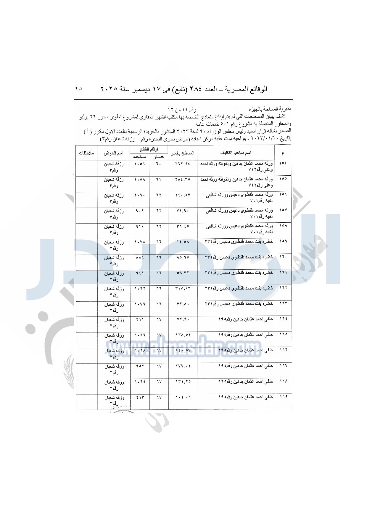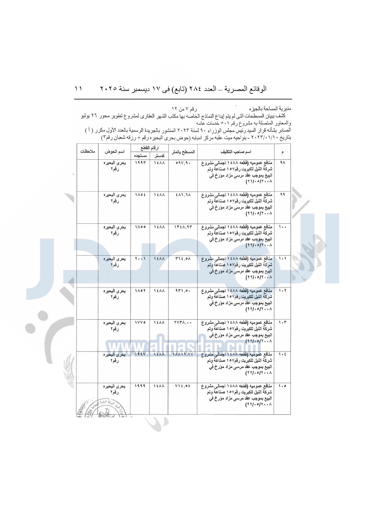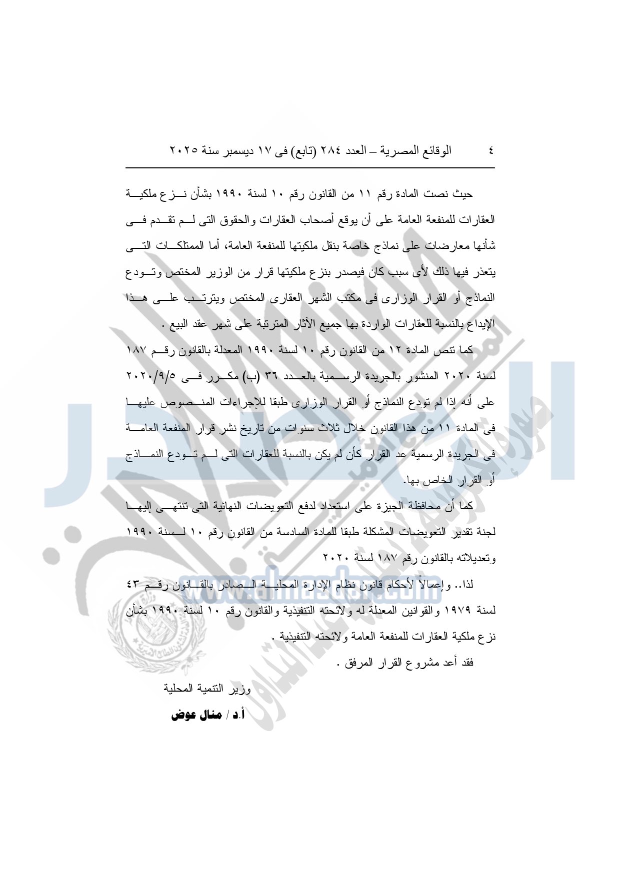 نشرت الوقائع المصرية، في العدد 284 "تابع"، الصادر في 17 ديسمبر 2025، قرار وزارة التنمية المحلية، رقم 640 لسنة 2025، بشأن نزع ملكية أراضي وعقارات لتنفيذ مشروع تطوير محور 26 يوليو بمحافظة الجيزة.