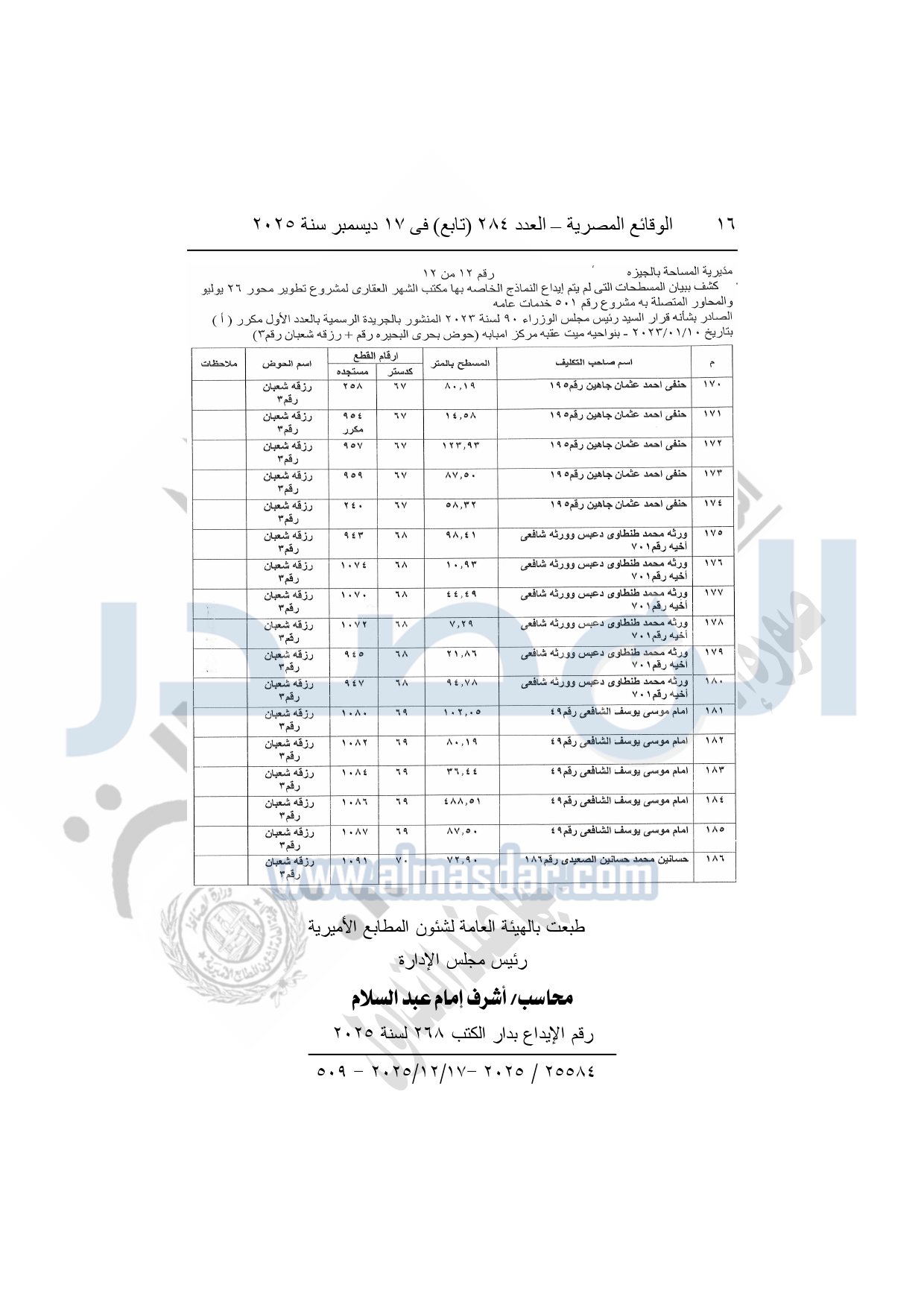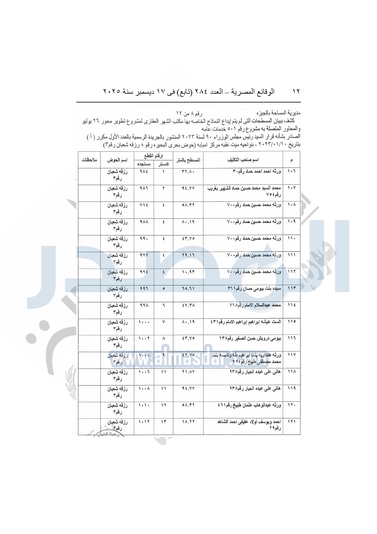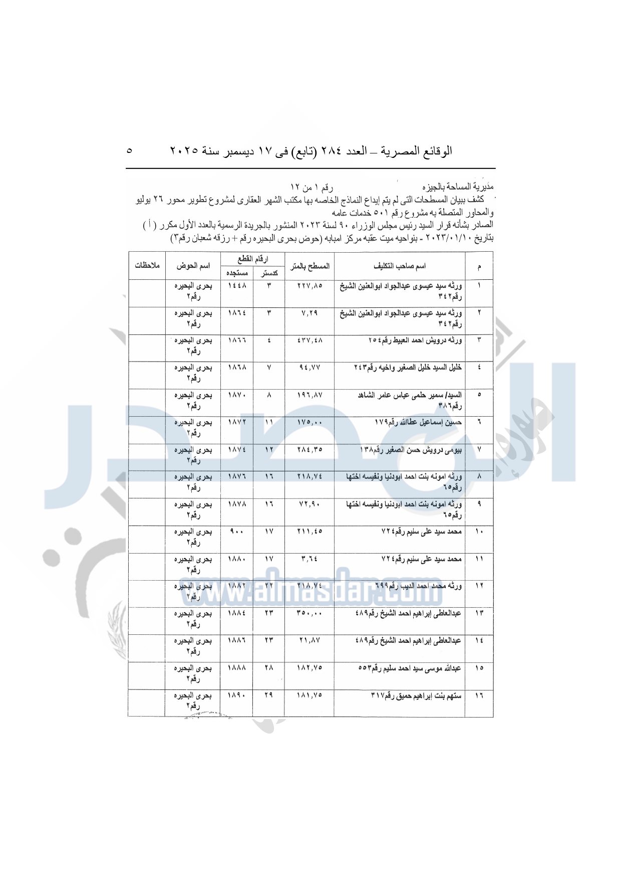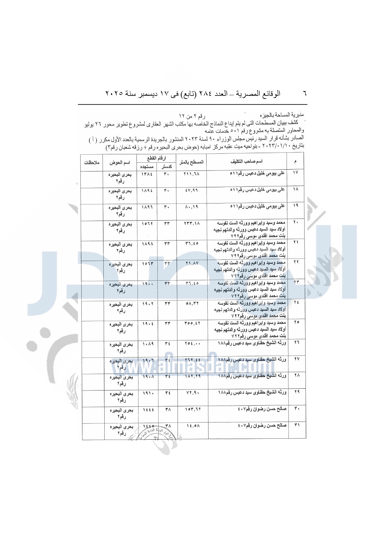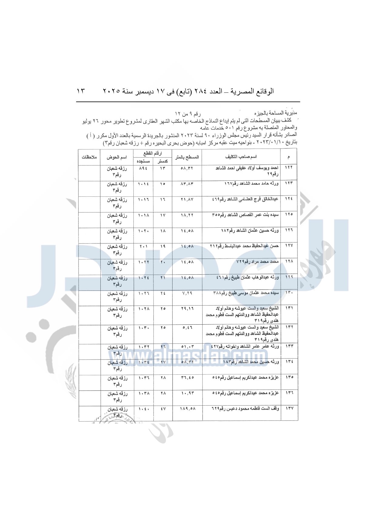 نشرت الوقائع المصرية، في العدد 284 "تابع"، الصادر في 17 ديسمبر 2025، قرار وزارة التنمية المحلية، رقم 640 لسنة 2025، بشأن نزع ملكية أراضي وعقارات لتنفيذ مشروع تطوير محور 26 يوليو بمحافظة الجيزة.
