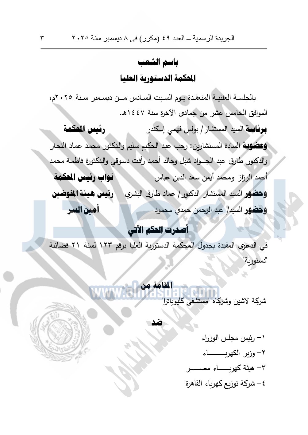 وأصدرت المحكمة الدستورية العليا حكمها في الدعوى المقامة من شركة لاشين وشركاه "مستشفى كليوباترا" ضد كل من: