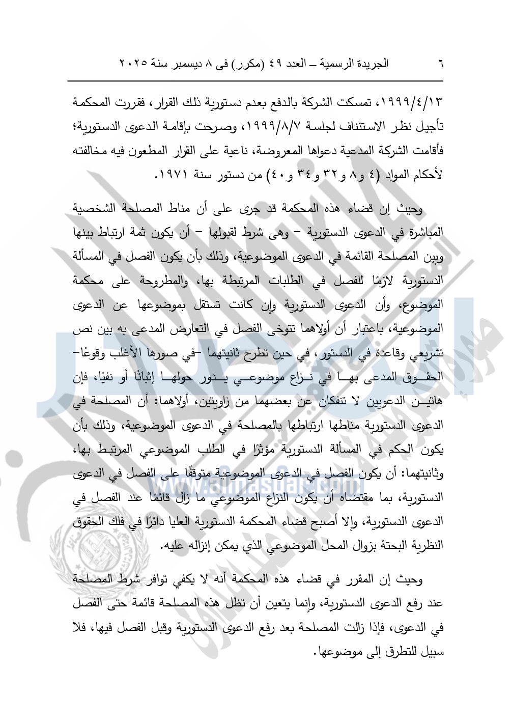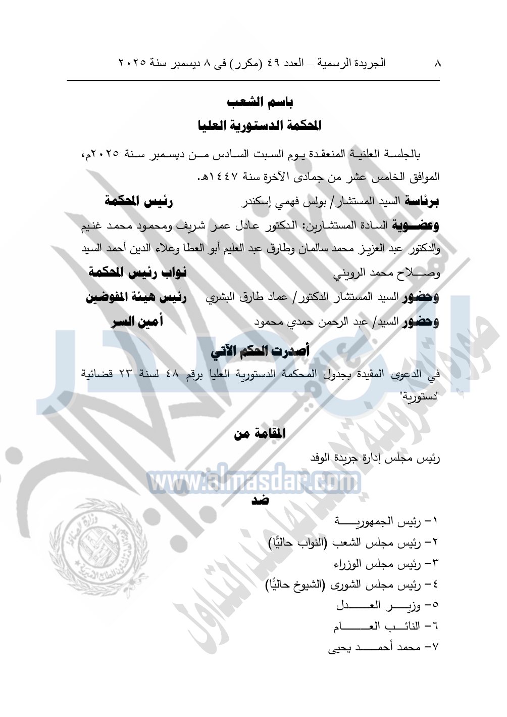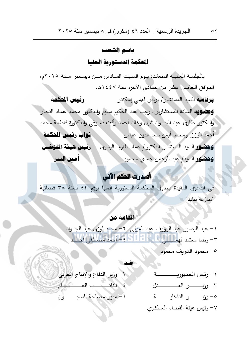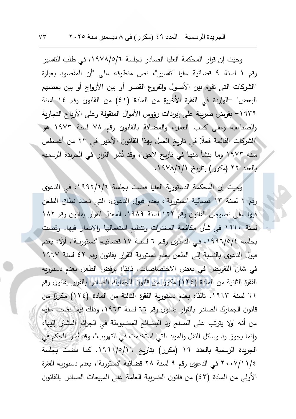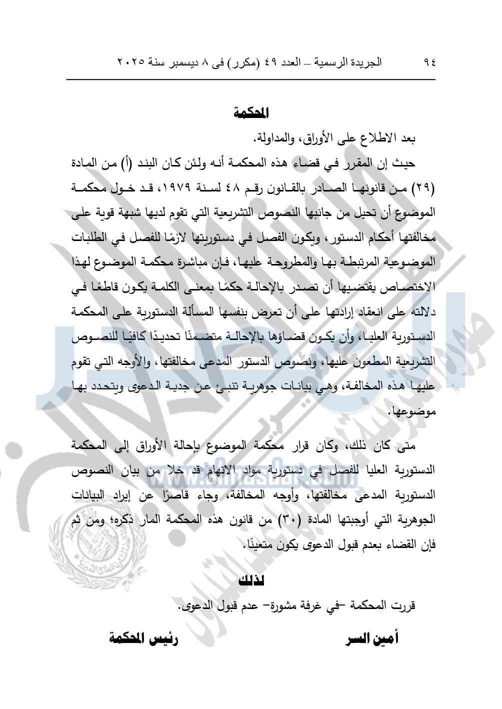 ونشرت الجريدة الرسمية في العدد 49 "مكرر"، في 6 أكتوبر سنة 2025، الأحكام الصادرة من المحكمة الدستورية العليا في عدد من الدعاوي القضائية بجلسة 6 ديسمبر 2025.