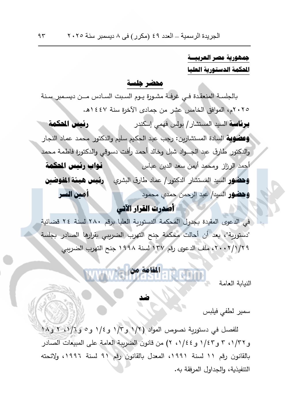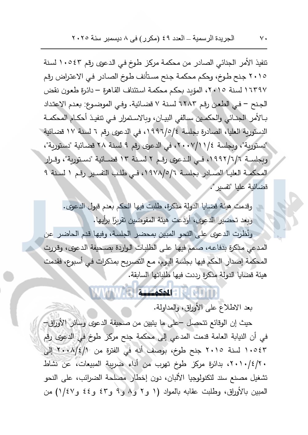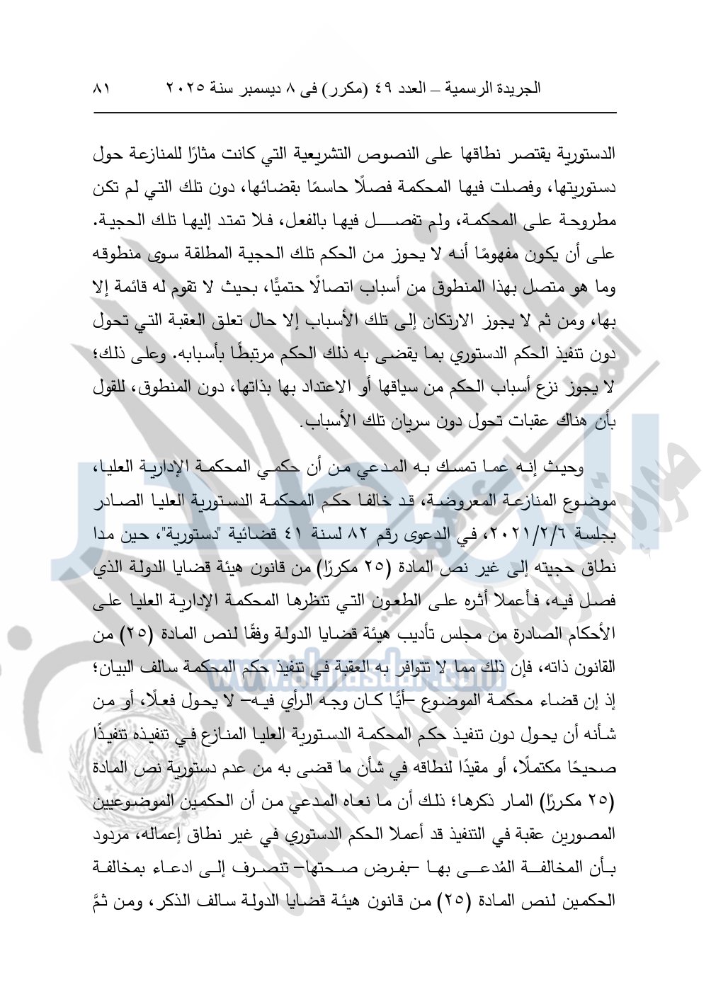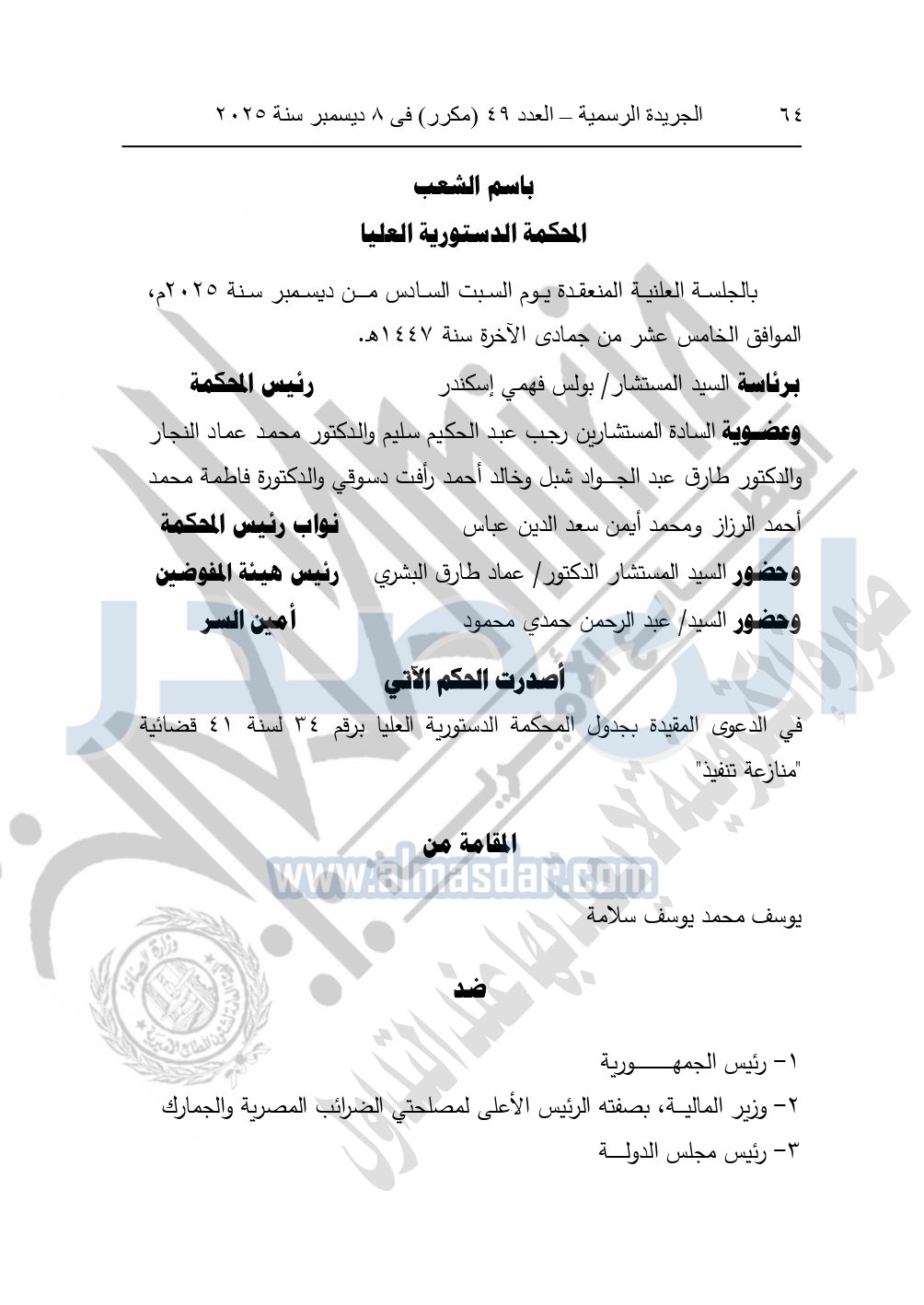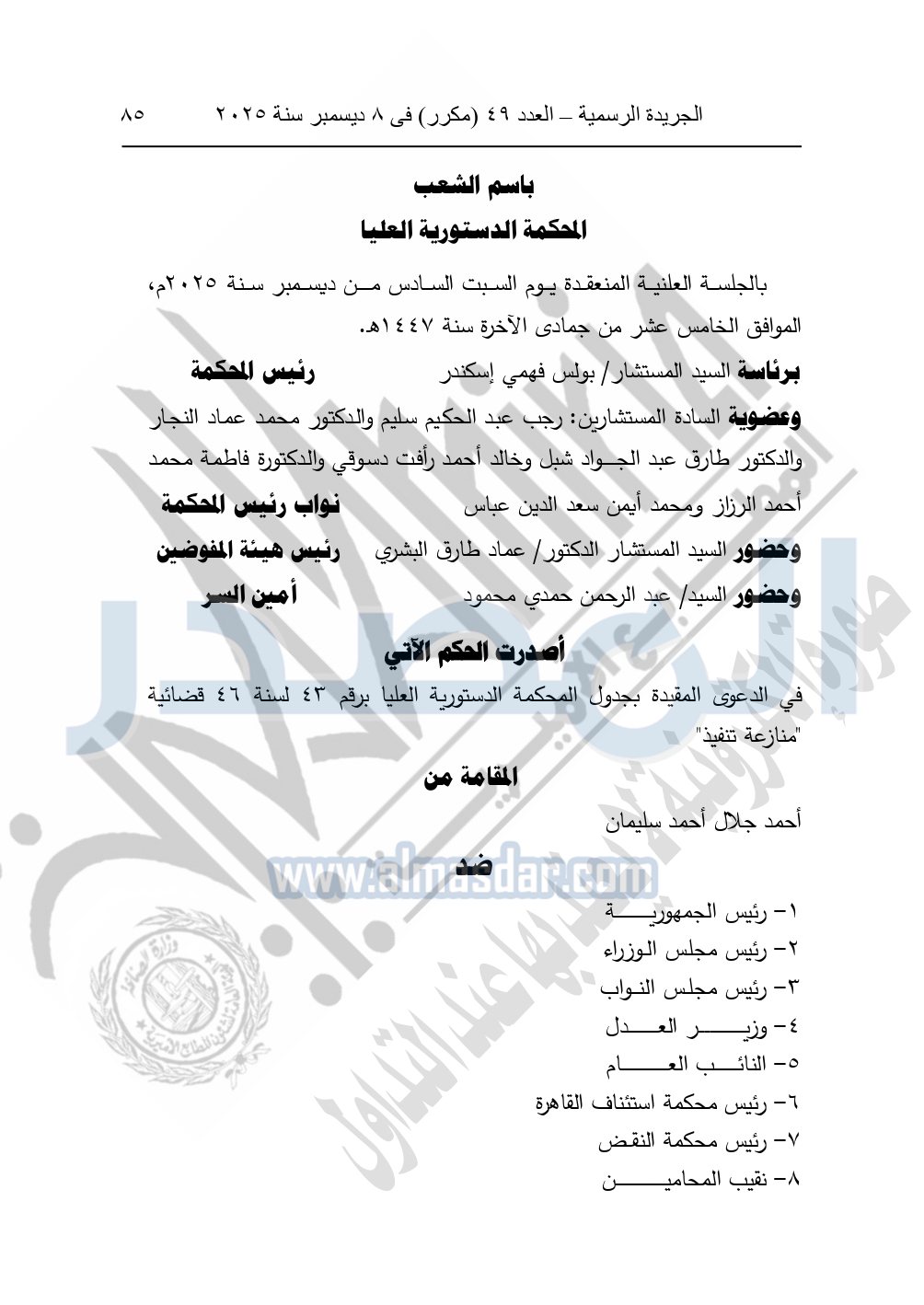 ونشرت الجريدة الرسمية في العدد 49 "مكرر"، في 6 أكتوبر سنة 2025، الأحكام الصادرة من المحكمة الدستورية العليا في عدد من الدعاوي القضائية بجلسة 6 ديسمبر 2025.