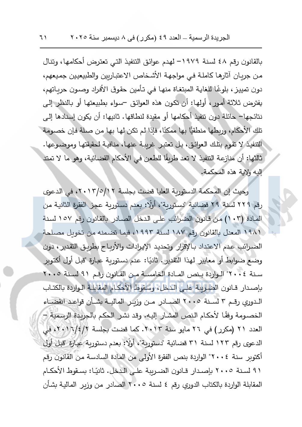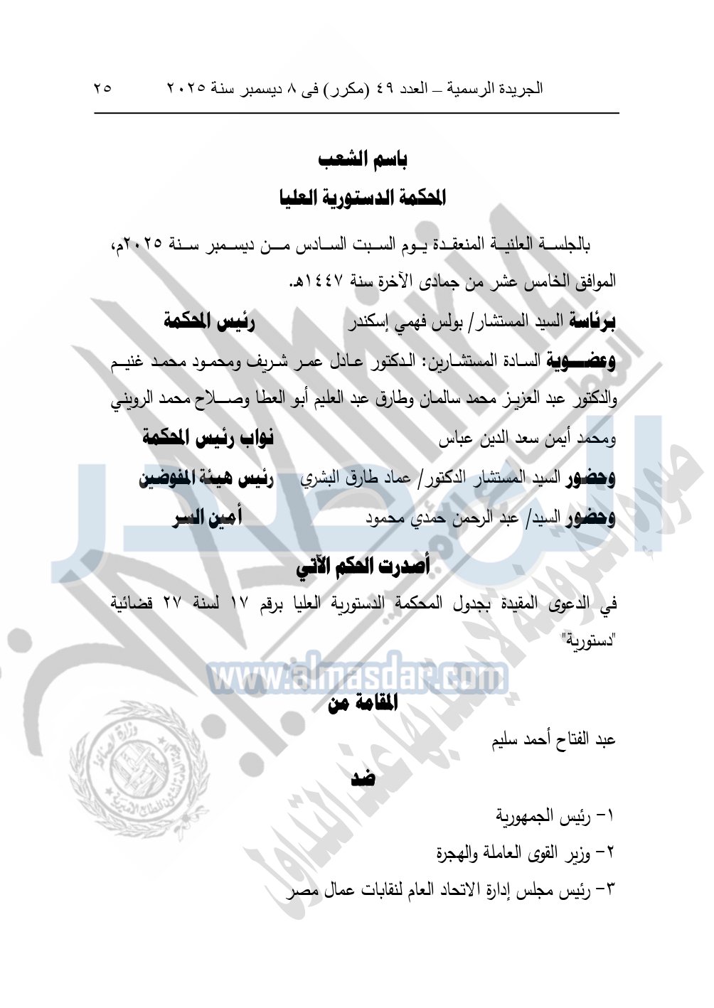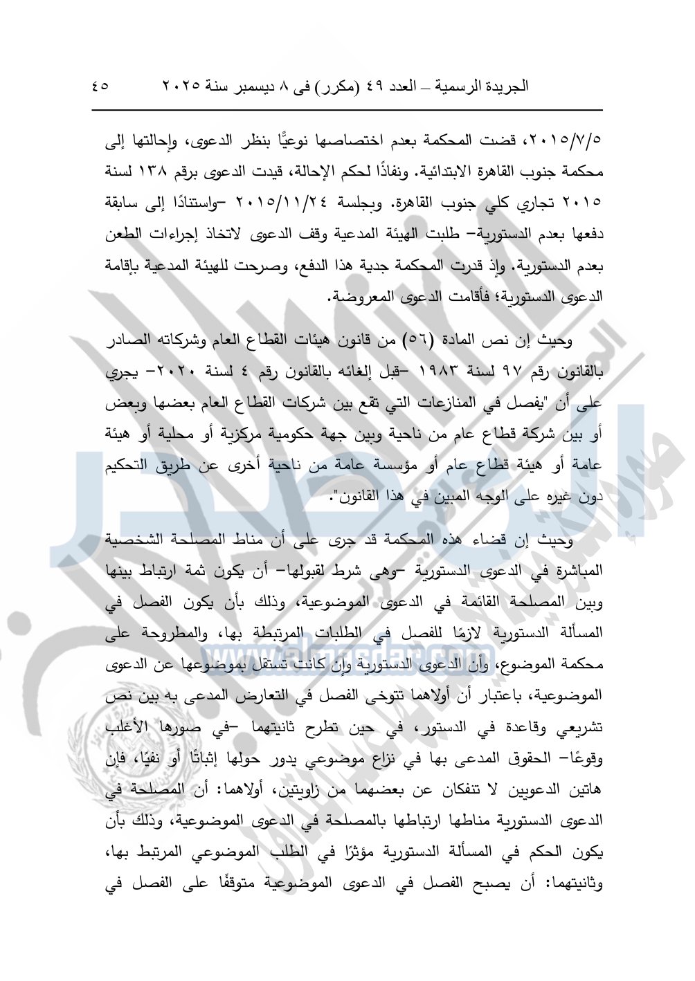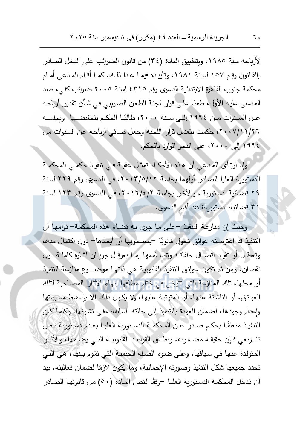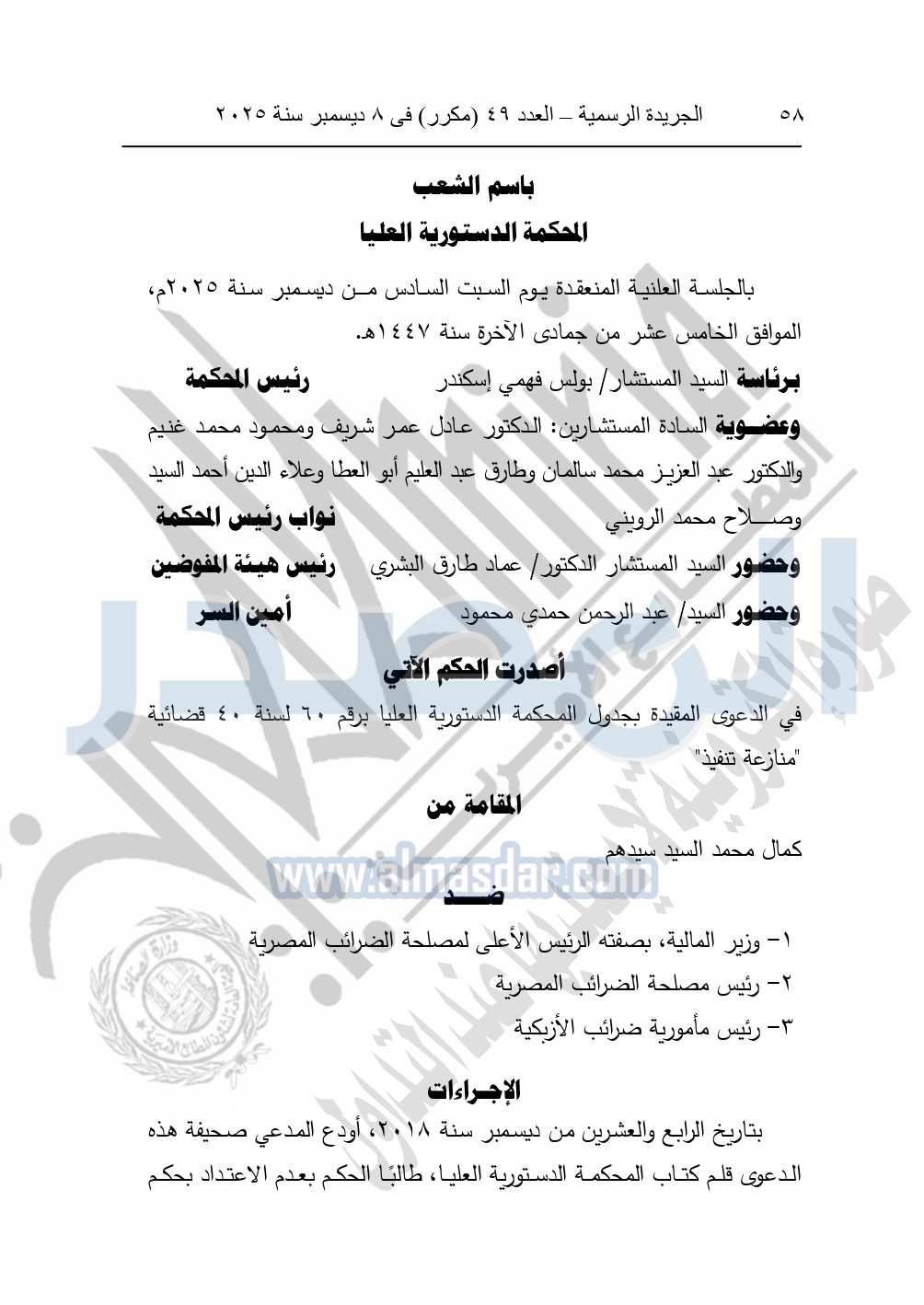 ونشرت الجريدة الرسمية في العدد 49 "مكرر"، في 6 أكتوبر سنة 2025، الأحكام الصادرة من المحكمة الدستورية العليا في عدد من الدعاوي القضائية بجلسة 6 ديسمبر 2025.