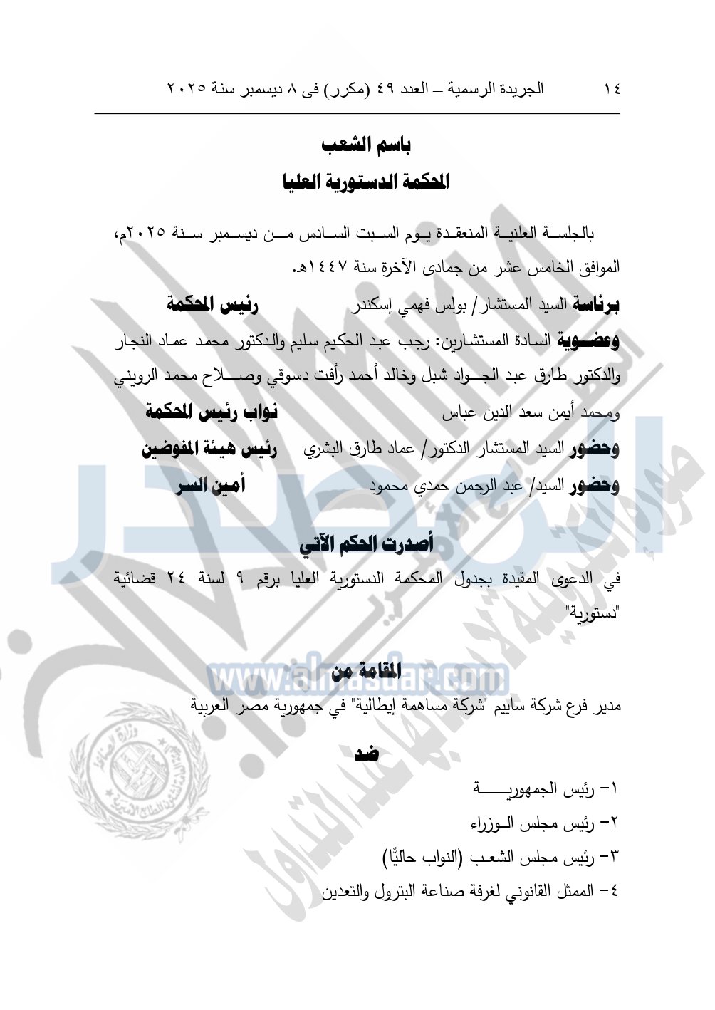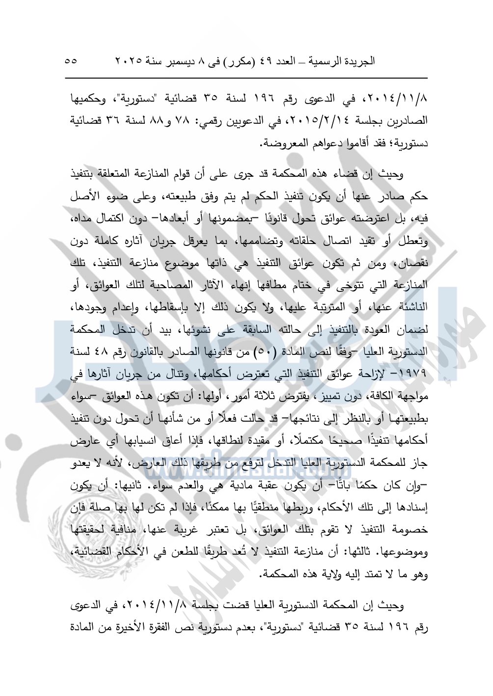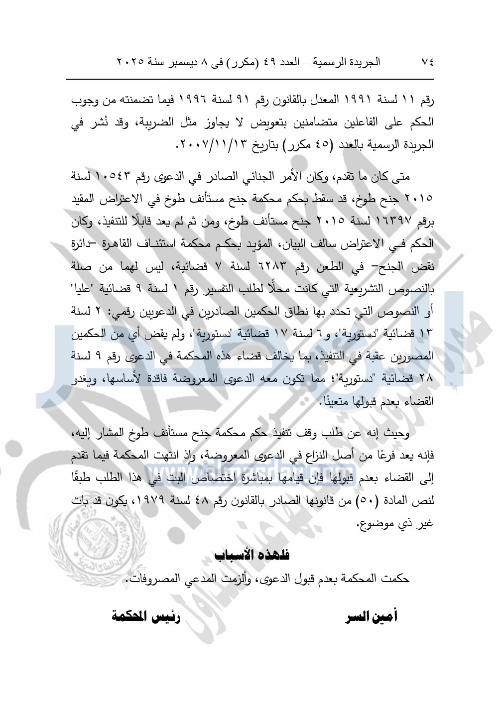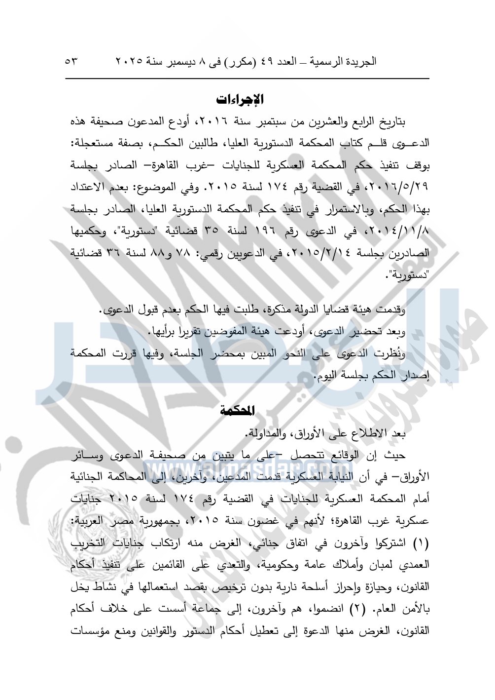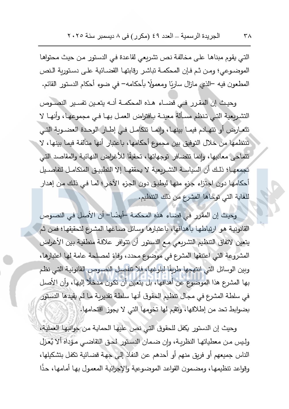 ونشرت الجريدة الرسمية في العدد 49 "مكرر"، في 6 أكتوبر سنة 2025، الأحكام الصادرة من المحكمة الدستورية العليا في عدد من الدعاوي القضائية بجلسة 6 ديسمبر 2025.