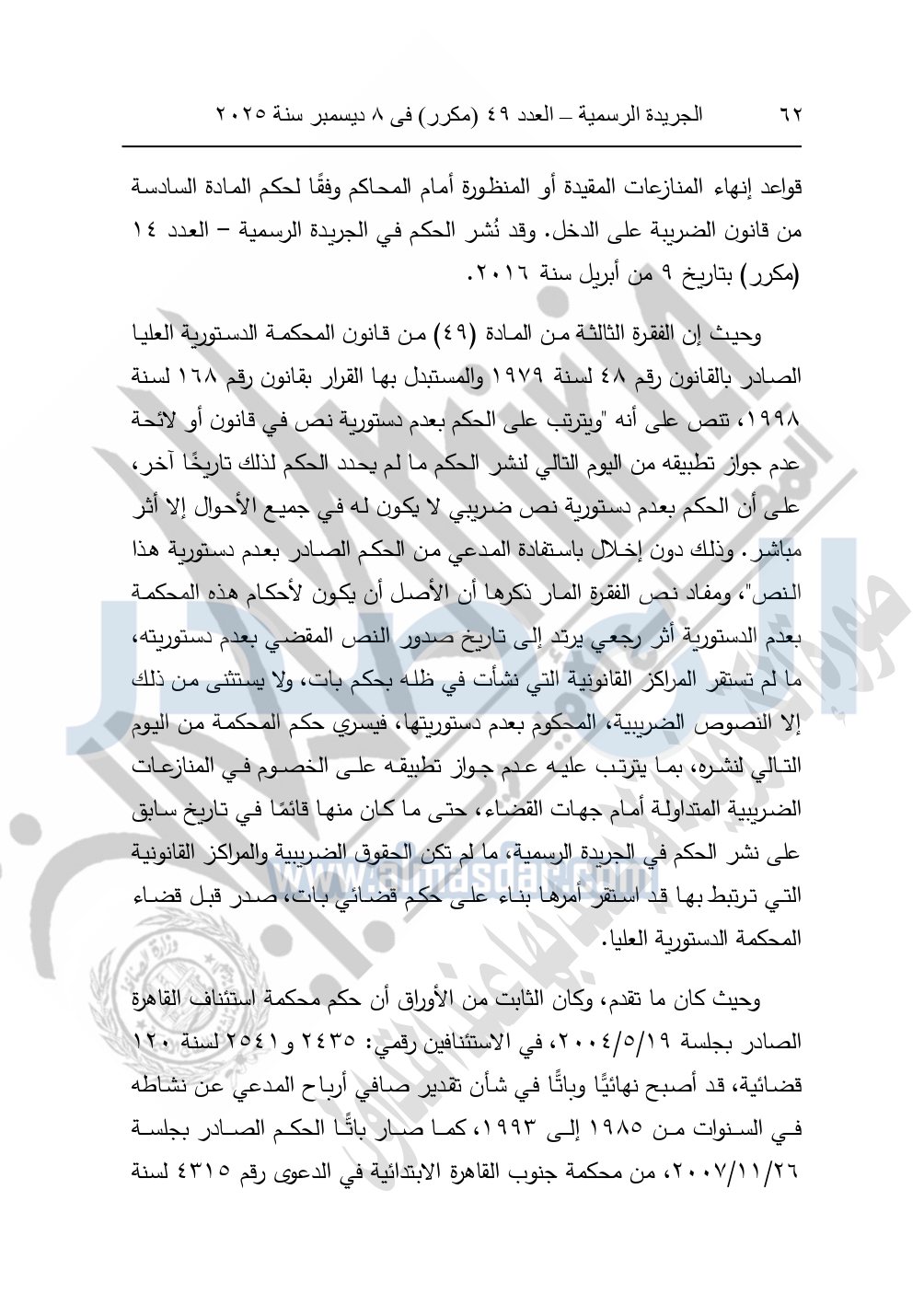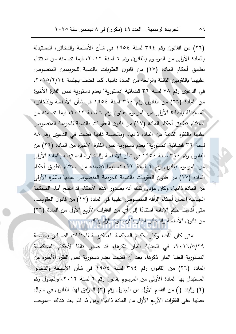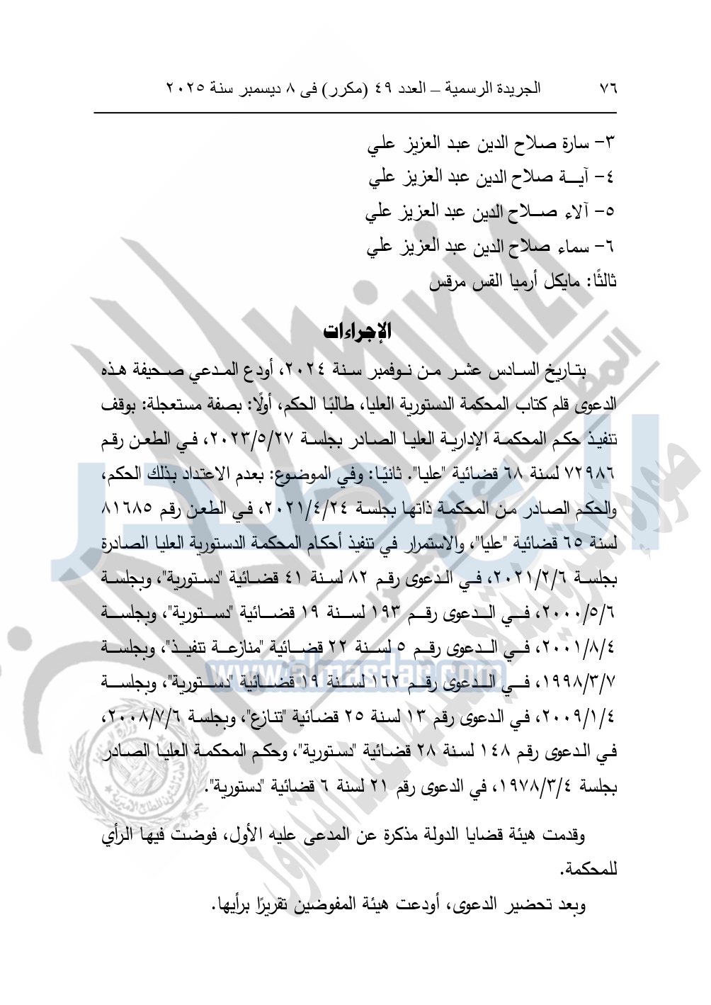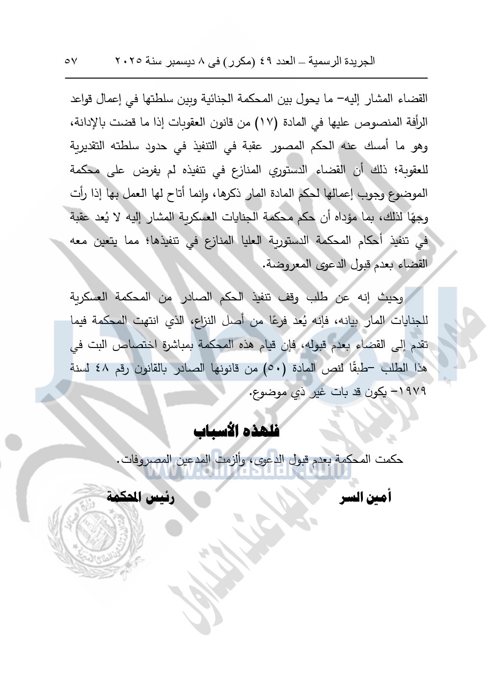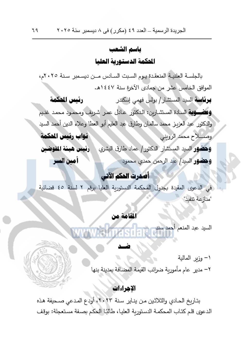 ونشرت الجريدة الرسمية في العدد 49 "مكرر"، في 6 أكتوبر سنة 2025، الأحكام الصادرة من المحكمة الدستورية العليا في عدد من الدعاوي القضائية بجلسة 6 ديسمبر 2025.