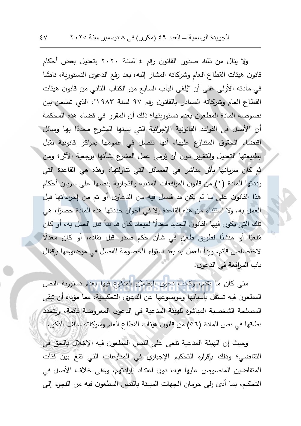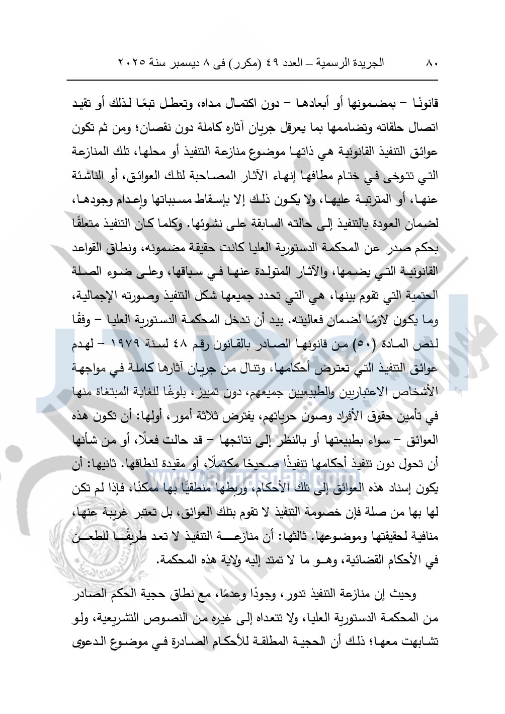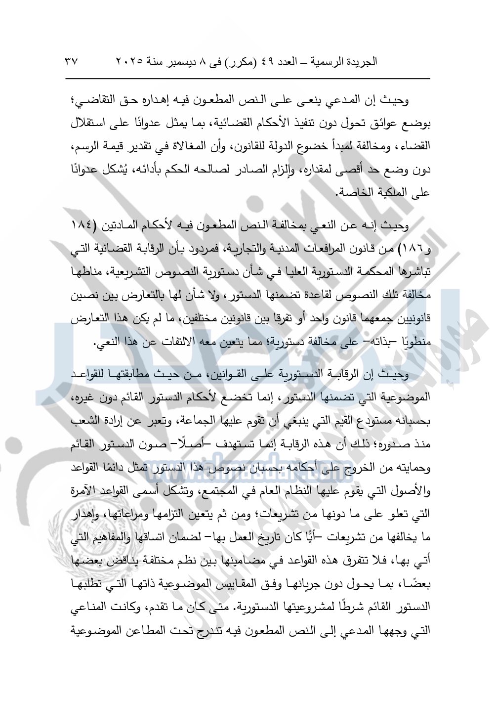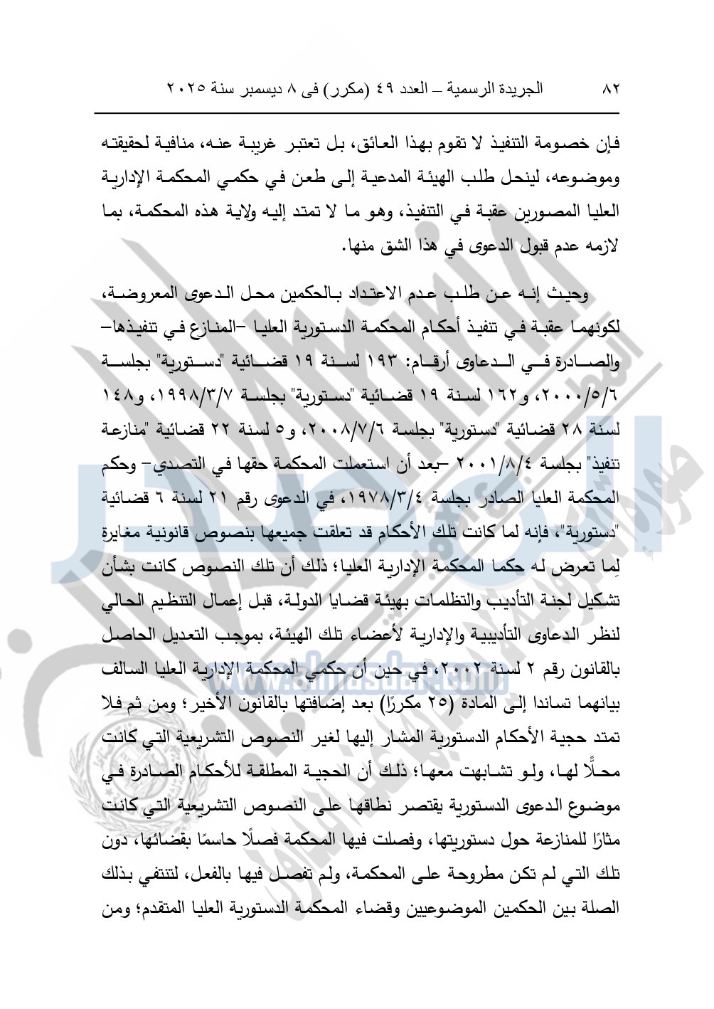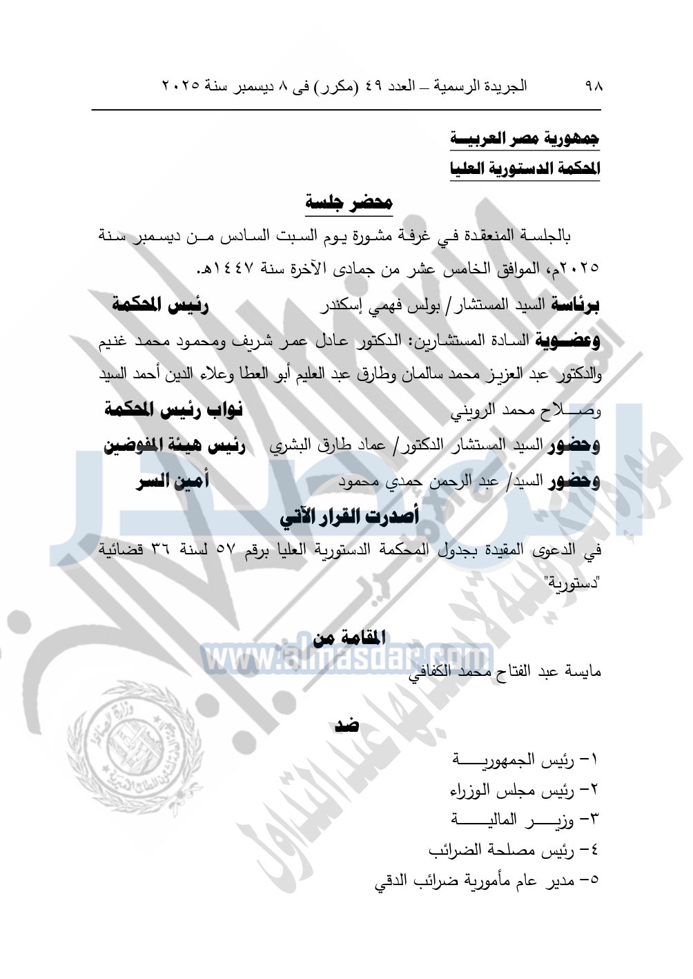 ونشرت الجريدة الرسمية في العدد 49 "مكرر"، في 6 أكتوبر سنة 2025، الأحكام الصادرة من المحكمة الدستورية العليا في عدد من الدعاوي القضائية بجلسة 6 ديسمبر 2025.