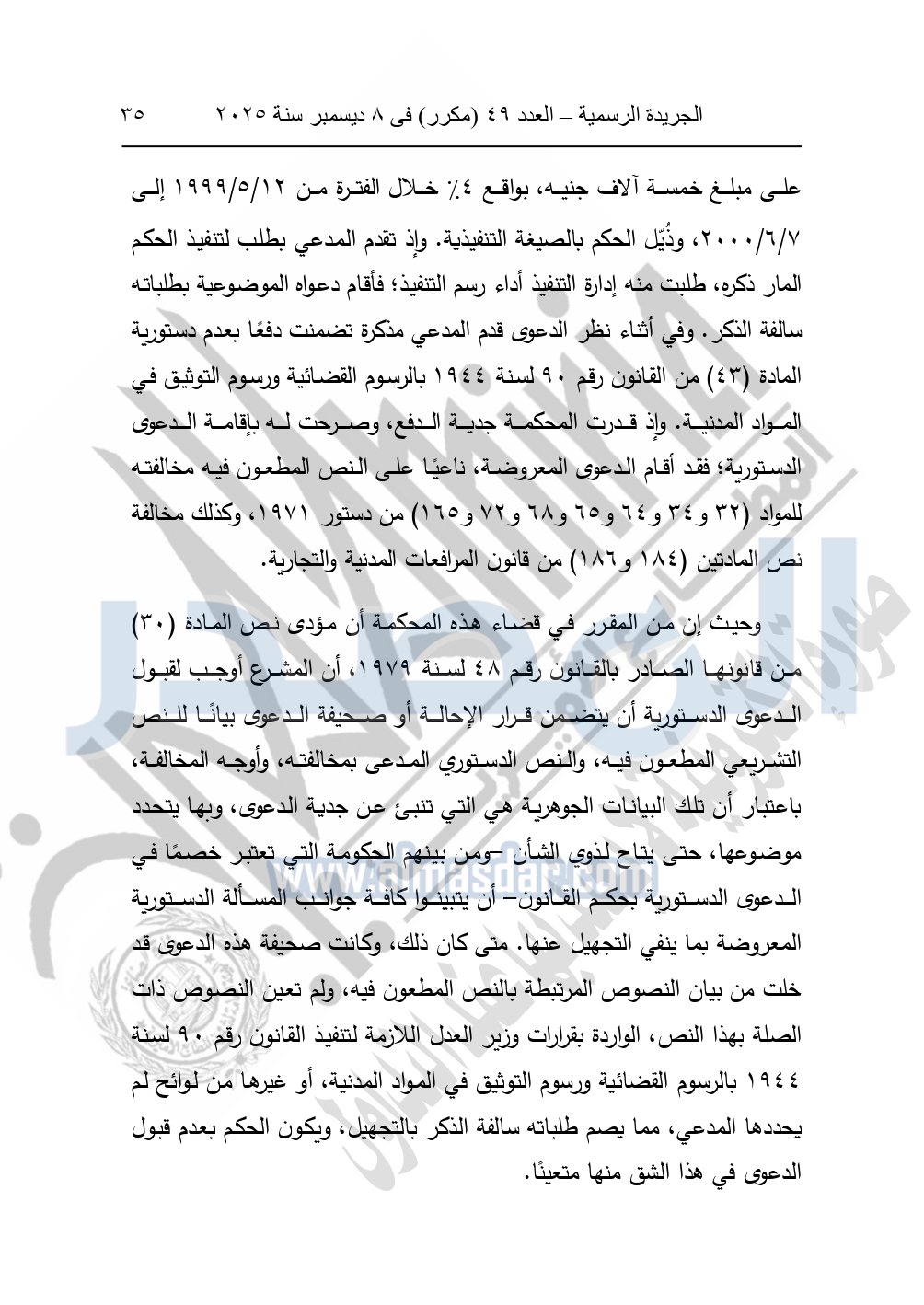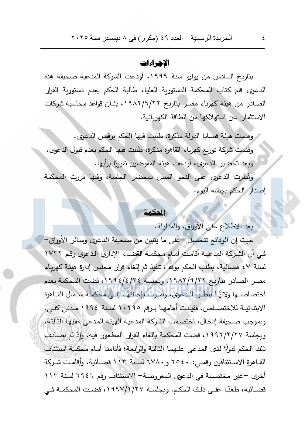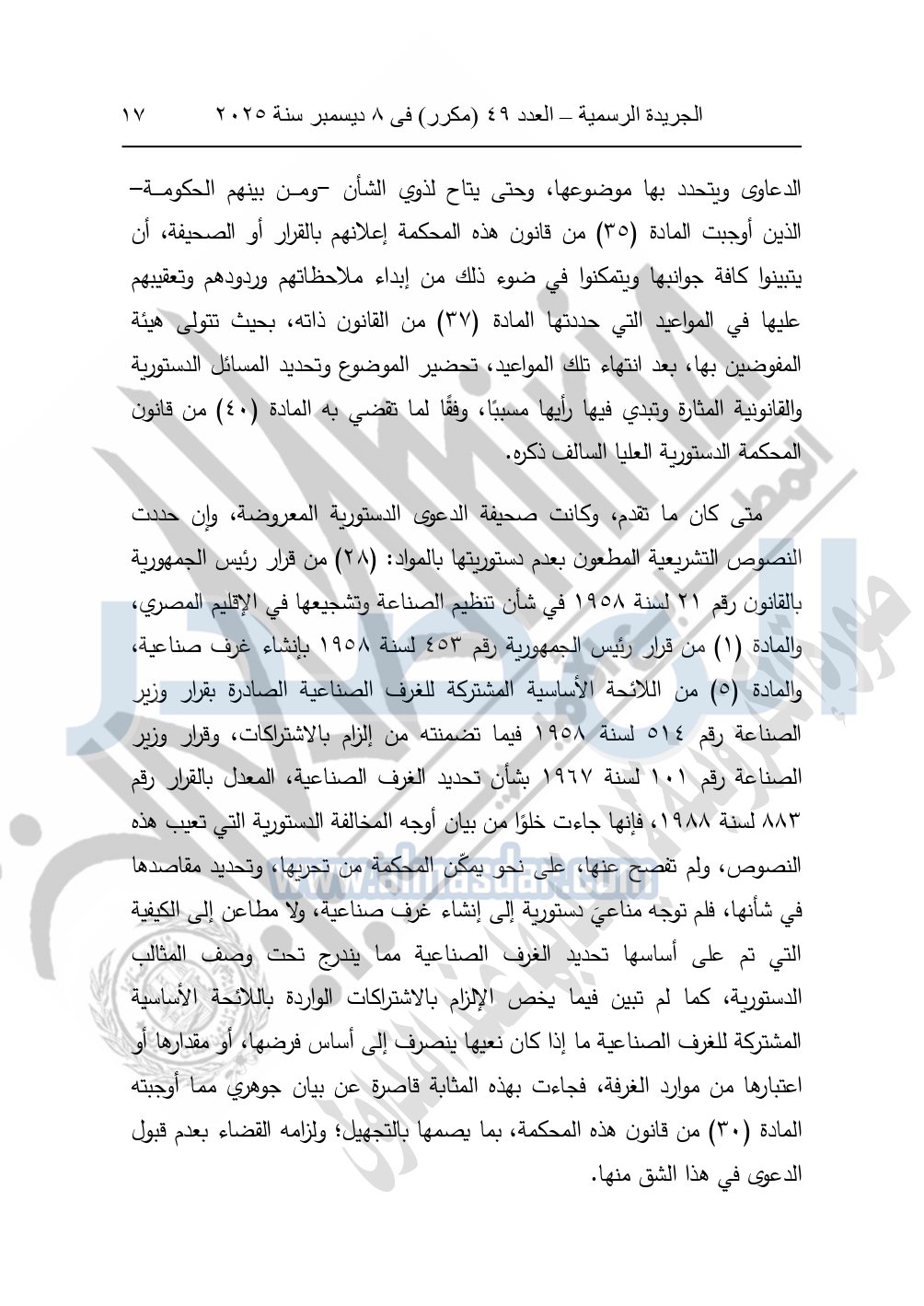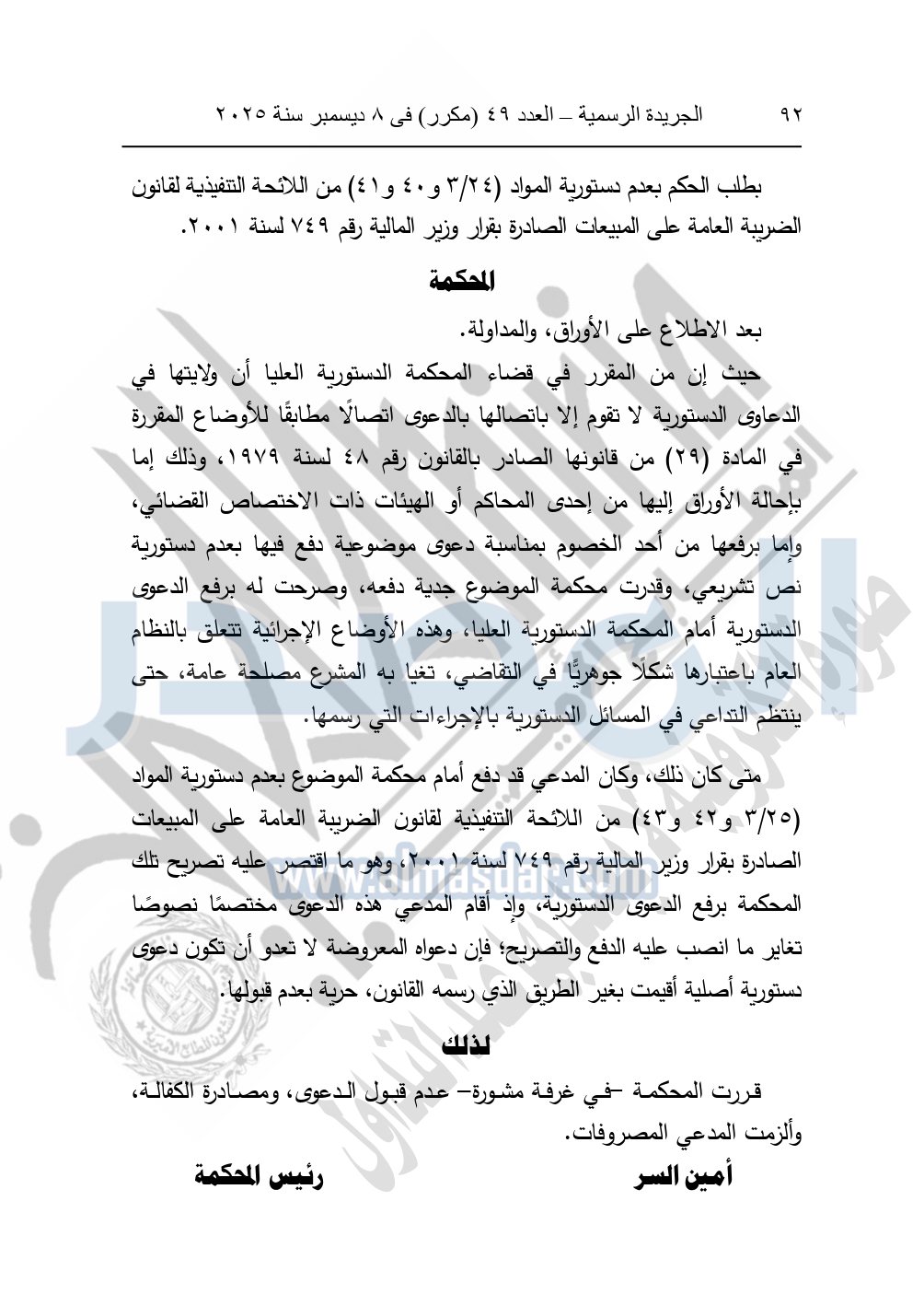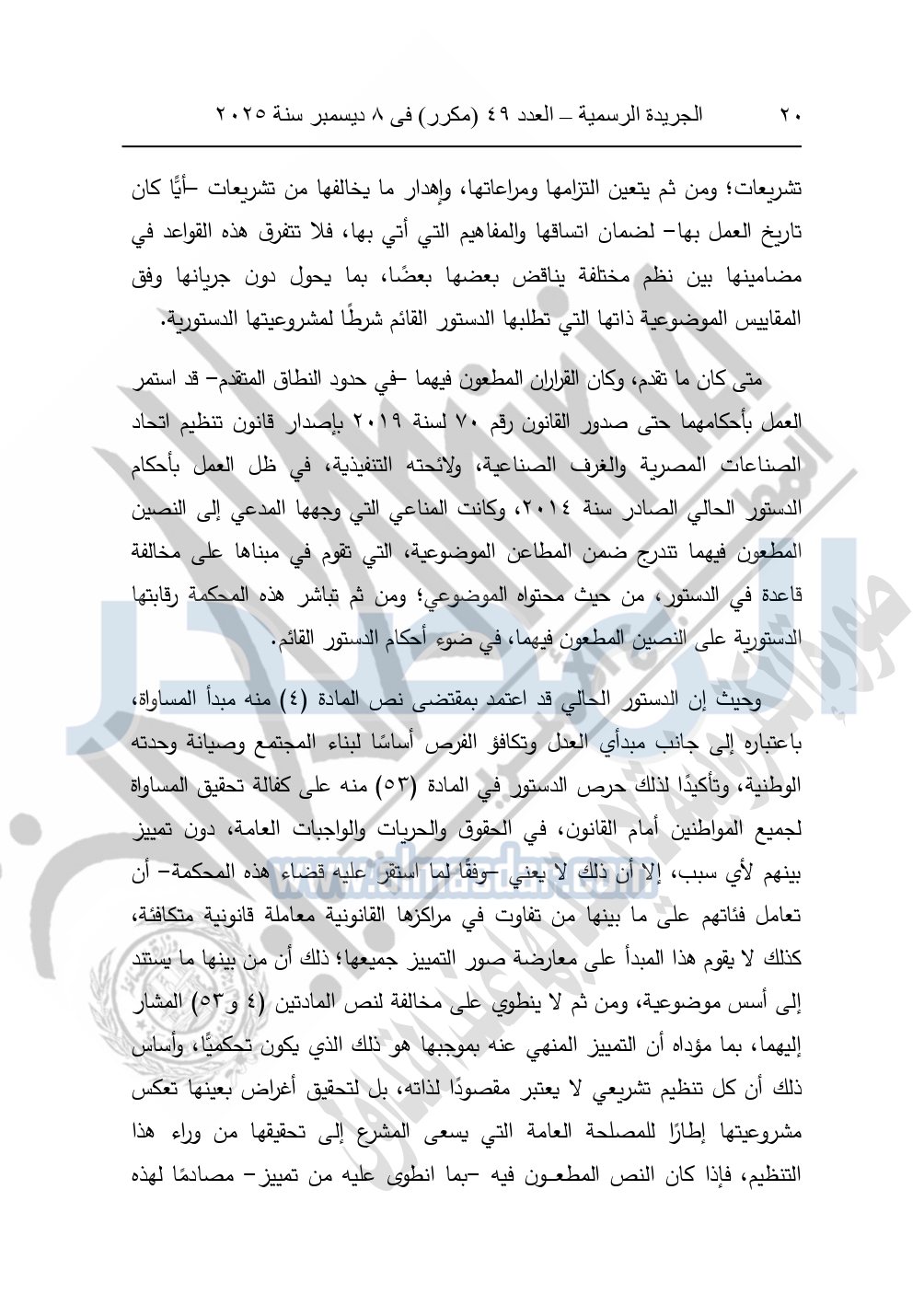 ونشرت الجريدة الرسمية في العدد 49 "مكرر"، في 6 أكتوبر سنة 2025، الأحكام الصادرة من المحكمة الدستورية العليا في عدد من الدعاوي القضائية بجلسة 6 ديسمبر 2025.