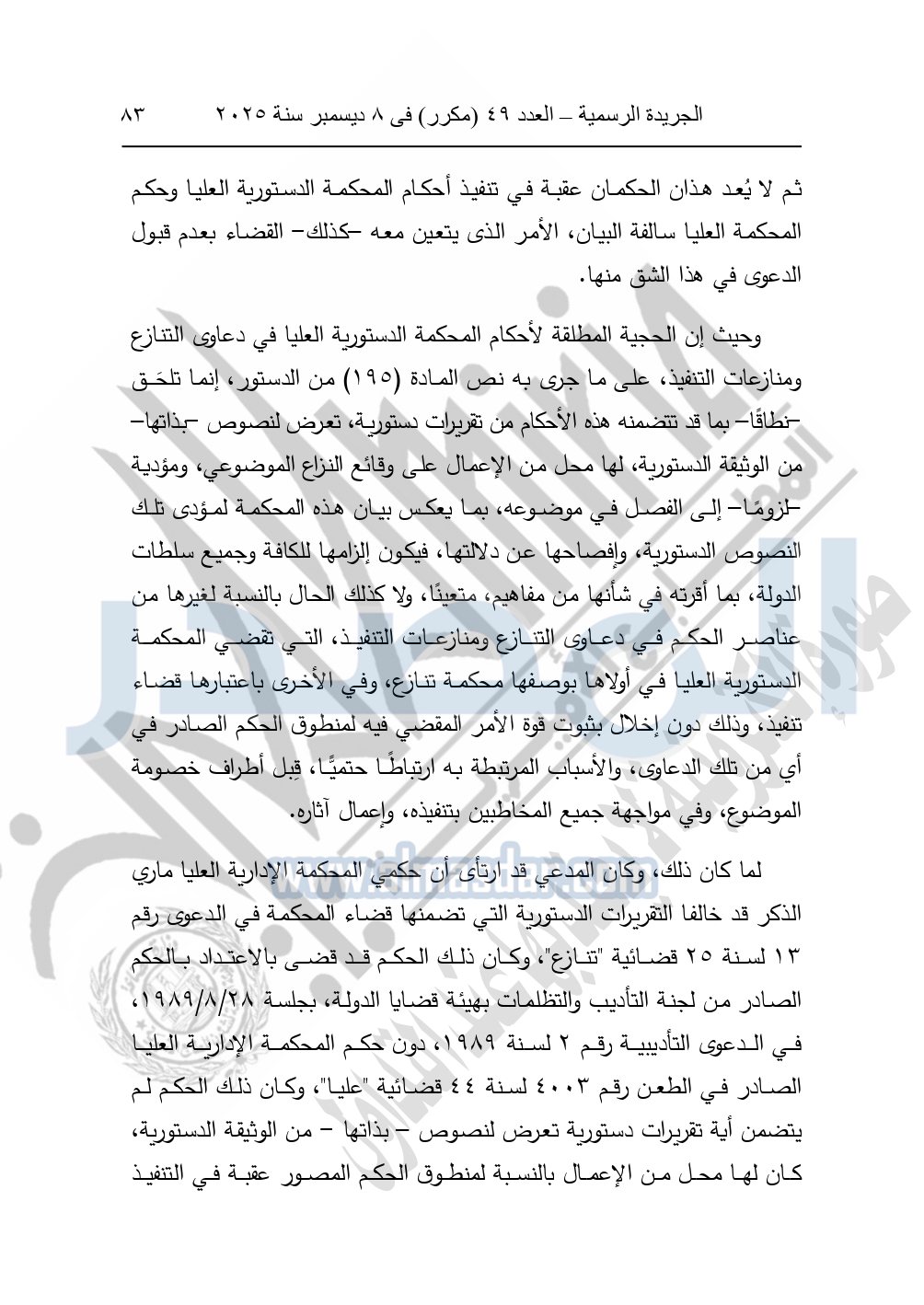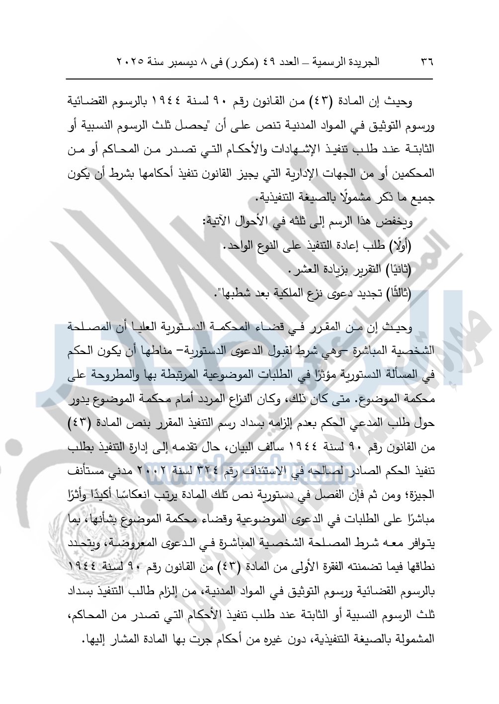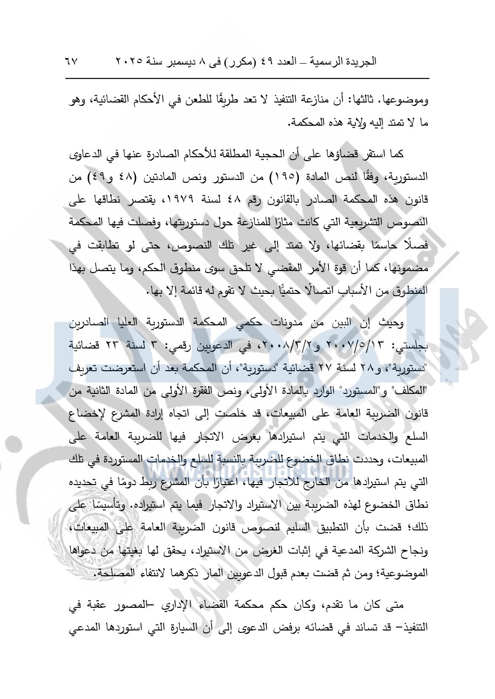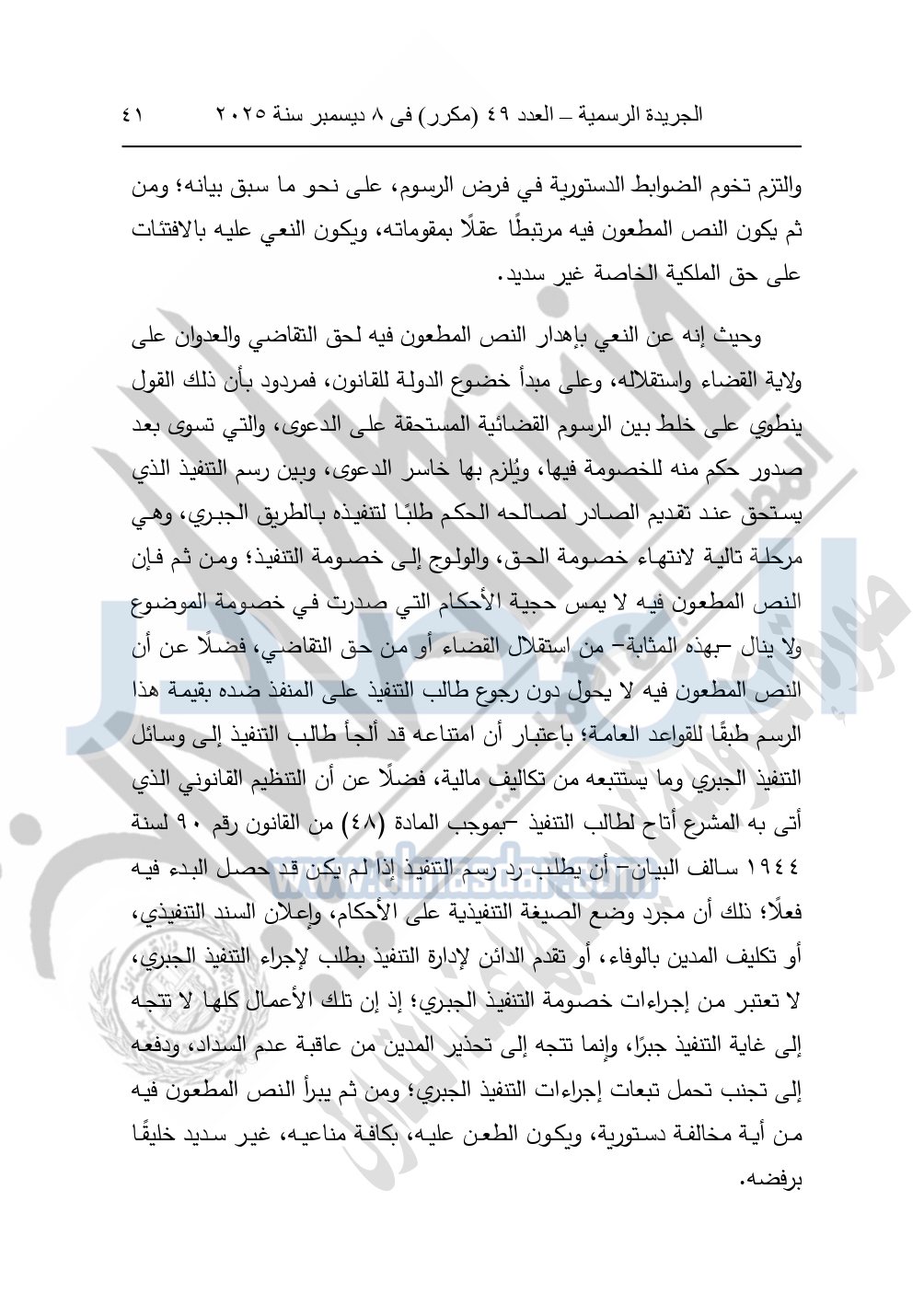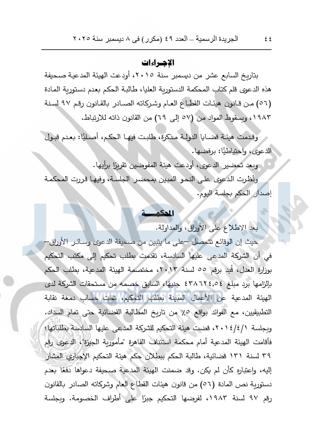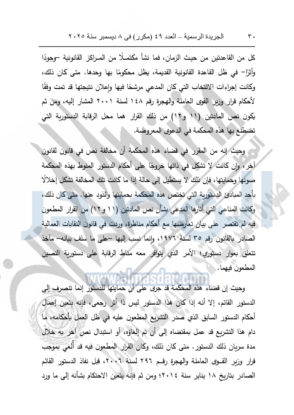 ونشرت الجريدة الرسمية في العدد 49 "مكرر"، في 6 أكتوبر سنة 2025، الأحكام الصادرة من المحكمة الدستورية العليا في عدد من الدعاوي القضائية بجلسة 6 ديسمبر 2025.