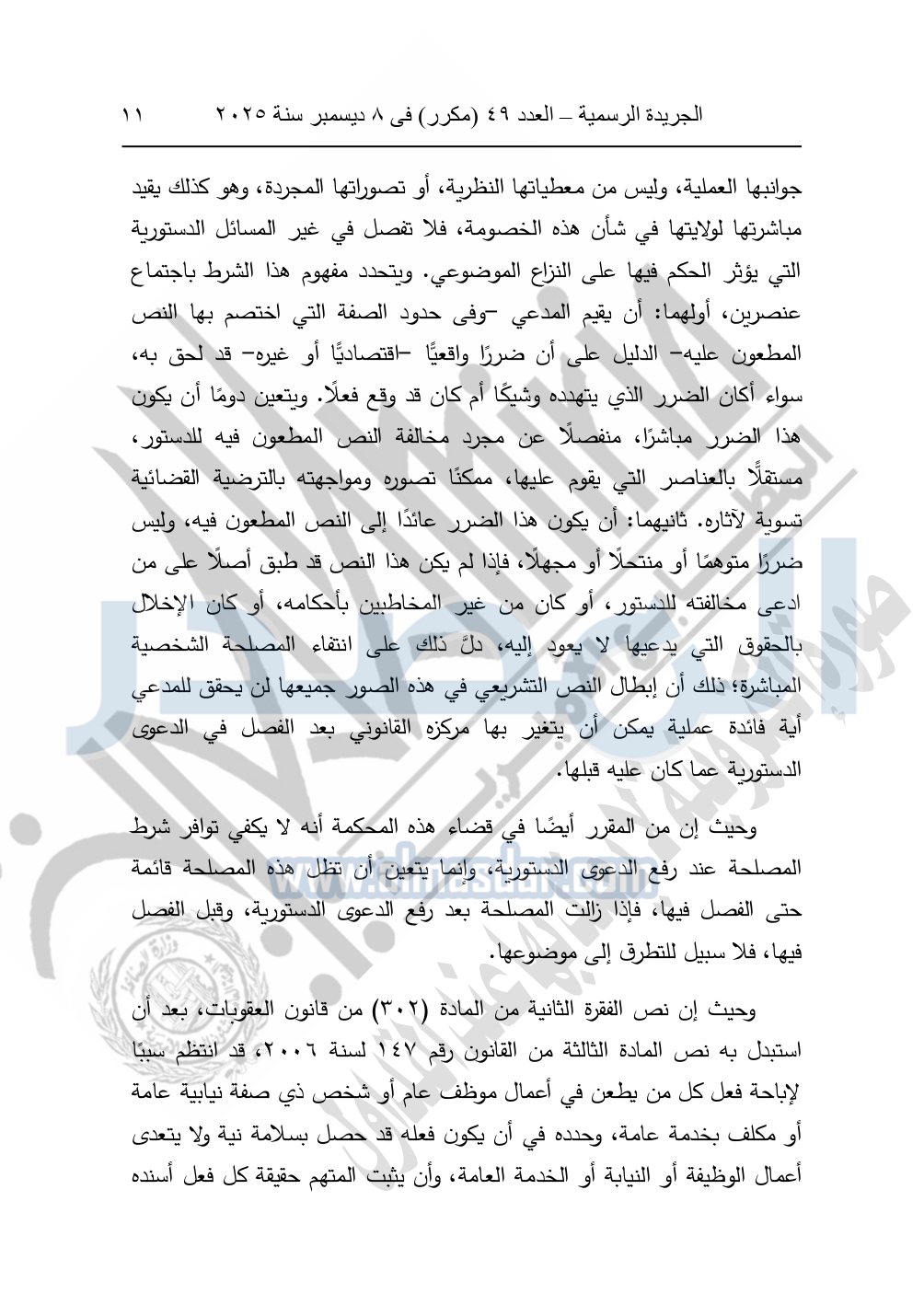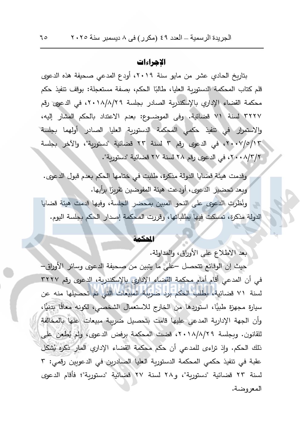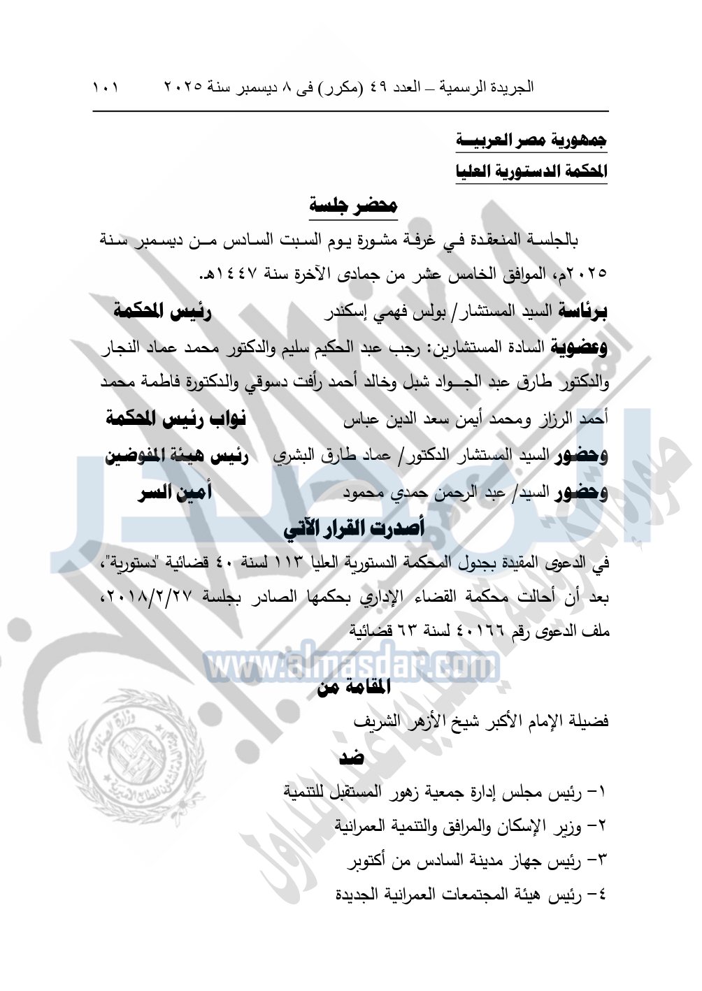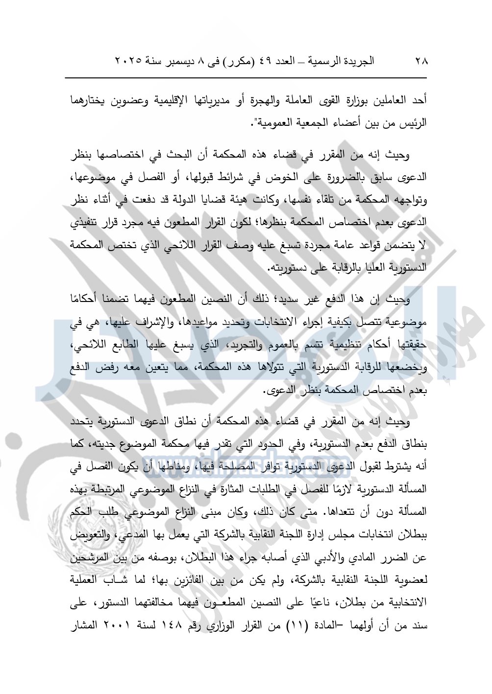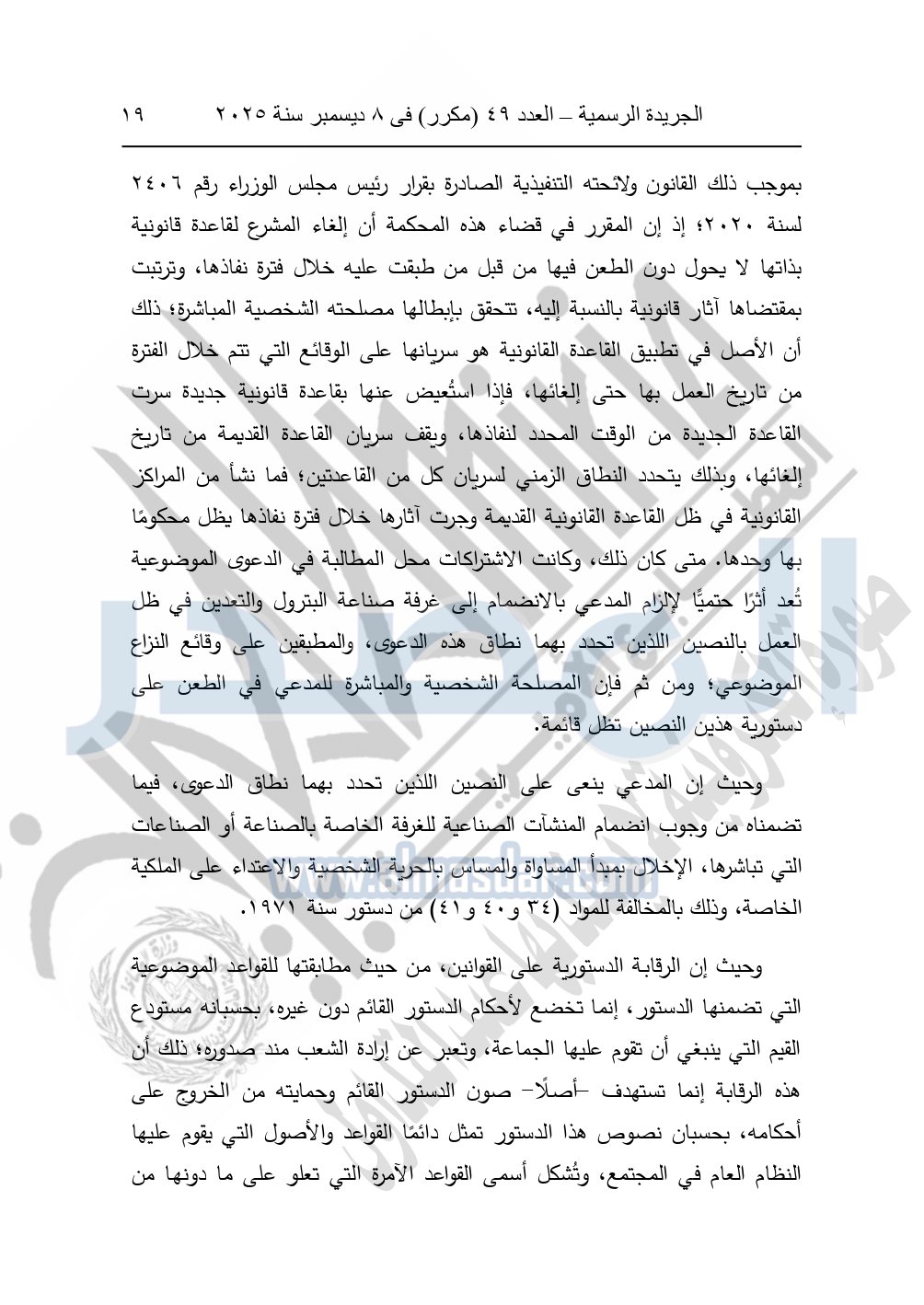 ونشرت الجريدة الرسمية في العدد 49 "مكرر"، في 6 أكتوبر سنة 2025، الأحكام الصادرة من المحكمة الدستورية العليا في عدد من الدعاوي القضائية بجلسة 6 ديسمبر 2025.