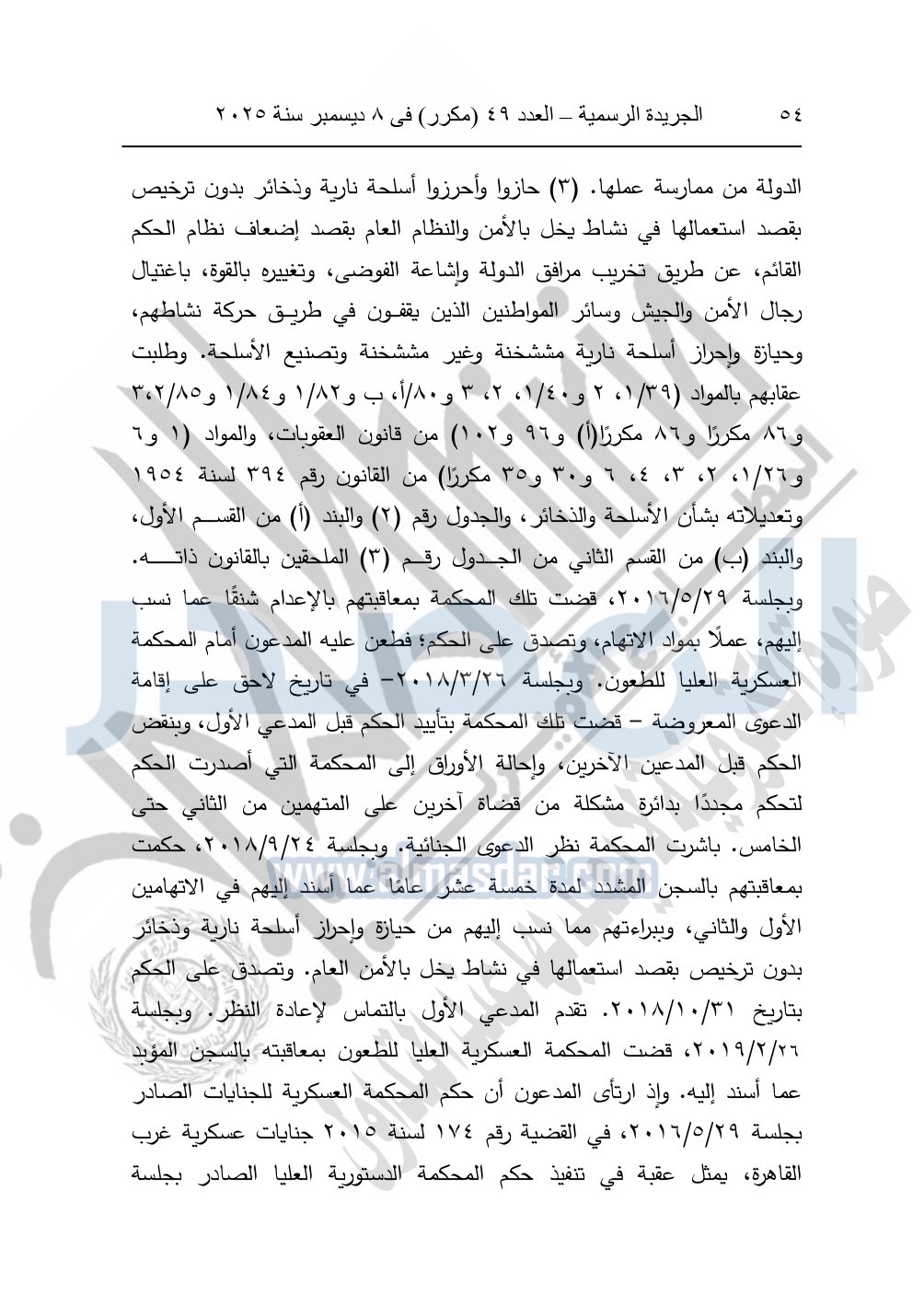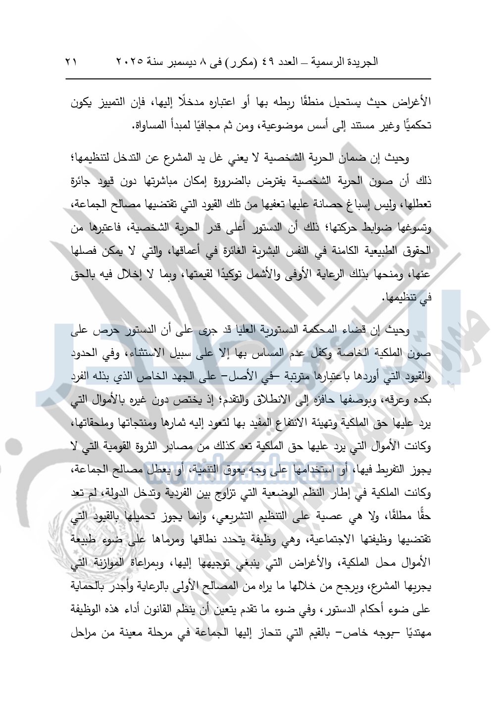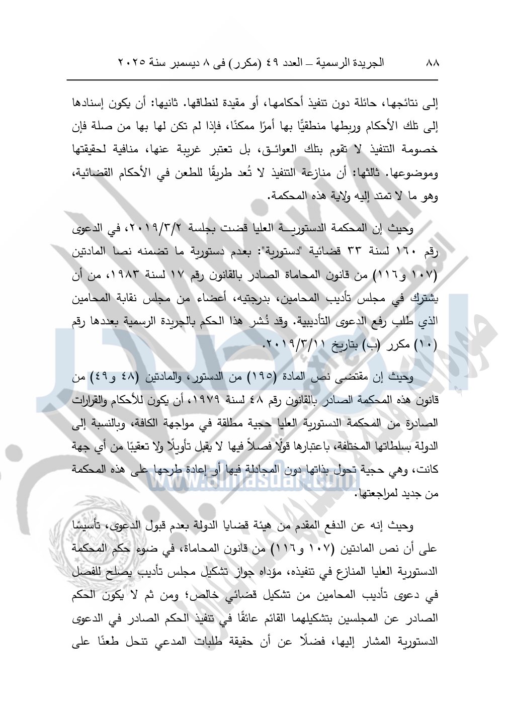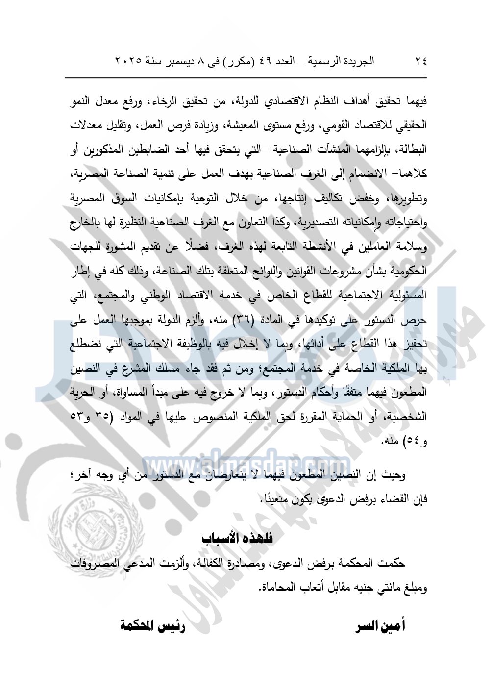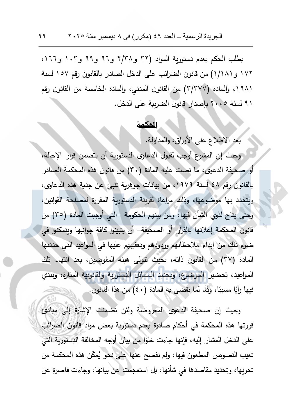 ونشرت الجريدة الرسمية في العدد 49 "مكرر"، في 6 أكتوبر سنة 2025، الأحكام الصادرة من المحكمة الدستورية العليا في عدد من الدعاوي القضائية بجلسة 6 ديسمبر 2025.