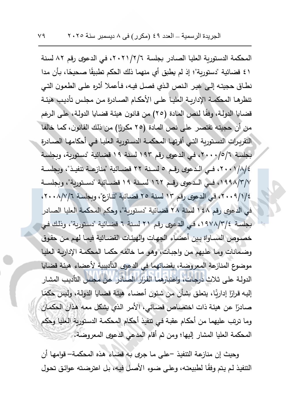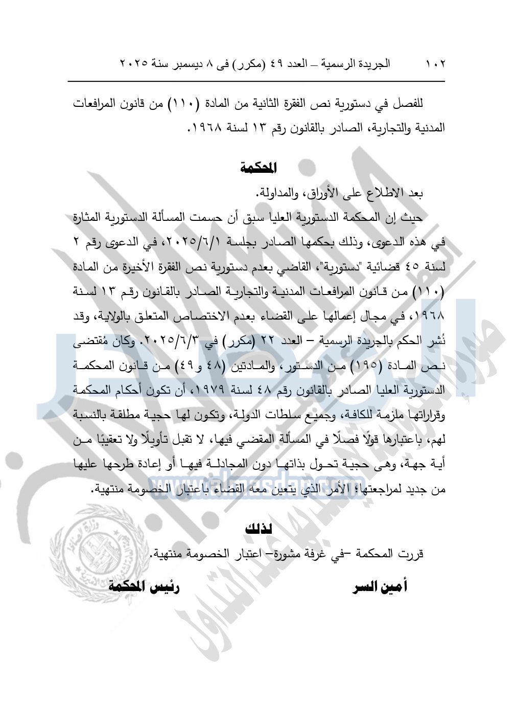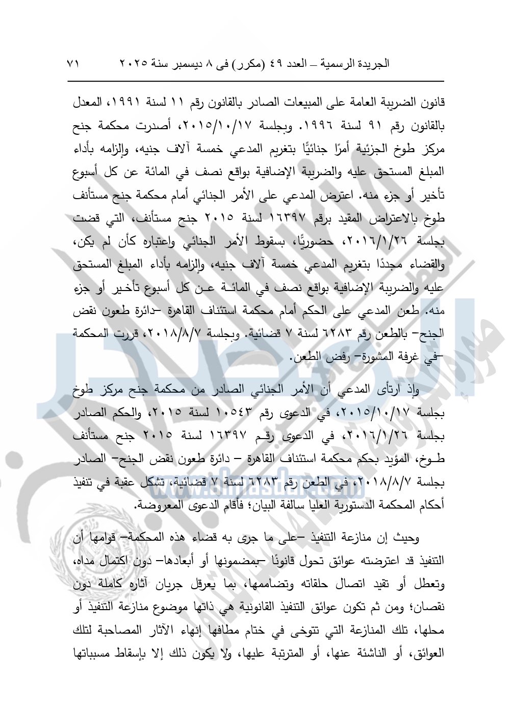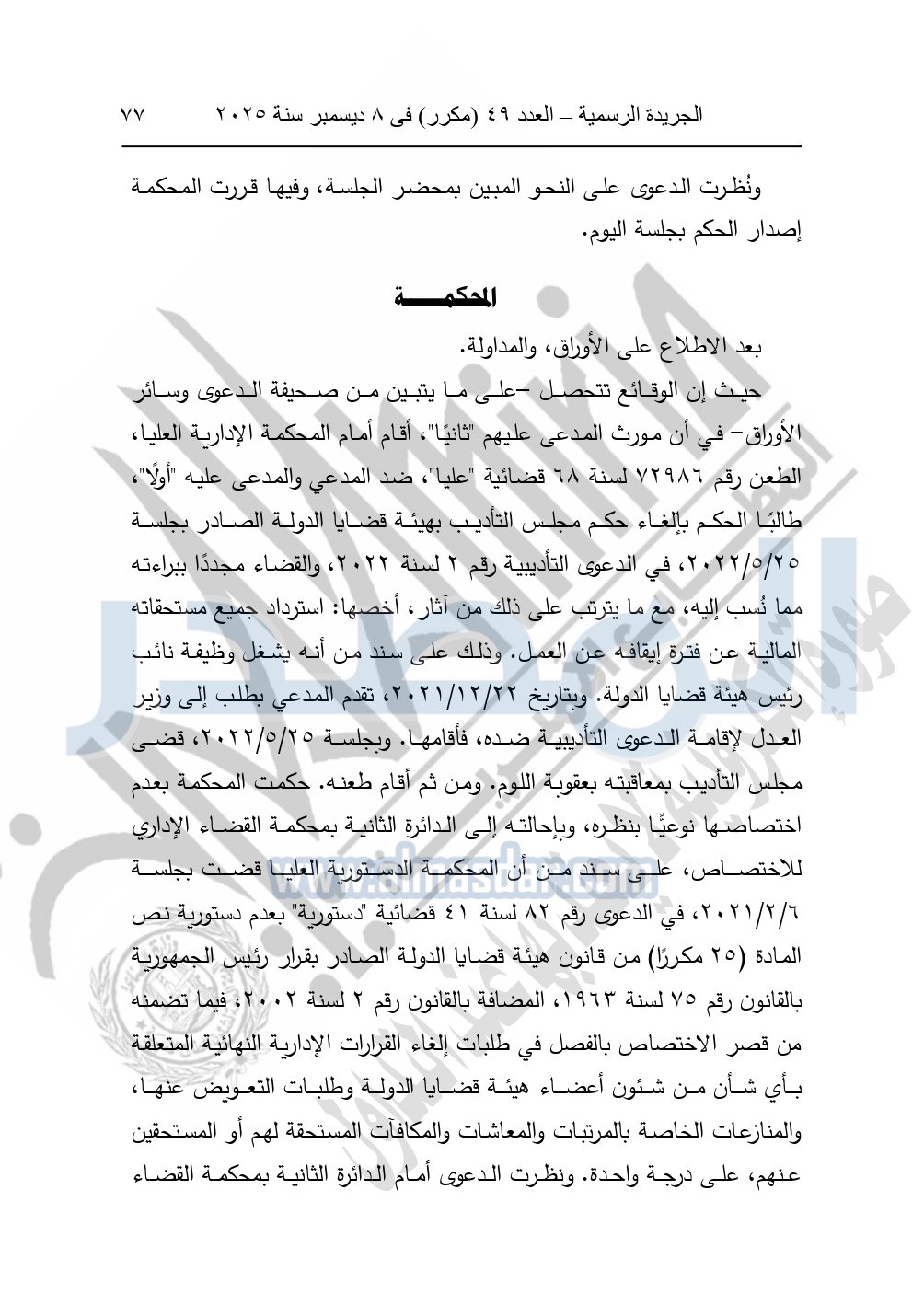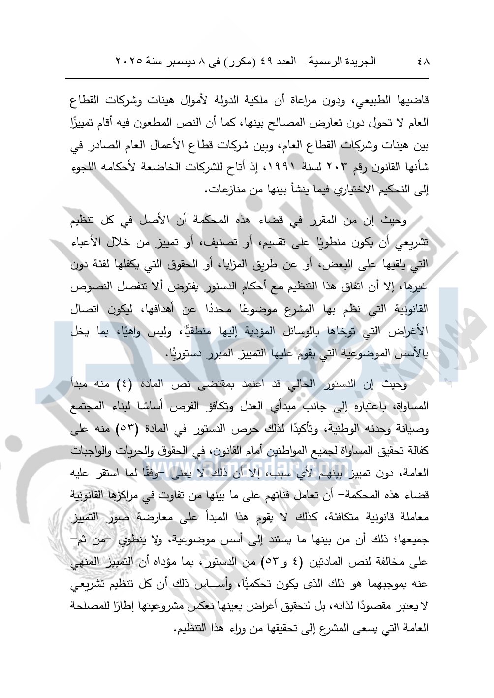 ونشرت الجريدة الرسمية في العدد 49 "مكرر"، في 6 أكتوبر سنة 2025، الأحكام الصادرة من المحكمة الدستورية العليا في عدد من الدعاوي القضائية بجلسة 6 ديسمبر 2025.