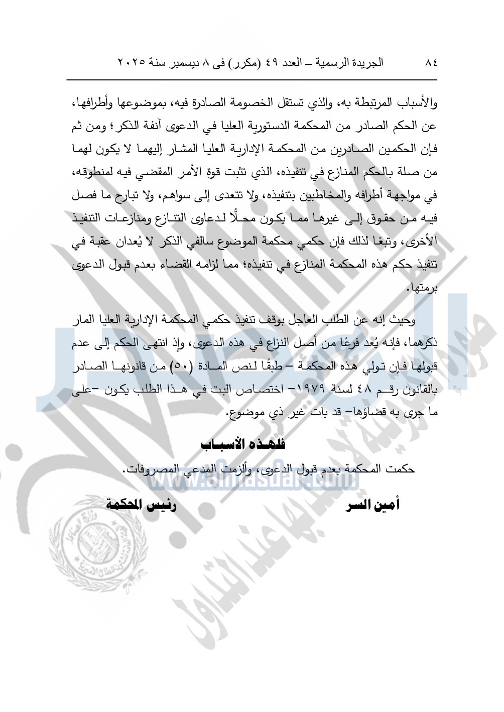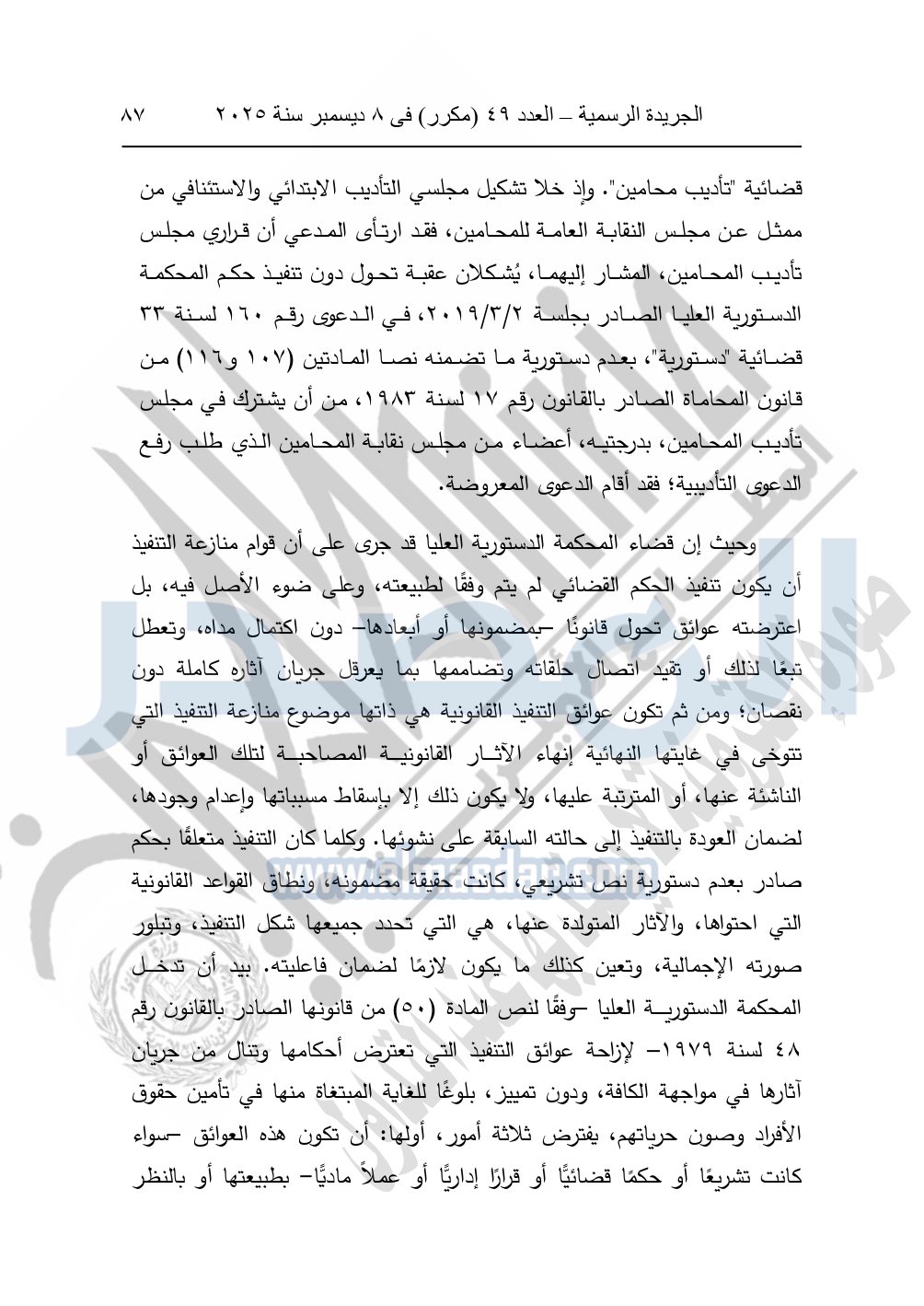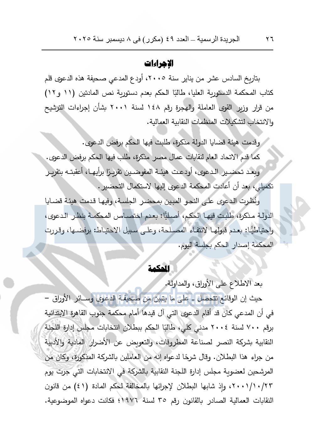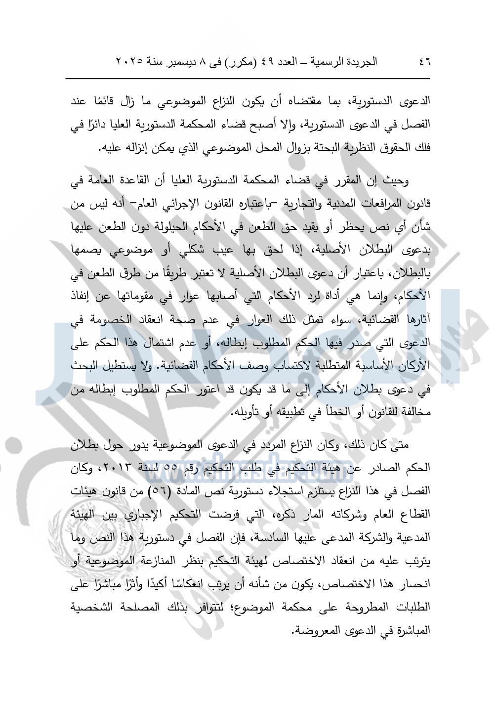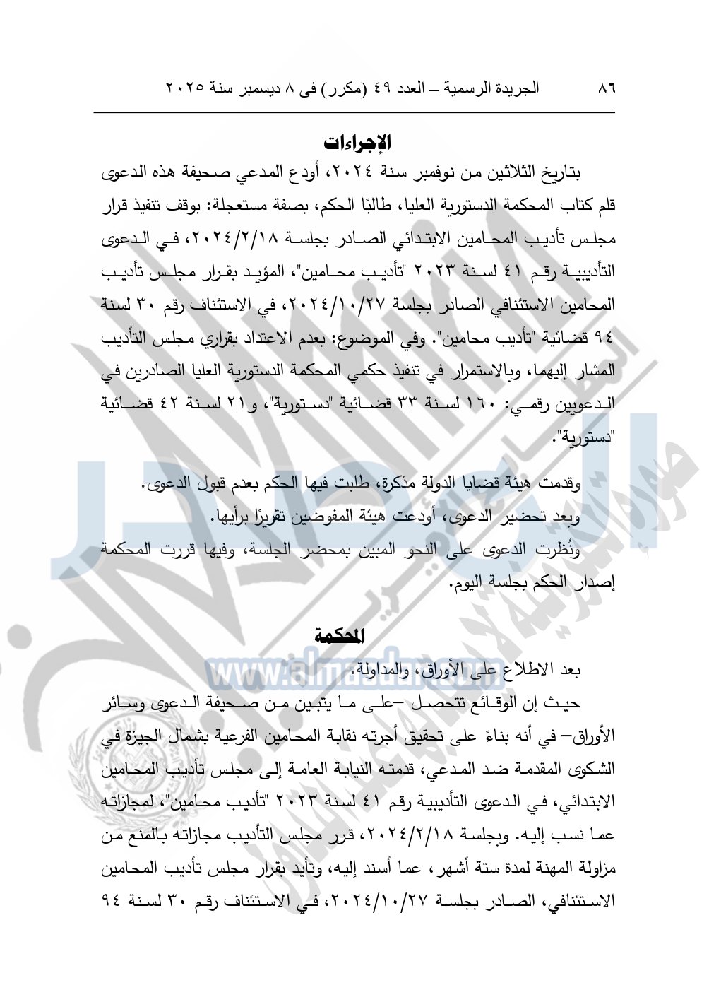 ونشرت الجريدة الرسمية في العدد 49 "مكرر"، في 6 أكتوبر سنة 2025، الأحكام الصادرة من المحكمة الدستورية العليا في عدد من الدعاوي القضائية بجلسة 6 ديسمبر 2025.