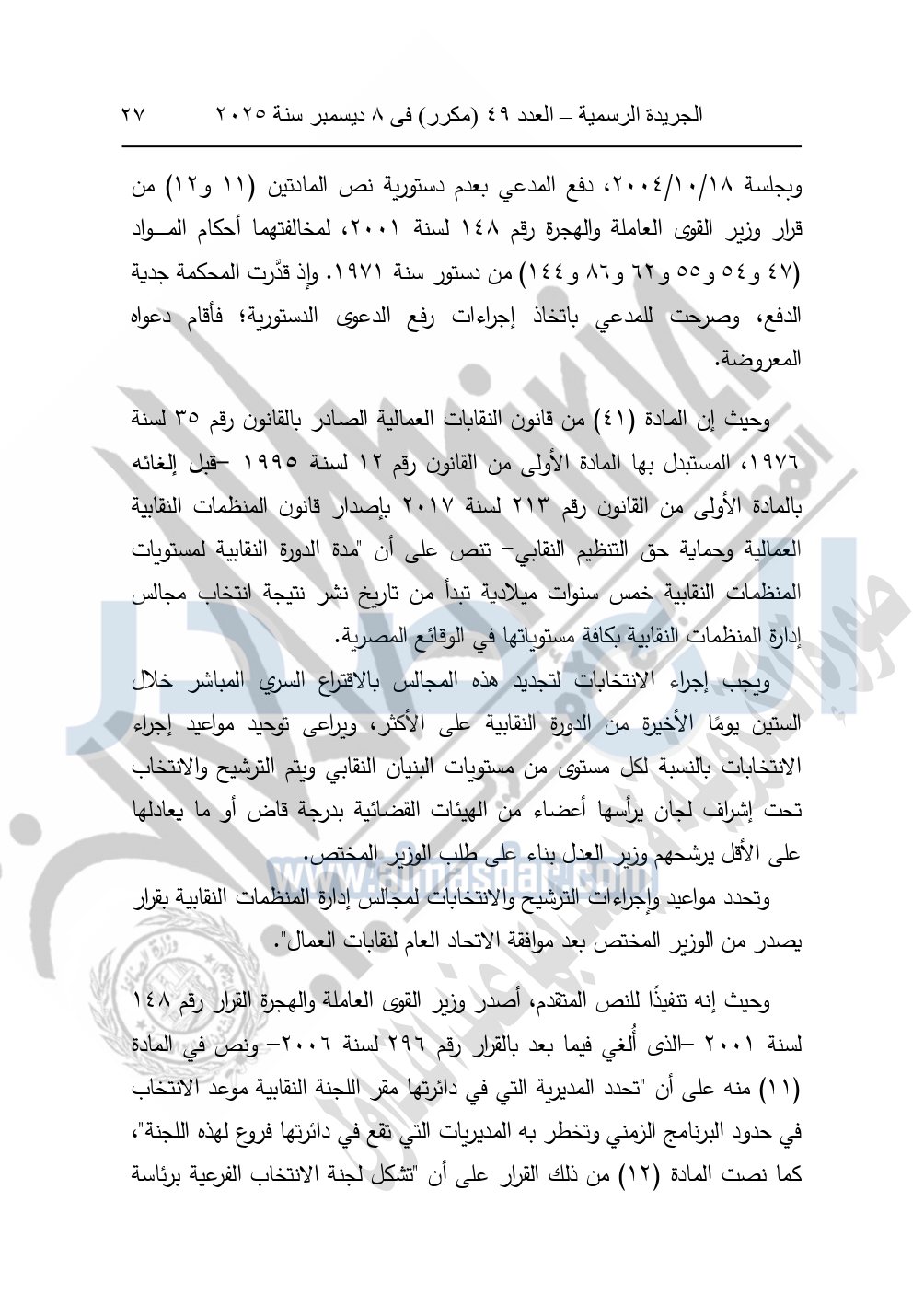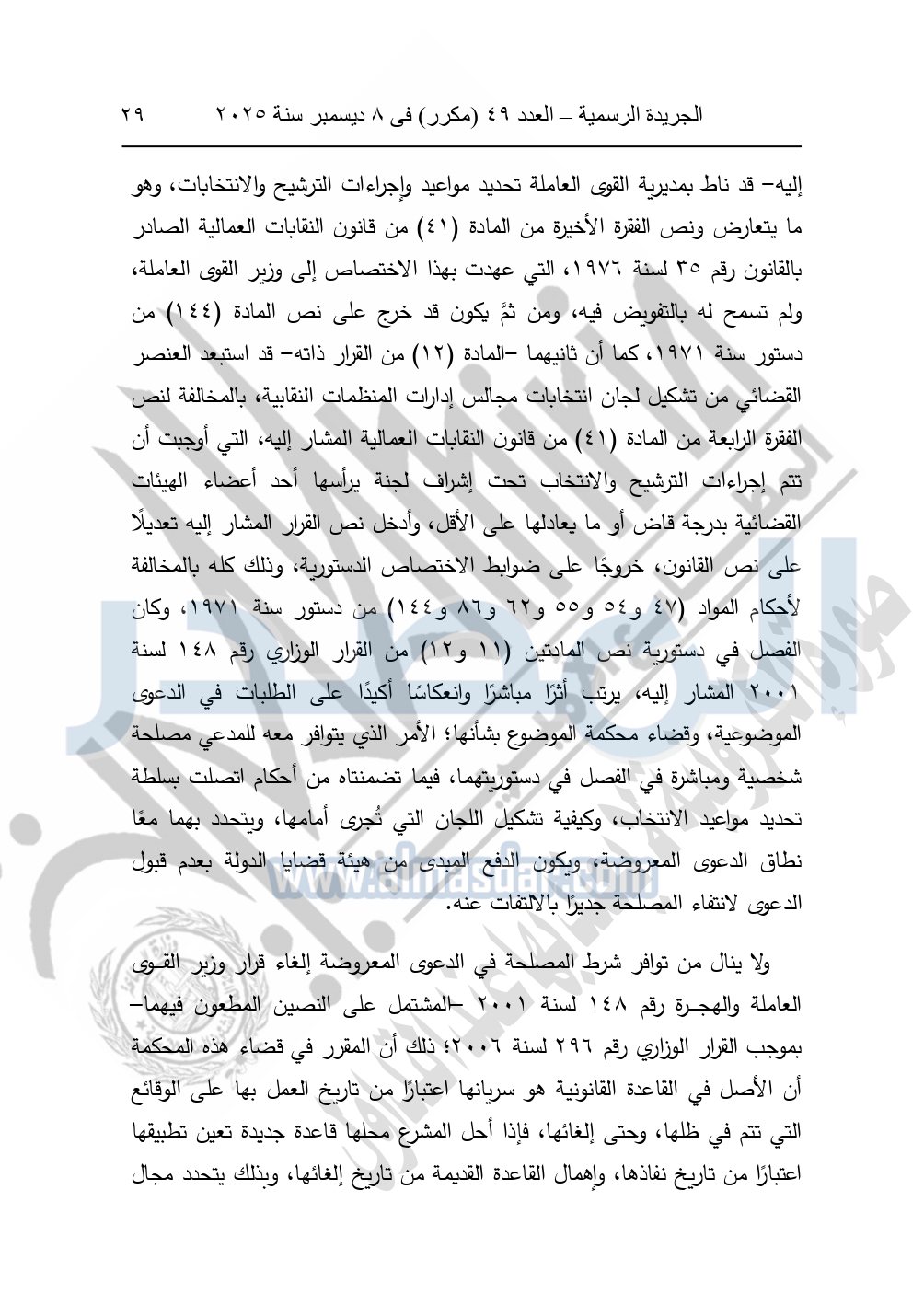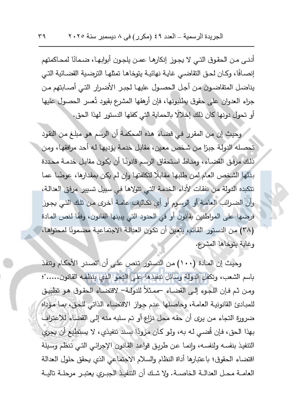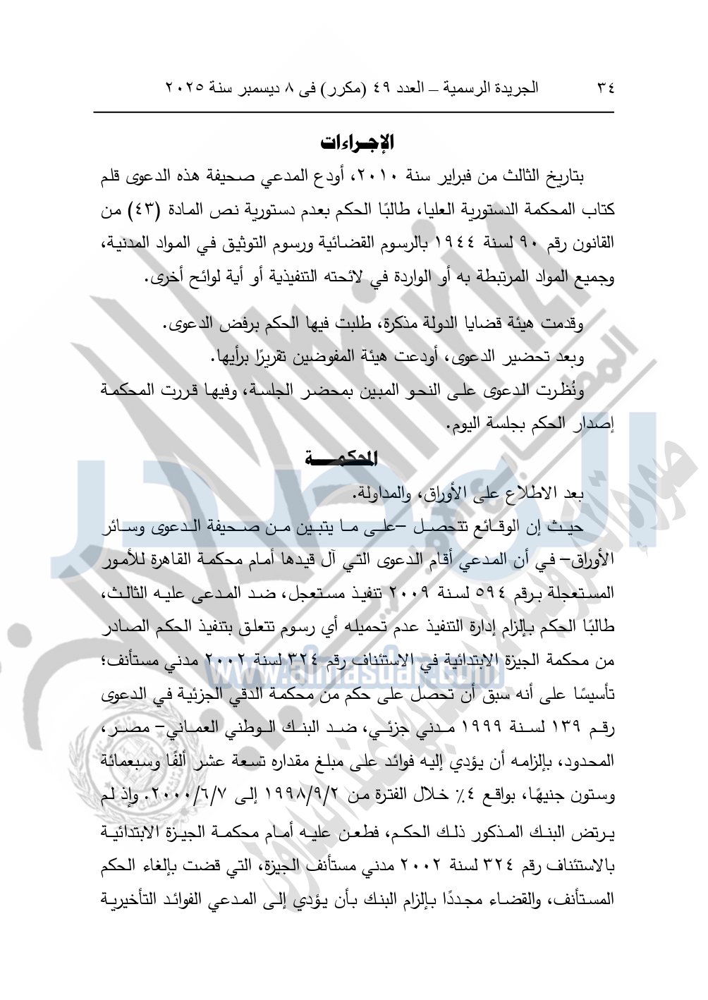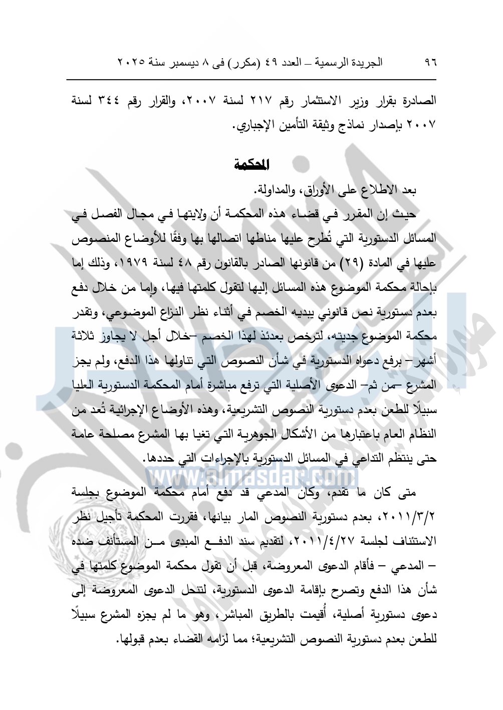 ونشرت الجريدة الرسمية في العدد 49 "مكرر"، في 6 أكتوبر سنة 2025، الأحكام الصادرة من المحكمة الدستورية العليا في عدد من الدعاوي القضائية بجلسة 6 ديسمبر 2025.