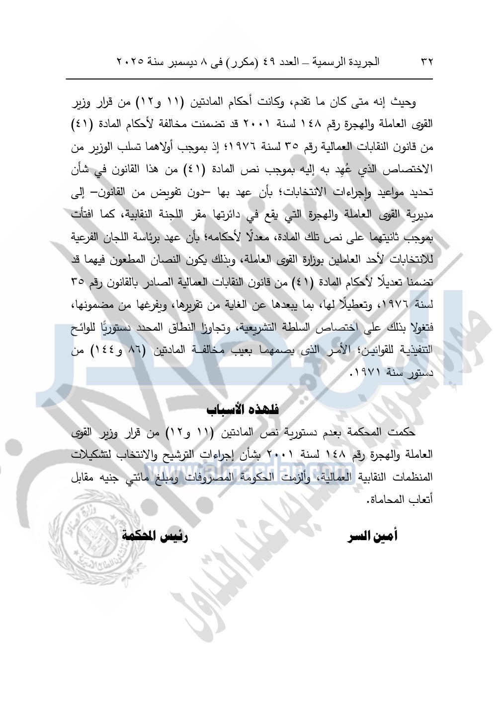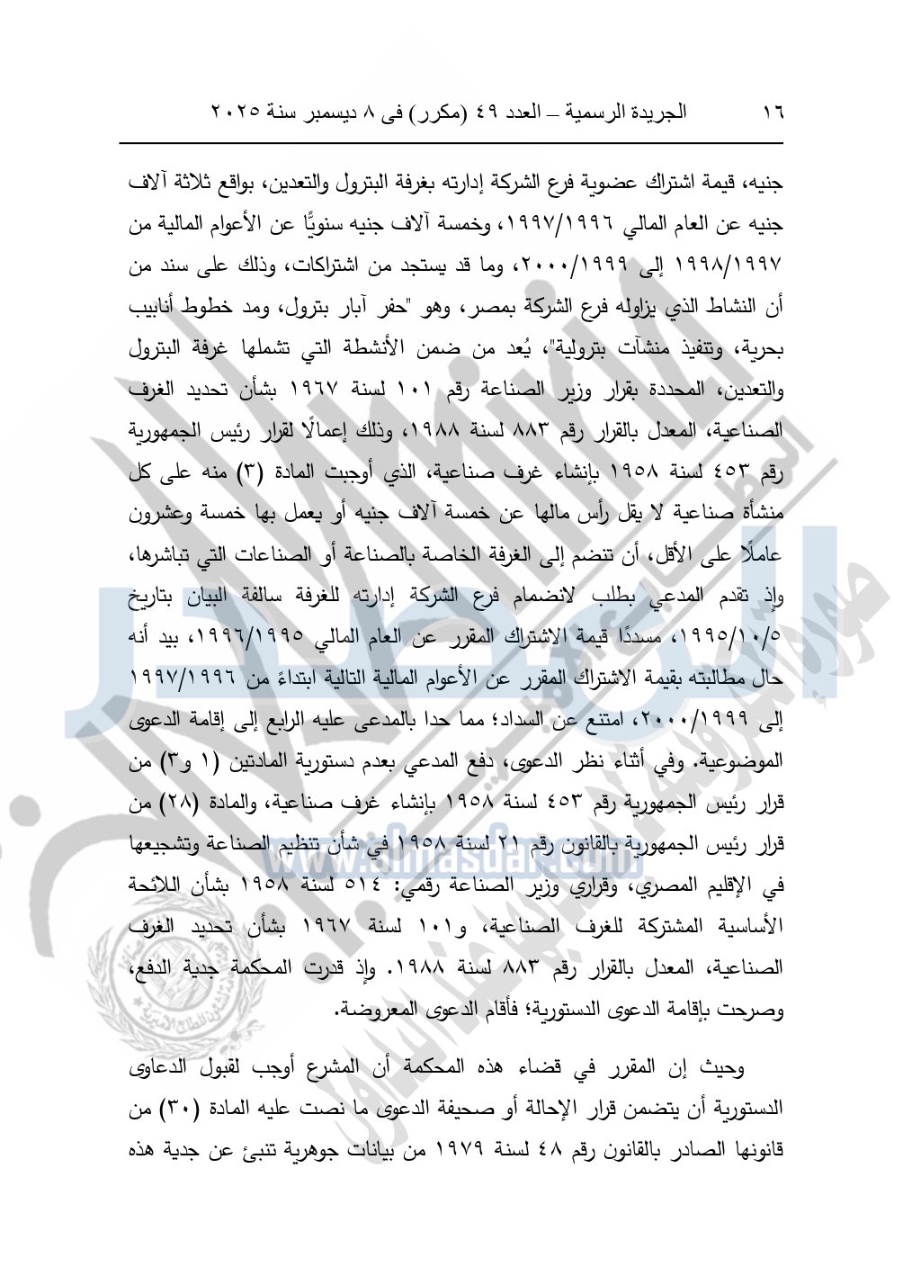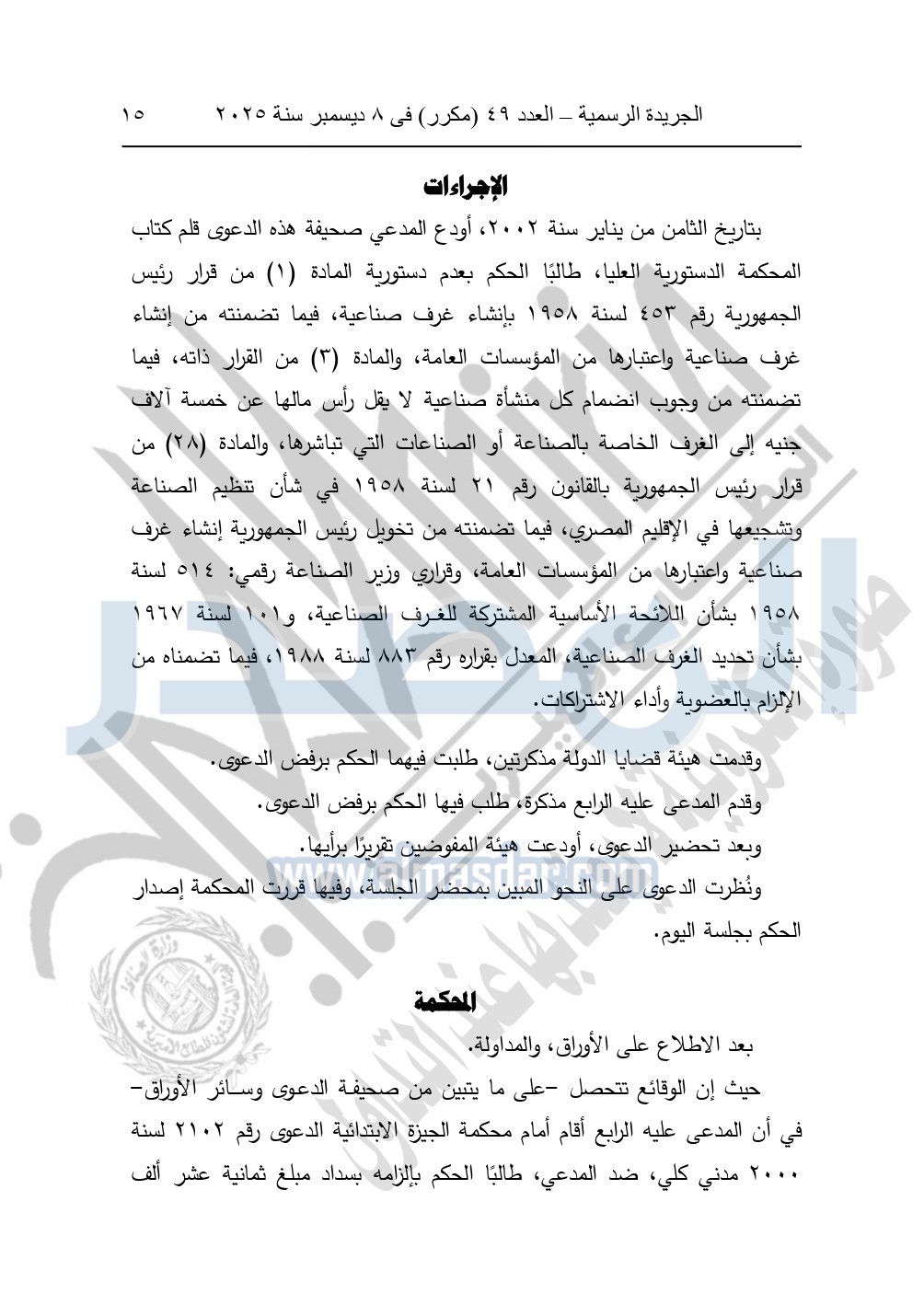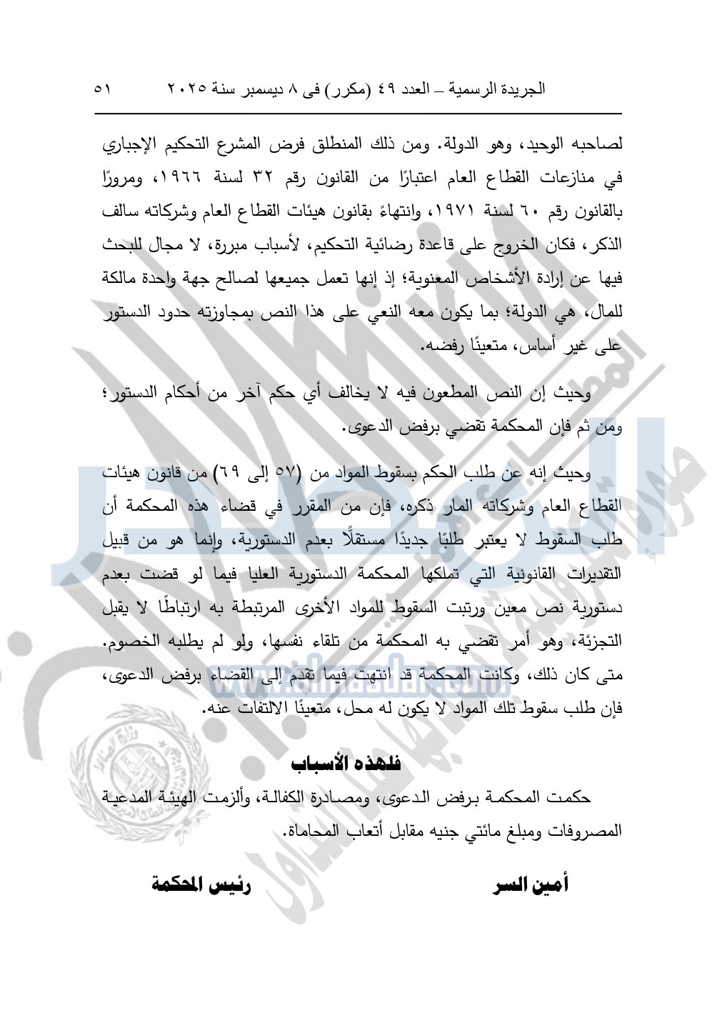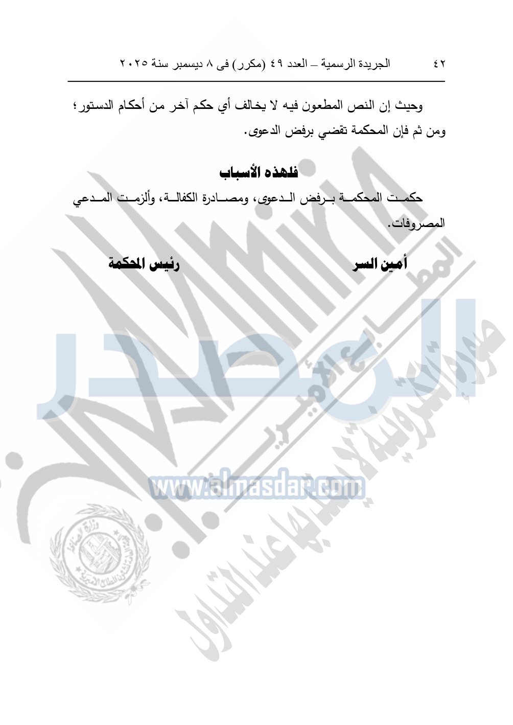 وأيضا نشرت الجريدة الرسمية في العدد 49 "مكرر"، في 6 أكتوبر سنة 2025، الأحكام الصادرة من المحكمة الدستورية العليا في عدد من الدعاوي القضائية بجلسة 6 ديسمبر 2025.