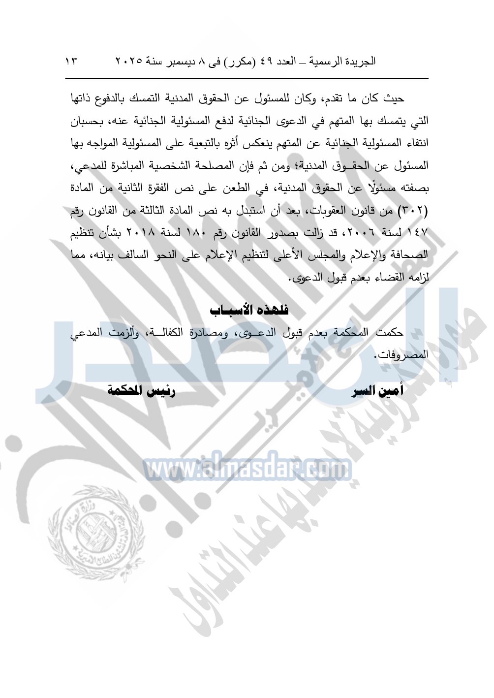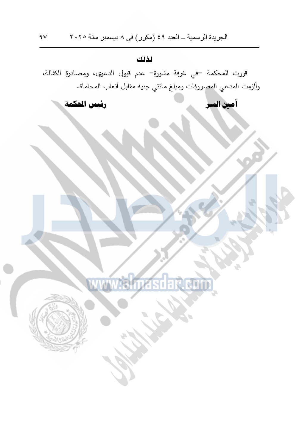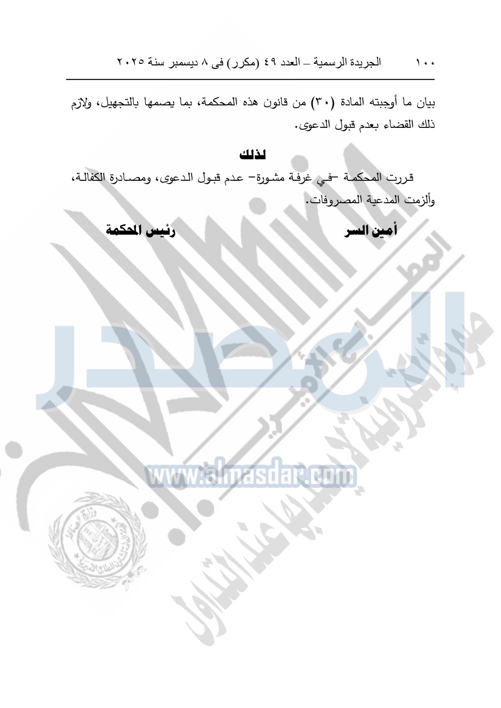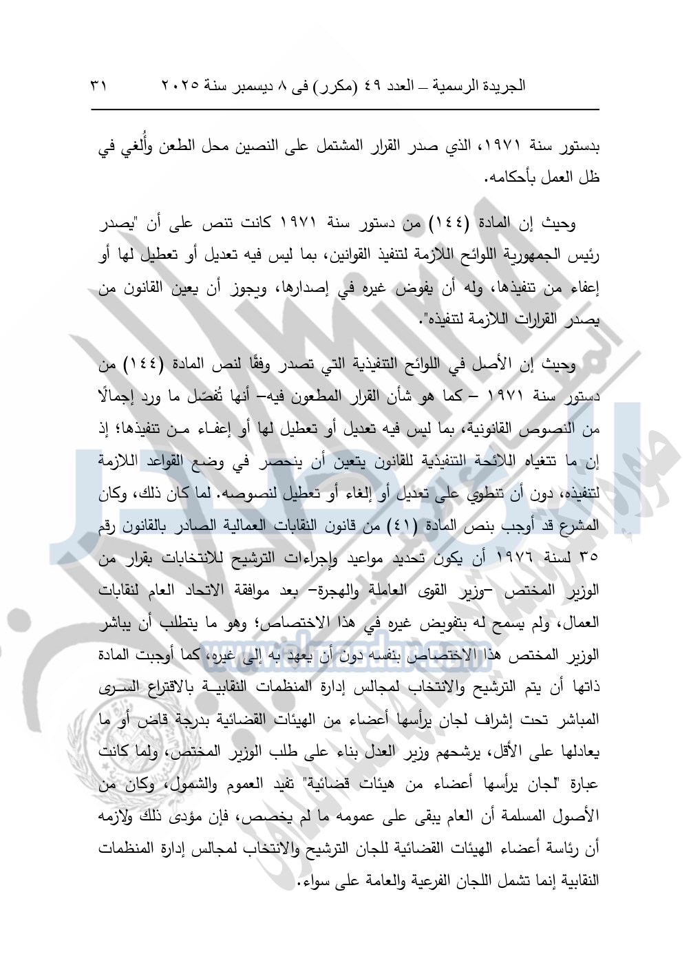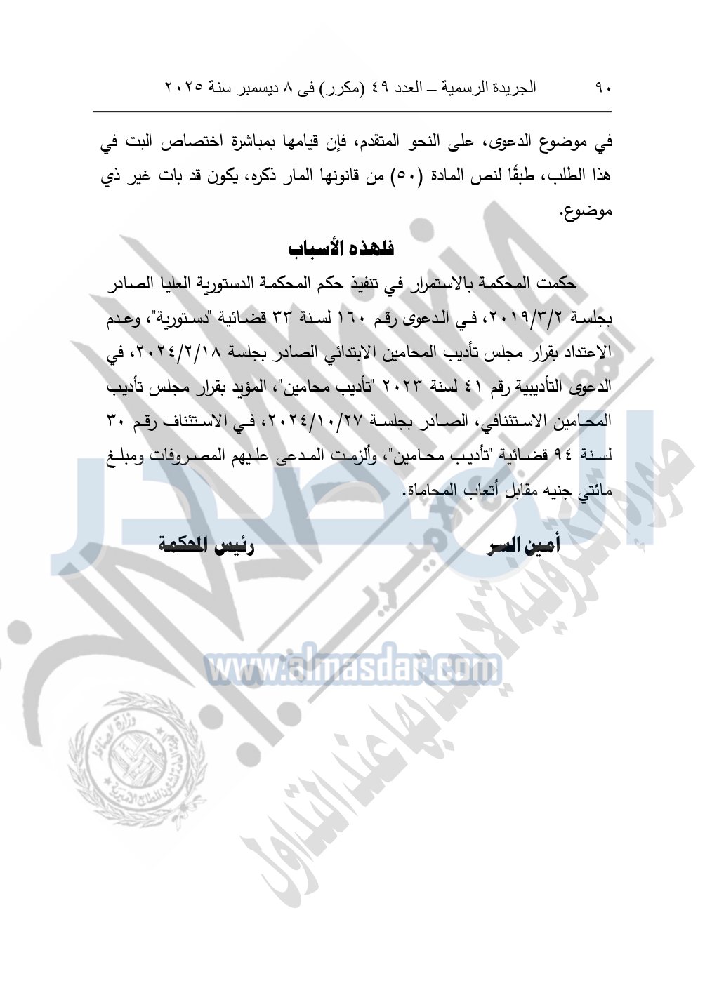 وأيضا نشرت الجريدة الرسمية في العدد 49 "مكرر"، في 6 أكتوبر سنة 2025، الأحكام الصادرة من المحكمة الدستورية العليا في عدد من الدعاوي القضائية بجلسة 6 ديسمبر 2025.