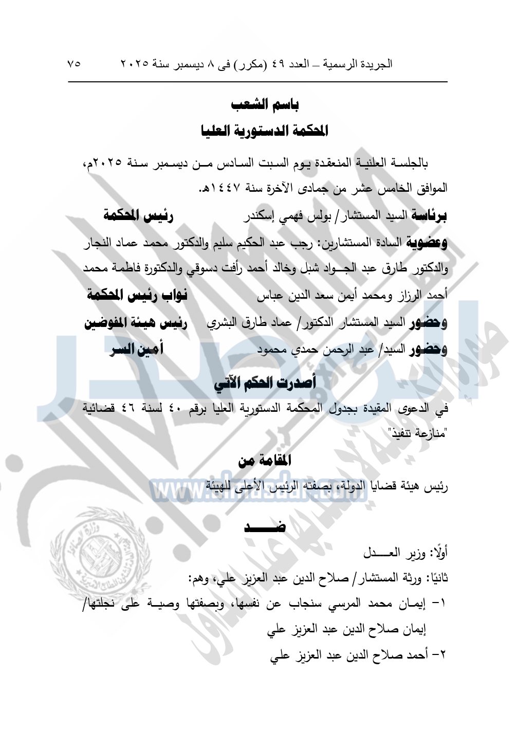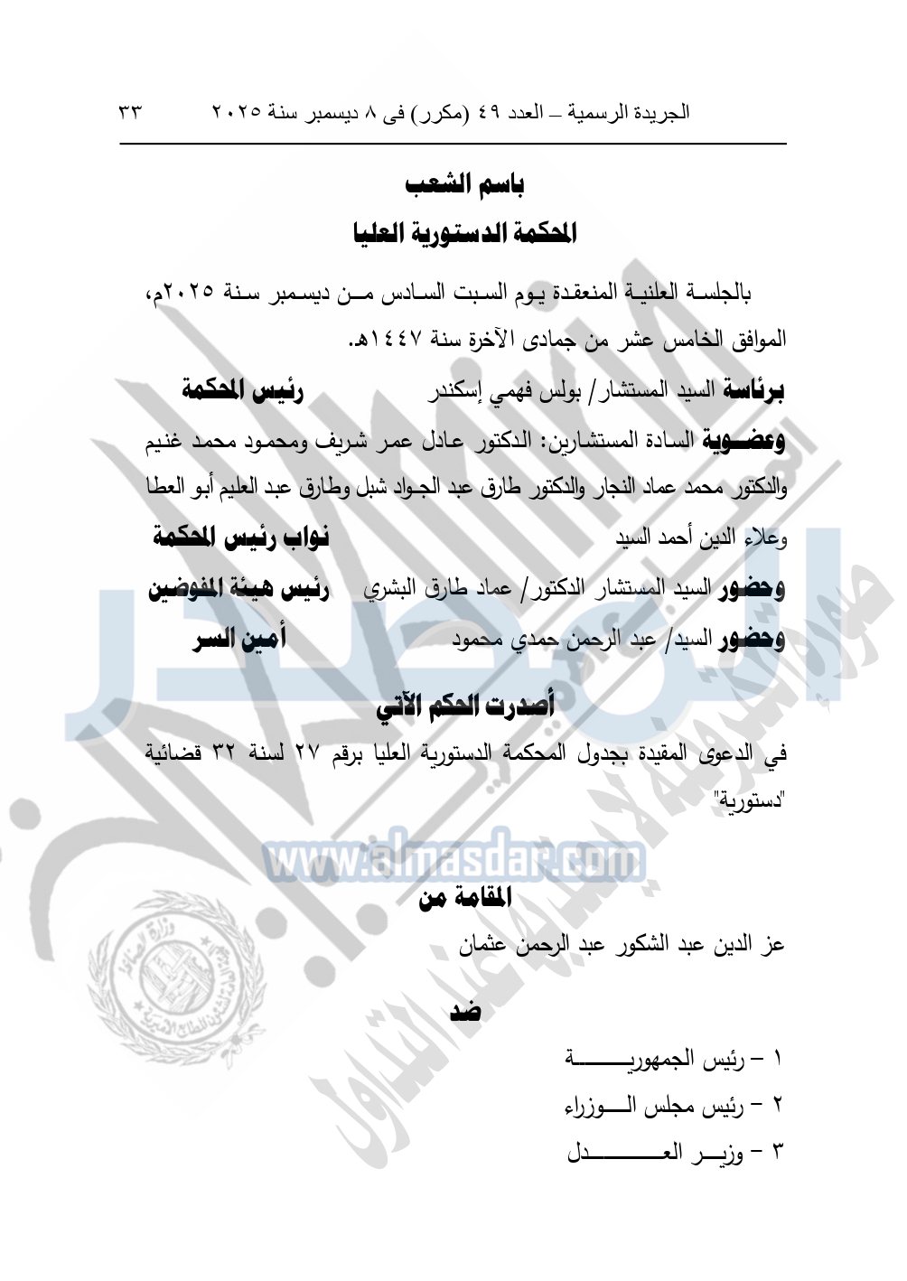 وأصدرت المحكمة الدستورية العليا حكمها في الدعوى المقامة من عز الدين عبد الشكور عبد الرحمن عثمان ضد كل من: