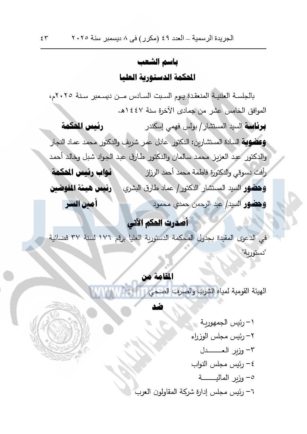 وأصدرت المحكمة الدستورية العليا حكمها في الدعوى المقامة من الهيئة القومية لمياه الشرب والصرف الصحي ضد كل من: