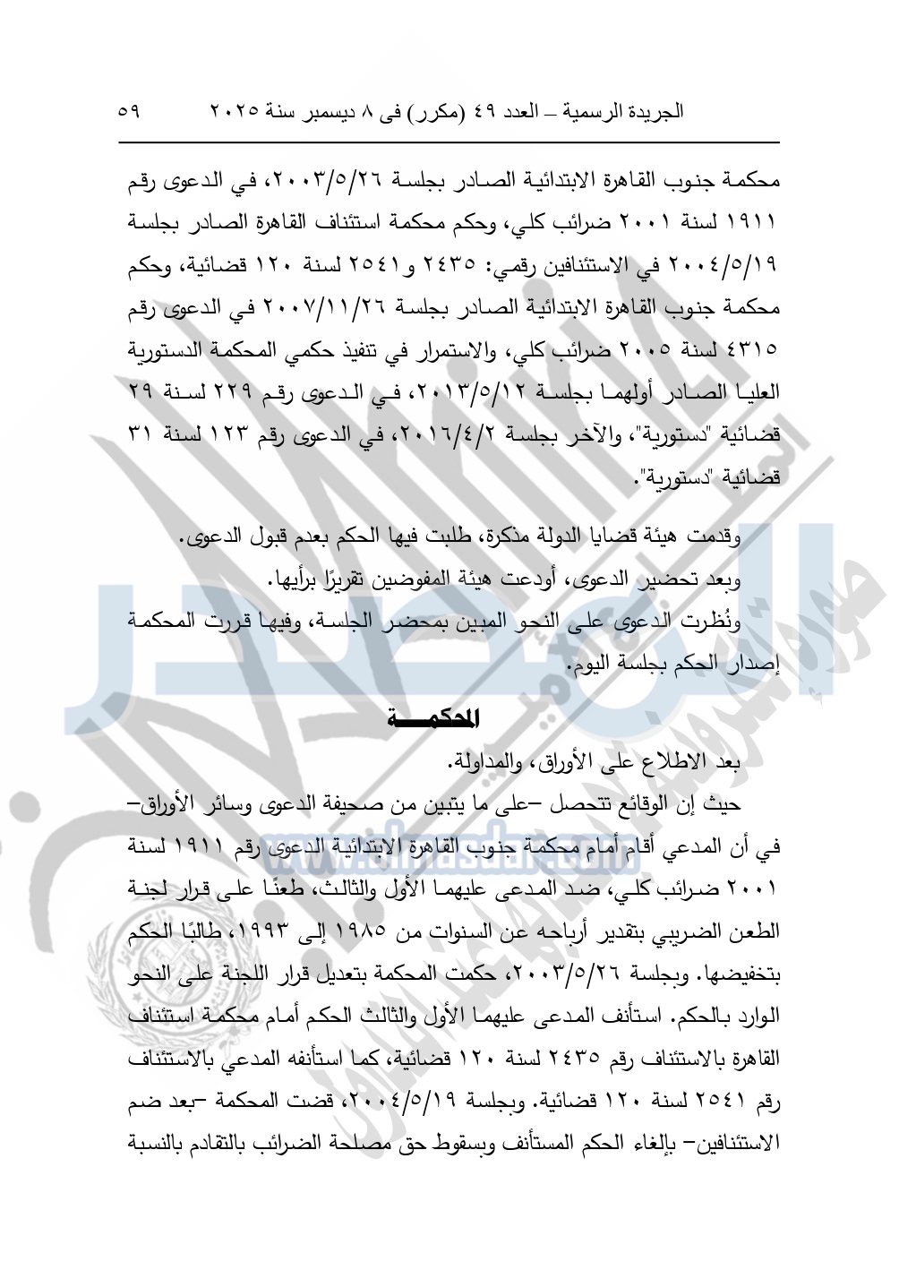 نشرت الجريدة الرسمية في العدد 49 "مكرر"، في 6 أكتوبر سنة 2025، الأحكام الصادرة من المحكمة الدستورية العليا في عدد من الدعاوي القضائية بجلسة 6 ديسمبر 2025.
