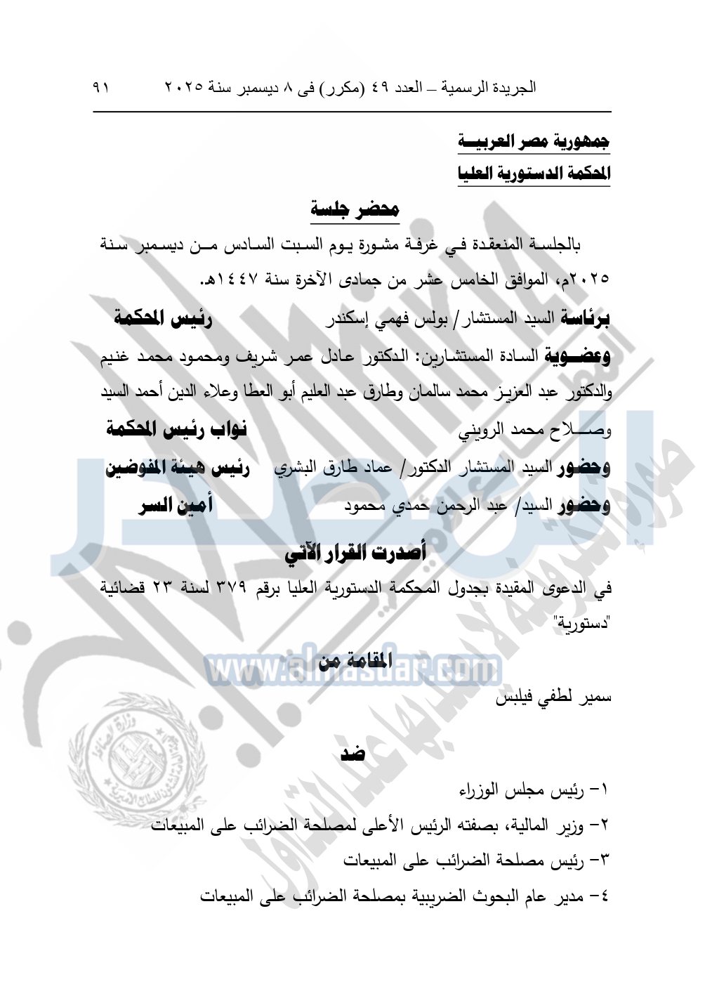 وأصدرت المحكمة الدستورية العليا حكمها في الدعوى المقامة من سمير لطفي فيلبس ضد كل من: