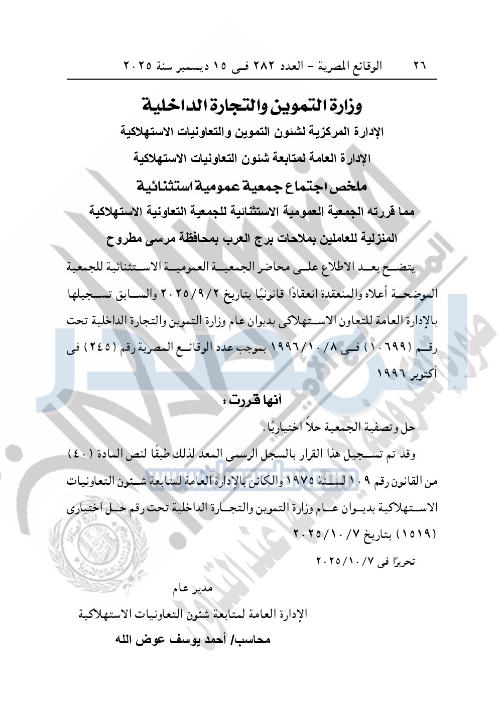 نشرت الوقائع المصرية في العدد 282، بتاريخ 15 ديسمبر 2025، قرار وزارة التموين والتجارة الداخلية، الإدارة المركزية لشئون التموين والتعاونيات الاستهلاكية، الإدارة العامة لمتابعة شئون التعاونيات الاستهلاكية، بشأن ملخص ملخص اجتماع جمعية عمومية استثنائية مما قررته الجمعية العمومية الاستثنائية للجمعية التعاونية الاستهلاكية المنزلية للعاملين بملاحات برج العرب بمحافظة مرسى مطروح.