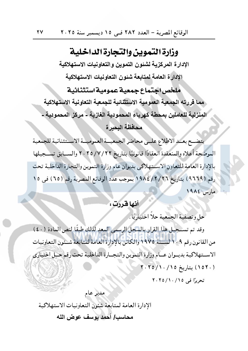 كما نشرت الوقائع المصرية في العدد 282، بتاريخ 15 ديسمبر 2025، قرار وزارة التموين والتجارة الداخلية، الإدارة المركزية لشئون التموين والتعاونيات الاستهلاكية، الإدارة العامة لمتابعة شئون التعاونيات الاستهلاكية، بشأن ملخص ملخص اجتماع جمعية عمومية استثنائية مما قررته الجمعية العمومية الاستثنائية للجمعية التعاونية الاستهلاكية المنزلية للعاملين بمحطة كهرباء المحمودية الغازية - مركز المحمودية - محافظة البحيرة.