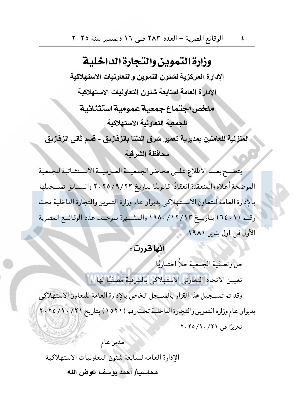 وايضا نشرت الوقائع المصرية في العدد 283، بتاريخ 16 ديسمبر 2025، قرار وزارة التموين والتجارة الداخلية، الإدارة المركزية لشئون التموين والتعاونيات الاستهلاكية، الإدارة العامة لمتابعة شئون التعاونيات الاستهلاكية، بشأن ملخص ملخص اجتماع جمعية عمومية استثنائية للجمعية التعاونية الاستهلاكية المنزلية للعاملين بمديرية تعمير شرق الدلتا بالزقازيق - قسم ثاني الزقازيق محافظة الشرقية.