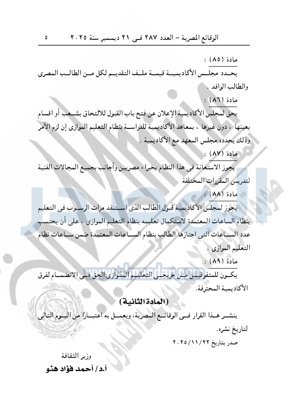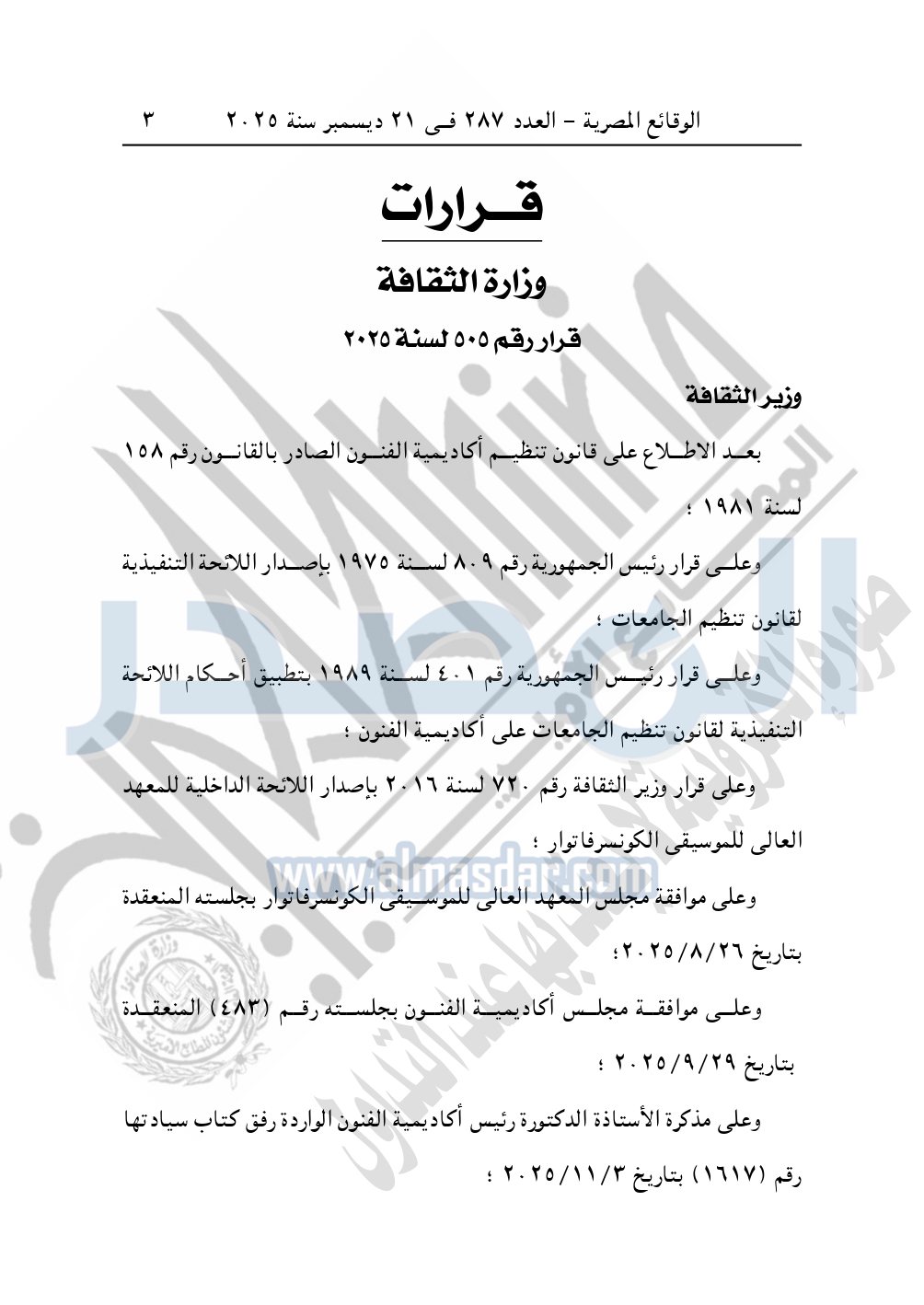 نشرت الوقائع المصرية في العدد 287، بتاريخ 21 ديسمبر 2025، قرار وزارة الثقافة، قرار رقم 505 لسنة 2025، بشأن تعديل اللائحة الداخلية للمعهد العالي للموسيقى الكونسرفاتوار.