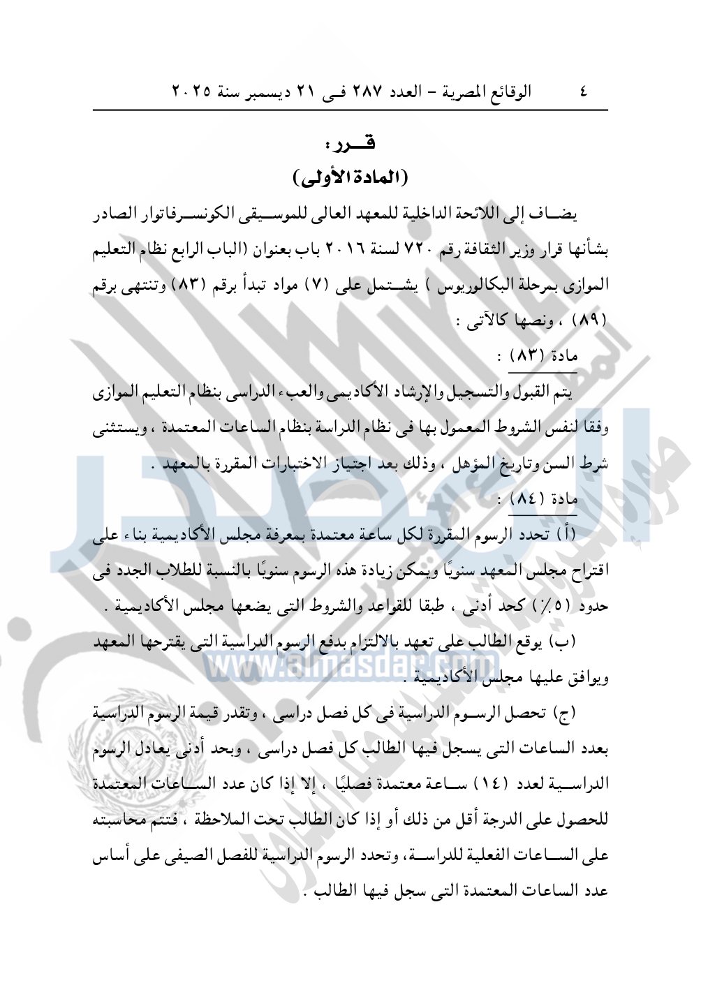 يضاف إلى اللائحة الداخلية للمعهد العالي للموسيقى الكونسرفاتوار الصادر بشأنها قرار وزير الثقافة رقم 720 لسنة 2016 باب بعنوان "الباب الرابع نظام التعليم الموازي بمرحلة البكالوريوس" يشتمل على "7" مواد تبدأ برقم "83" وتنتهى برقم "89"، ونصها كالآتى:
