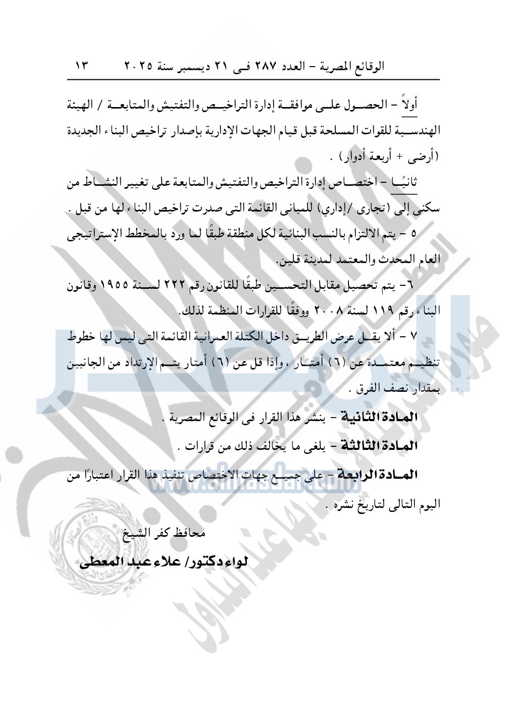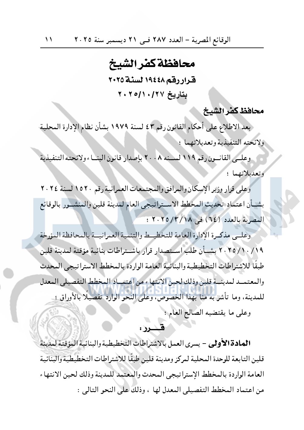 نشرت الوقائع المصرية في العدد 287، بتاريخ 21 ديسمبر 2025، قرار محافظة كفر الشيخ، قرار رقم 19448 لسنة 2025، بتاريخ 27-10-2025، بشأن إعتماد الاشتراطات البنائية المؤقتة لمدينة قلين بمحافظة كفر الشيخ.