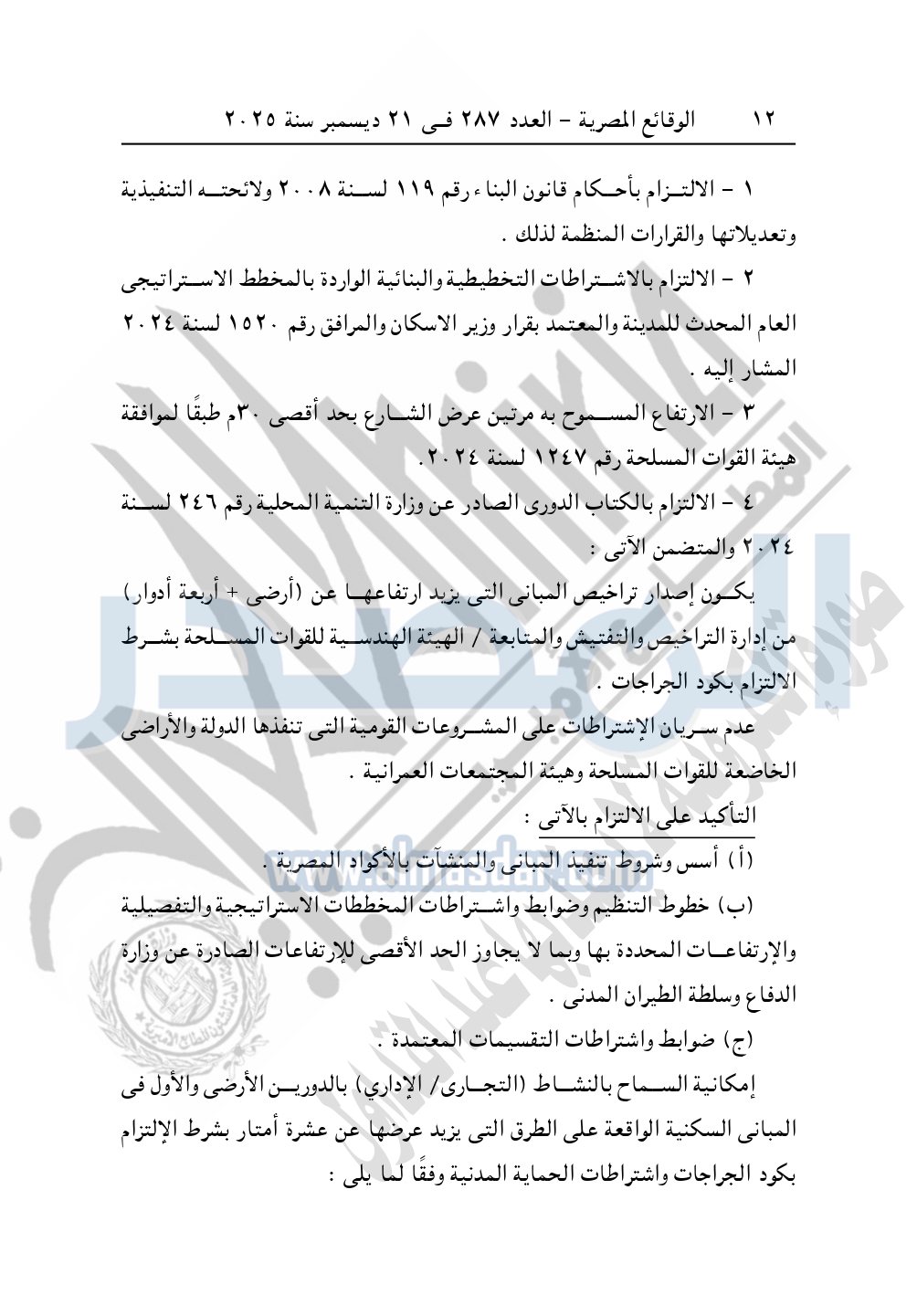 3- الارتفاع المسموح به مرتين عرض الشارع بحد أقصى 30م طبقا لموافقة هيئة القوات المسلحة رقم 1247 لسنة 2024.