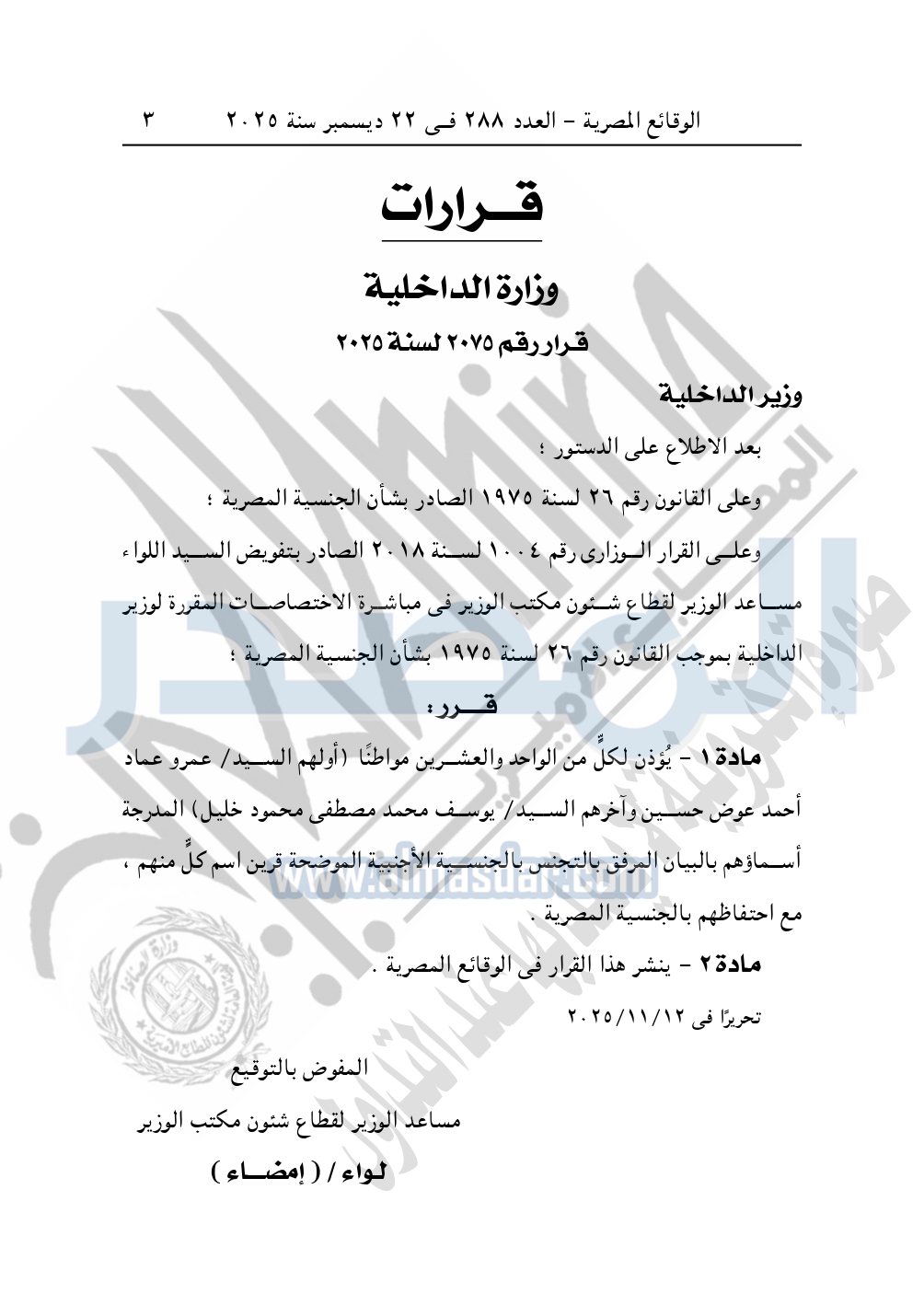 كما نشرت الوقائع المصرية في العدد 288 الصادر في 22 ديسمبر سنة 2025، قرار وزارة الداخلية، رقم 2090 لسنة 2025، بشأن الإذن للواحد والعشرين مواطن بالحصول على الجنسية الأجنبية مع احتفاظهم بالجنسية المصرية.