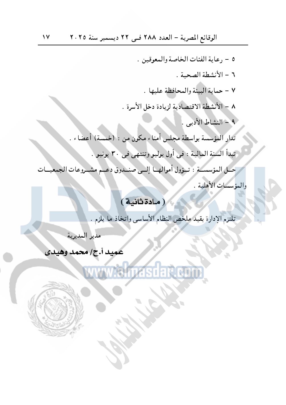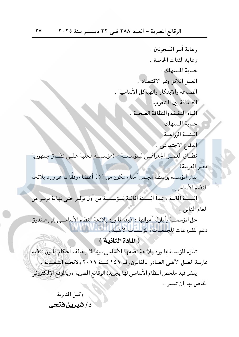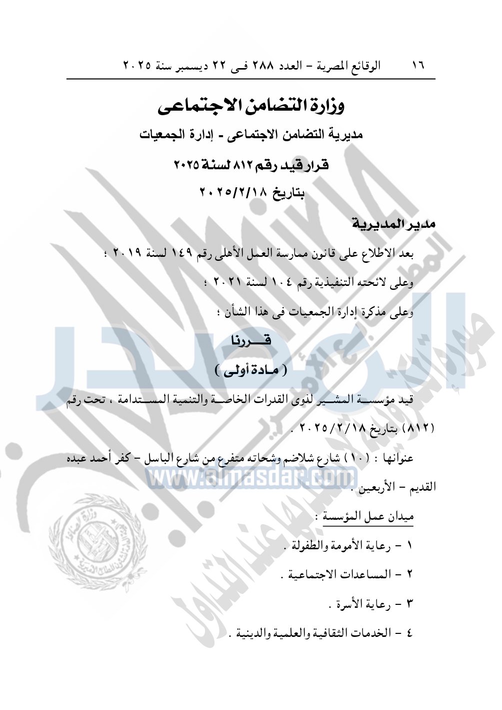 نشرت الوقائع المصرية في العدد 288، بتاريخ 22 ديسمبر 2025، قرار وزارة التضامن الاجتماعي، قيد 812 لسنة 2025، بتاريخ 18-2-2025، بشأن قيد مؤسسة المشير لذوى القدرات الخاصة والتنمية المستندامة.