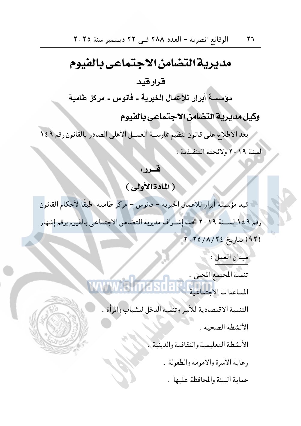 وأيضا نشرت الوقائع المصرية في العدد 288، بتاريخ 22 ديسمبر 2025، مديرية التضامن الاجتماعي بالفيوم، بشأن قيد مؤسسة أبرار للأعمال الخيرية – فانونس – مركز طامية.