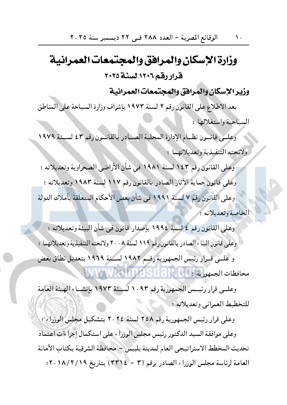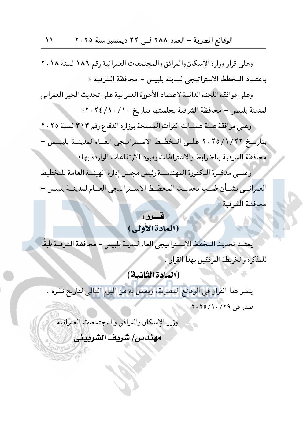 نشرت الوقائع المصرية في العدد 288، بتاريخ 22 ديسمبر 2025، قرار وزارة الإسكان والمرافق والمجتمعات العمرانية، رقم 1206 لسنة 2025، بشأن إعتماد تحديث المخطط الاستراتيجى العام لمدينة بلبيس – محافظة الشرقية.