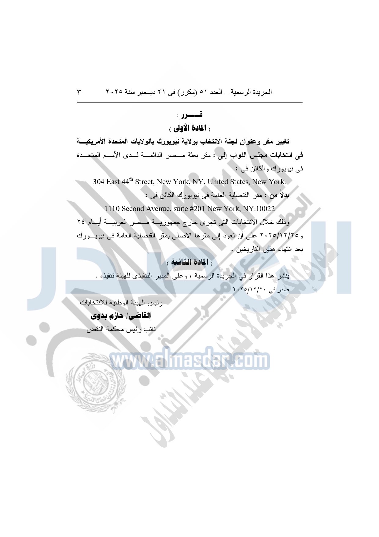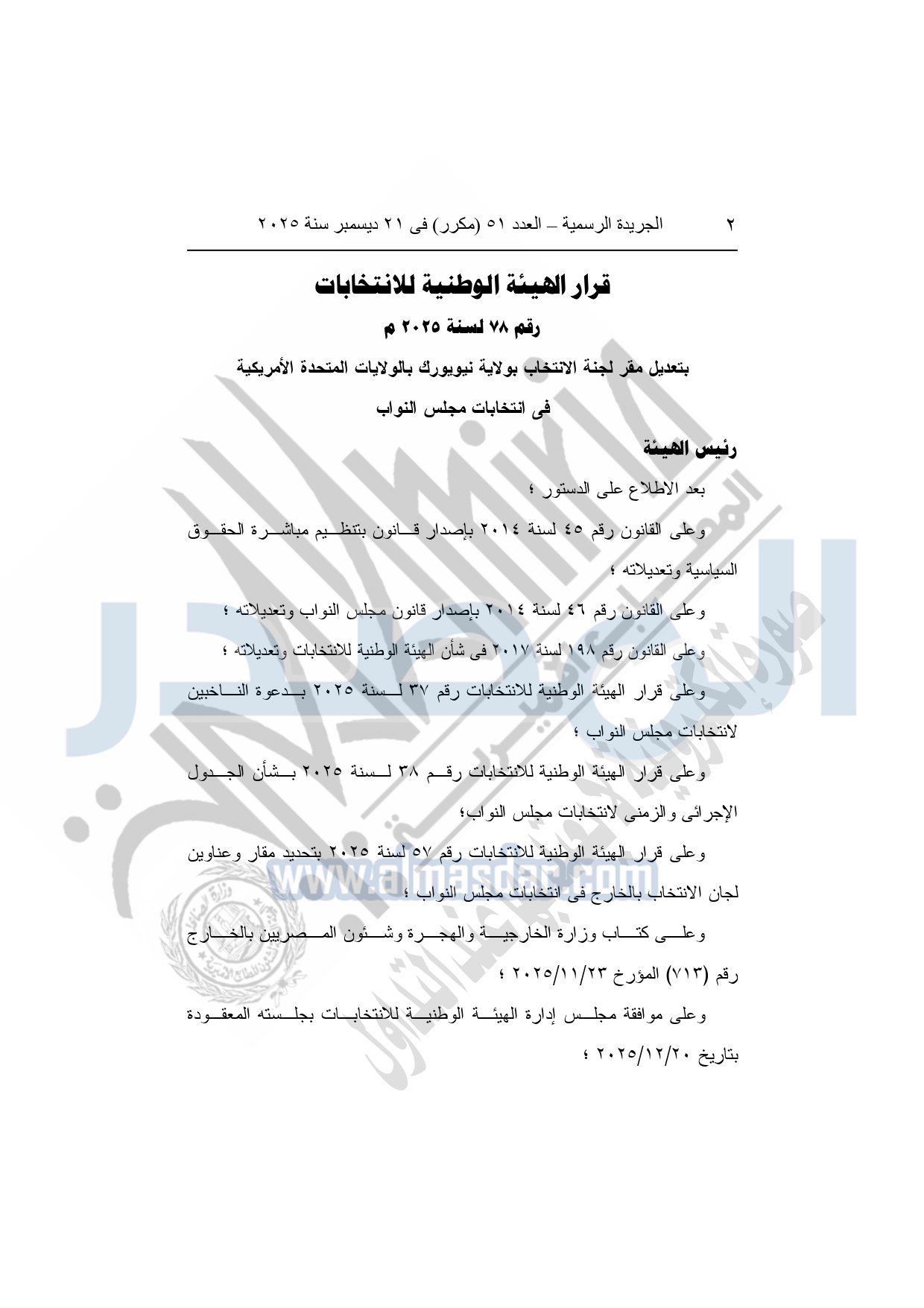 نشرت الجريدة الرسمية، في العدد 51 "مكرر"، الصادر في 21 ديسمبر سنة 2025، قرار الهيئة الوطنية للانتخابات، رقم 78 لسنة 2025م، بشأن تعديل مقر لجنة الانتخاب بولاية نيويورك بالولايات المتحدة الأمريكية في انتخابات مجلس النواب.