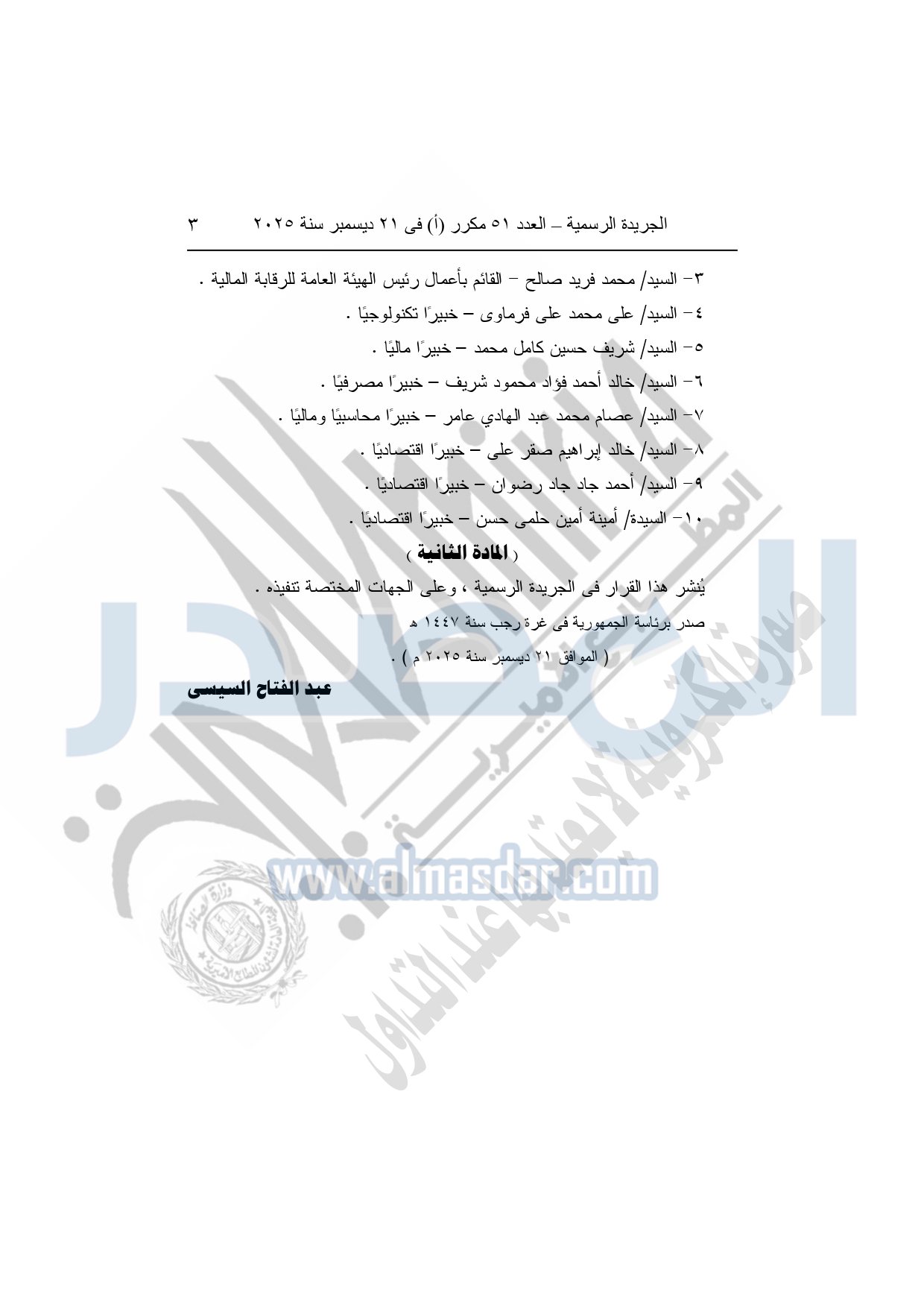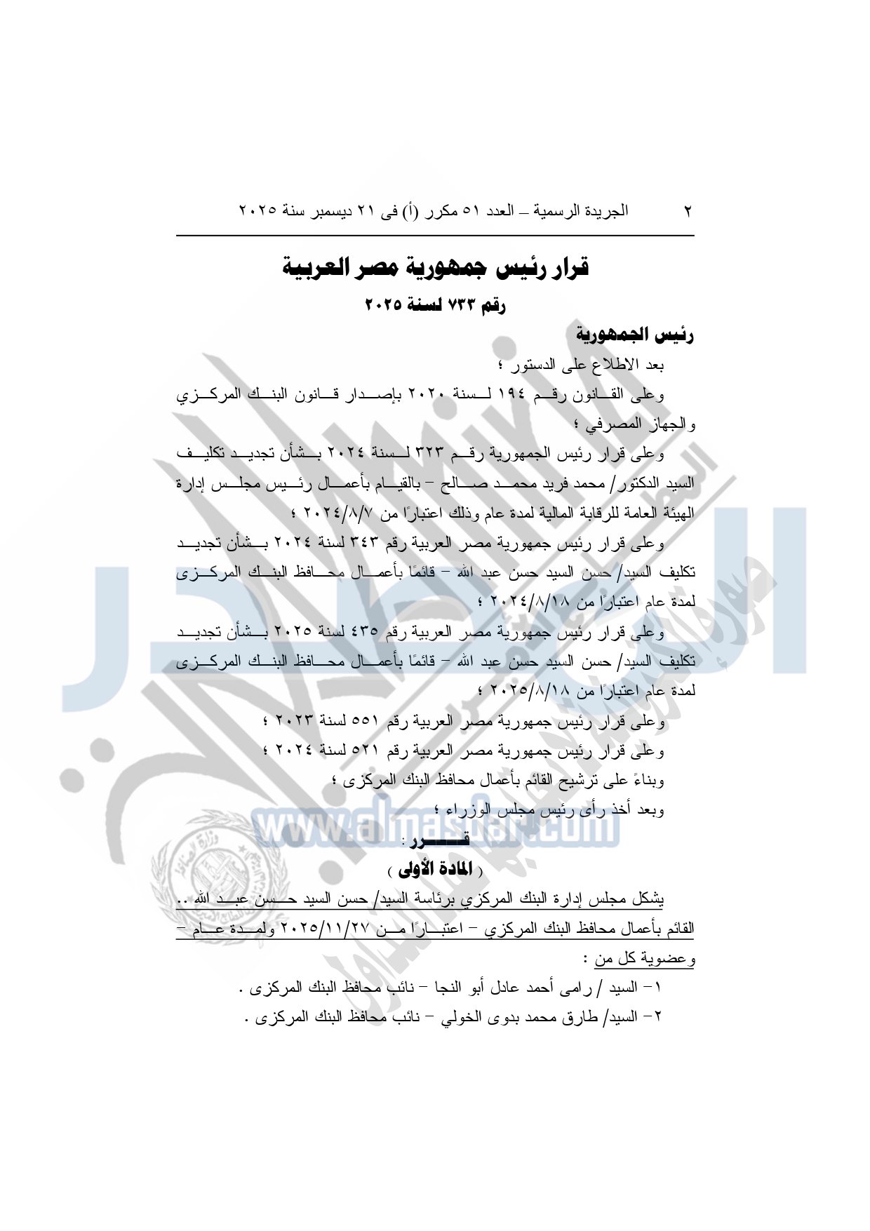 يشكل مجلس إدارة البنك المركزي برئاسة حسن السيد حسن عبد الله .. القائم بأعمال محافظ البنك المركزي - اعتباراً من 27-11-2025 ولمدة عام - وعضوية كل من: