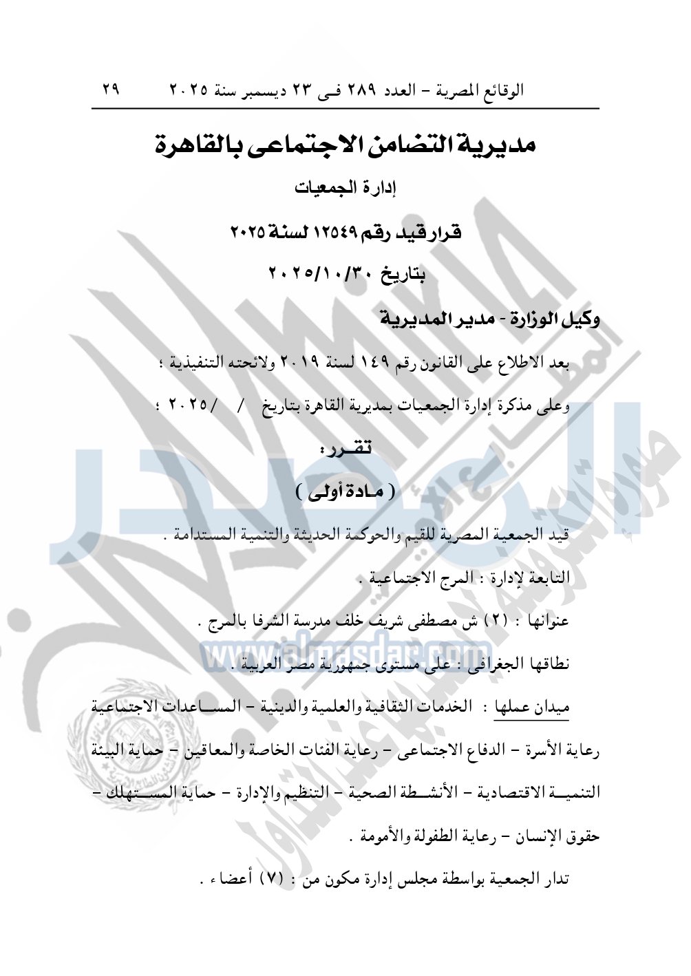 كما نشرت الوقائع المصرية في العدد 289، بتاريخ 23 ديسمبر 2025، قرار مديرية التضامن الاجتماعي بالقاهرة، قيد 12549 لسنة 2025، بتاريخ 30-10-2025، بشأن قيد الجمعية المصرية للقيم والحوكمة الحديثة والتنمية المستدامة.